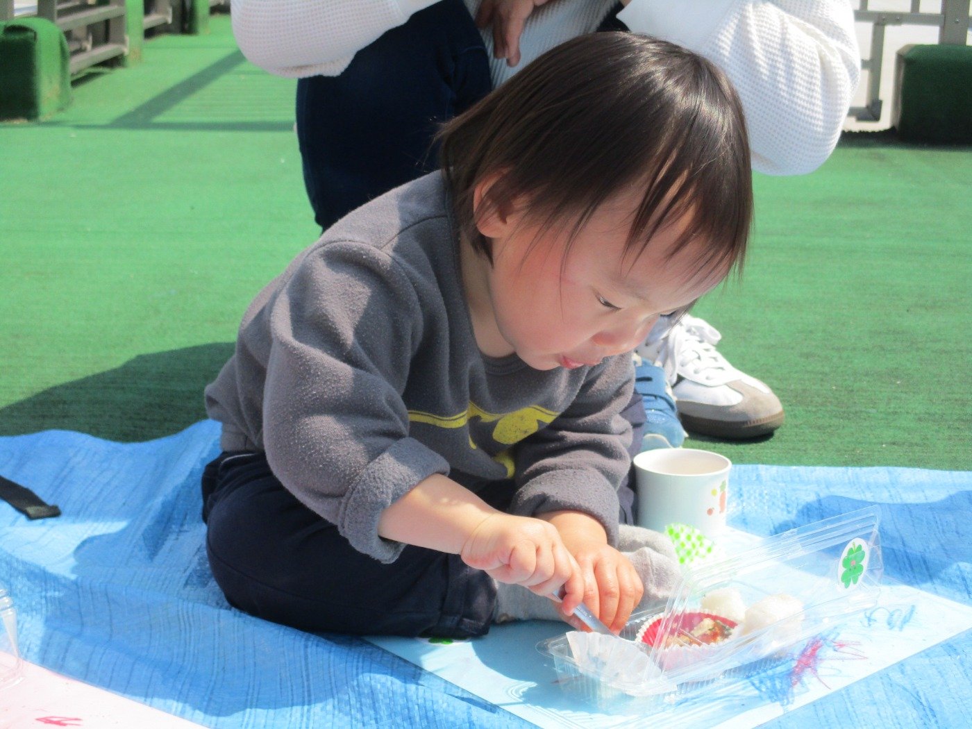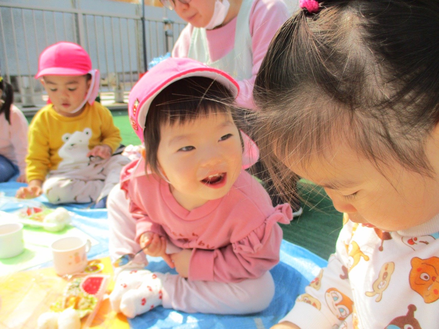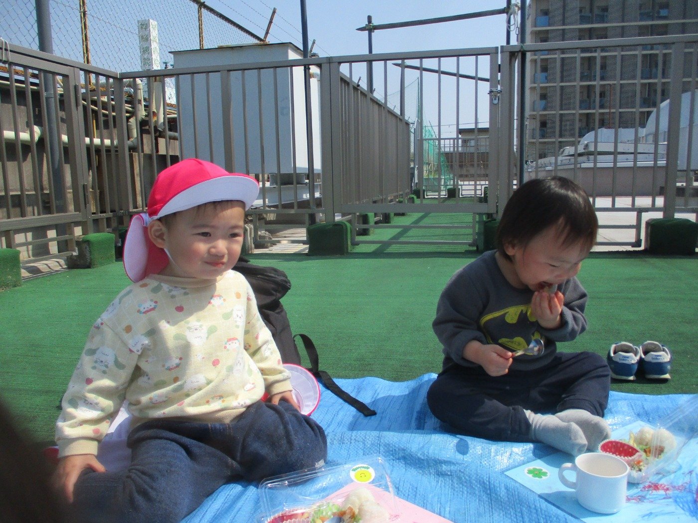 今日は風は少しありましたが上着がいらないくらいのあたたかさになったので、うさぎ組さんは戸外でお昼ご飯を食べました。