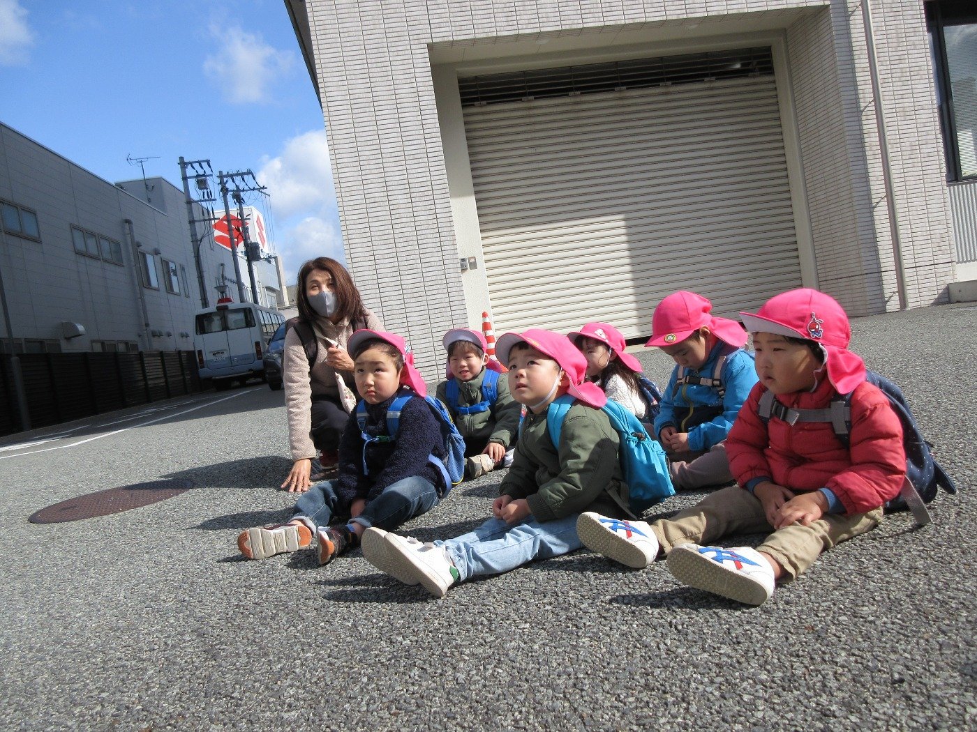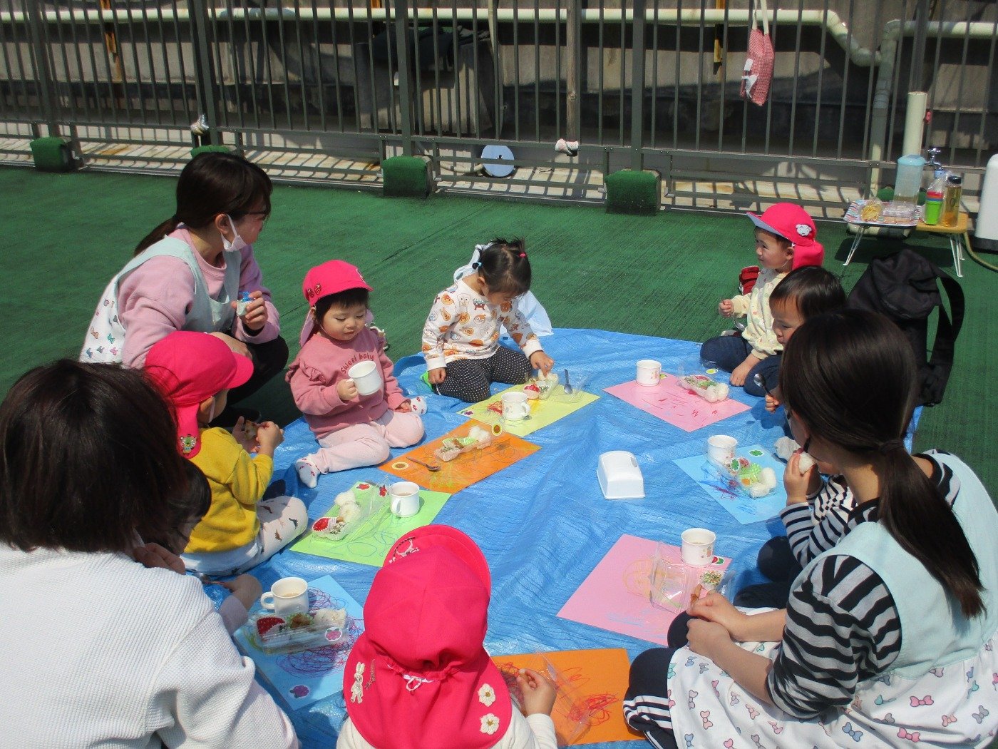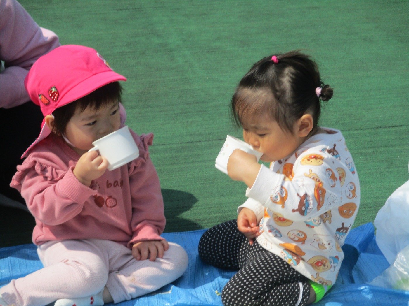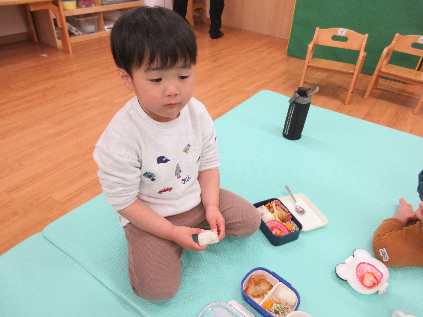 今日は風は少しありましたが上着がいらないくらいのあたたかさになったので、うさぎ組さんは戸外でお昼ご飯を食べました。