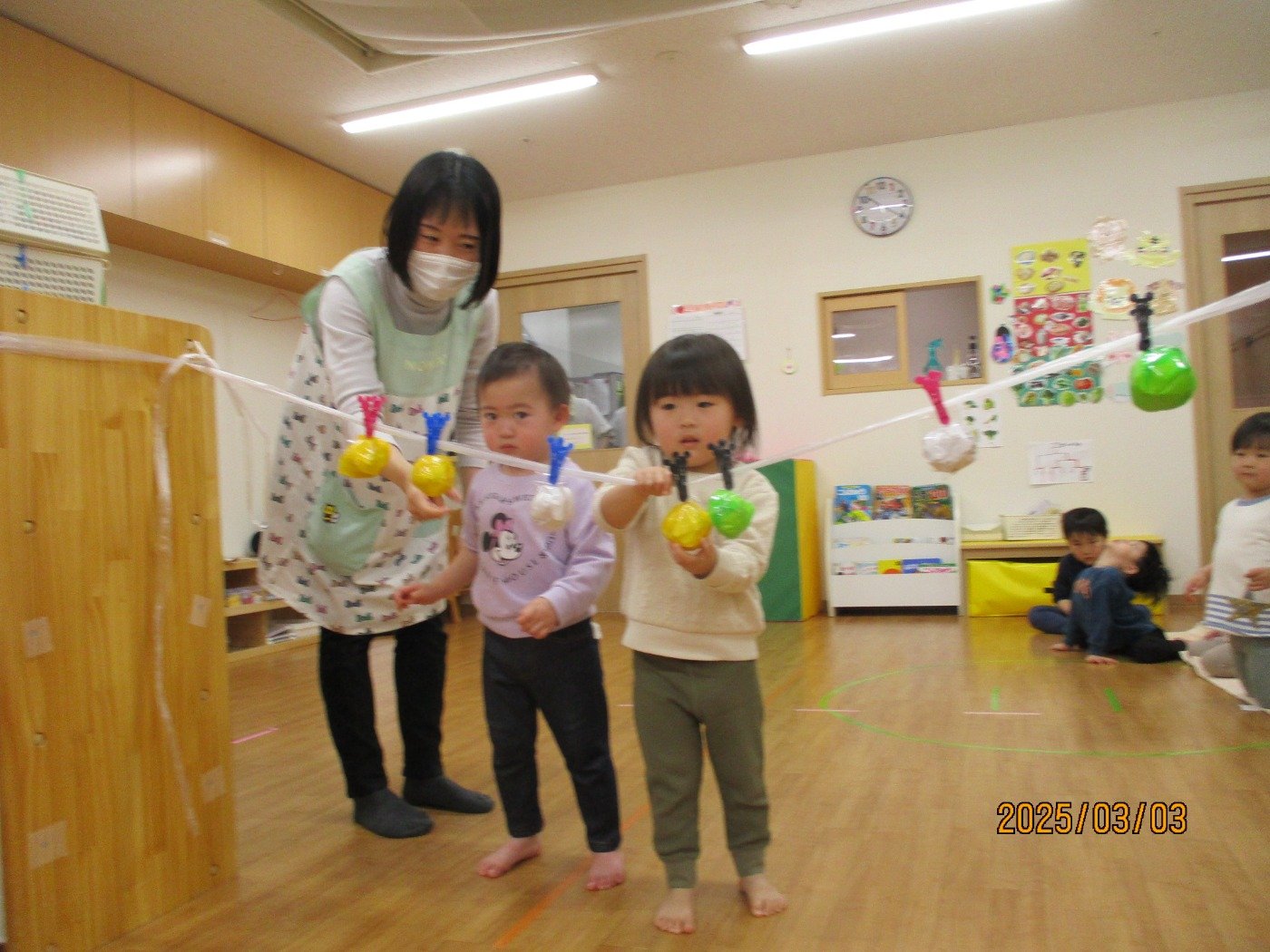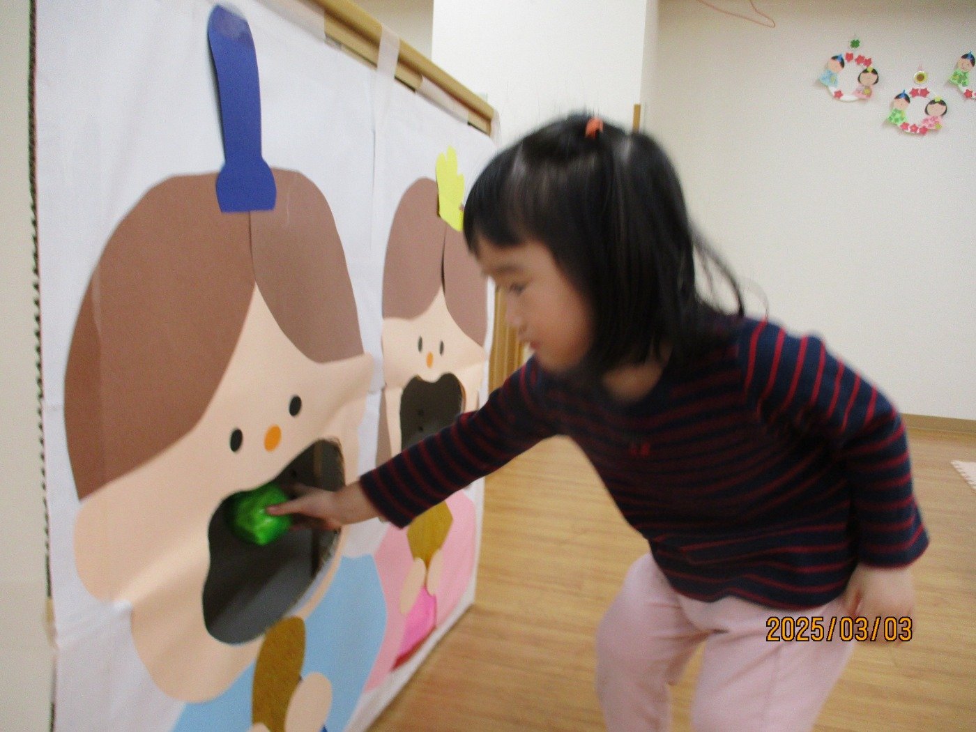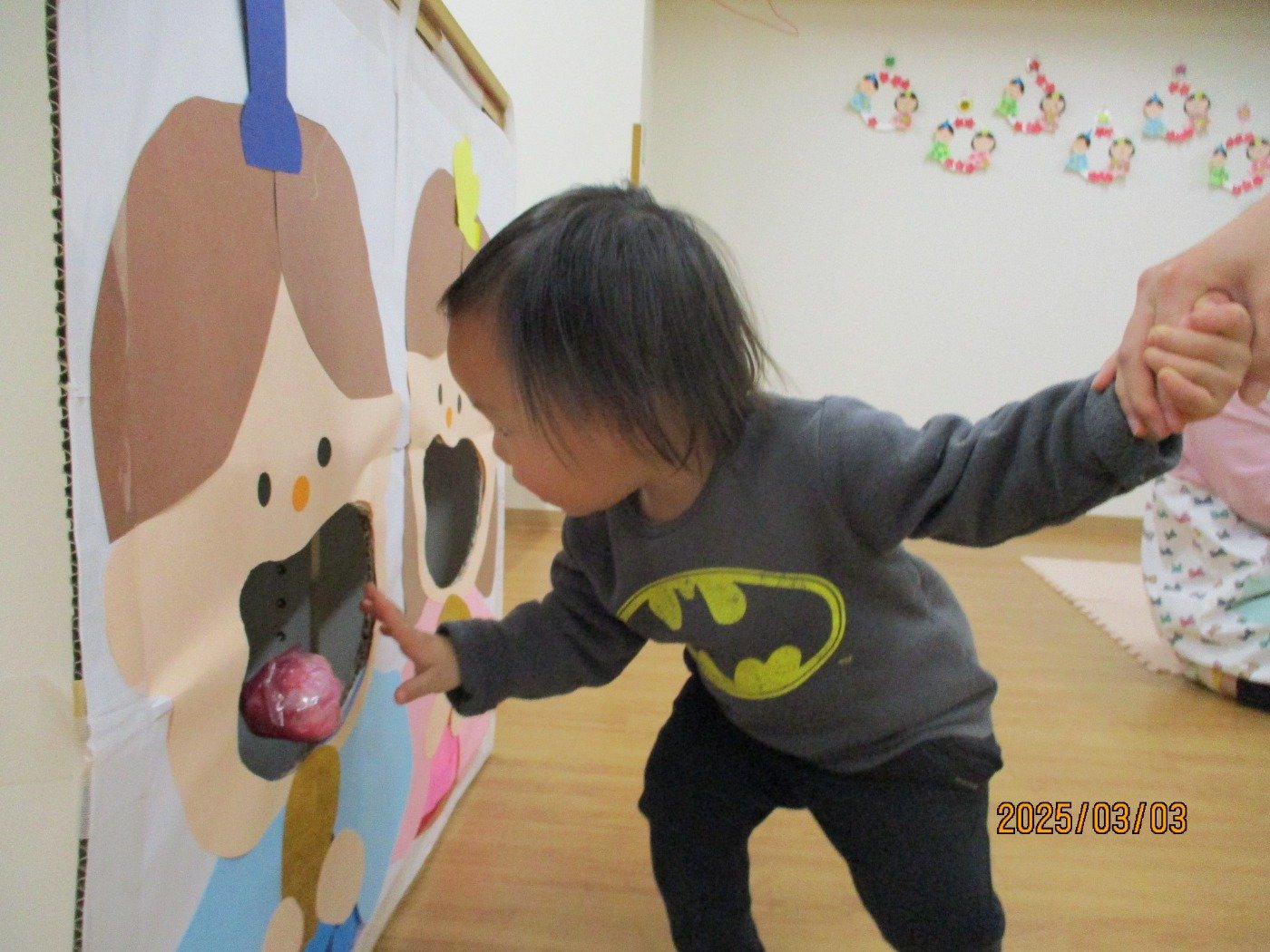みんな興味津々で話をきいたり、洗濯ばさみで挟んであったひなあられを「えい!」と引っ張り、お雛様たちのお口に「どうぞ!」と上手に運んでいましたよ。