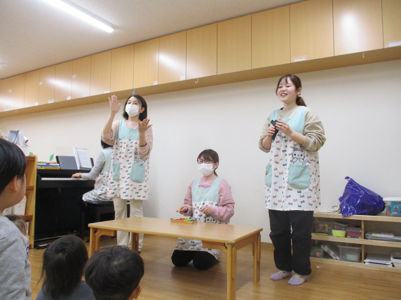お話しの後は・・・保育者がいろんな楽器を演奏し「おもちゃのチャチャチャ」を子ども達と一緒に歌いました。