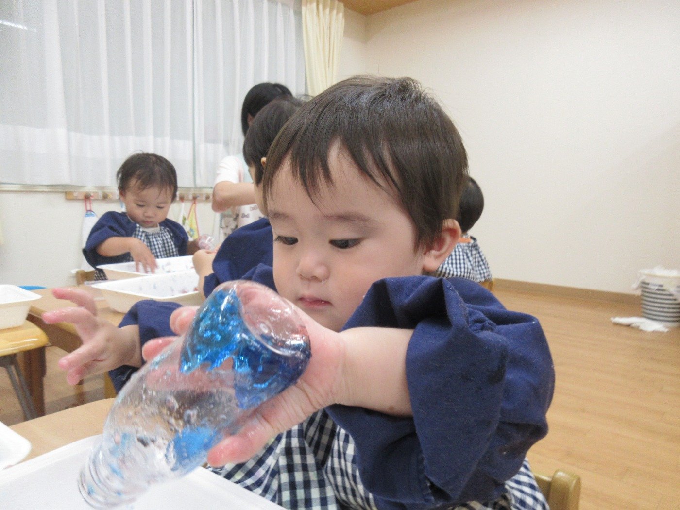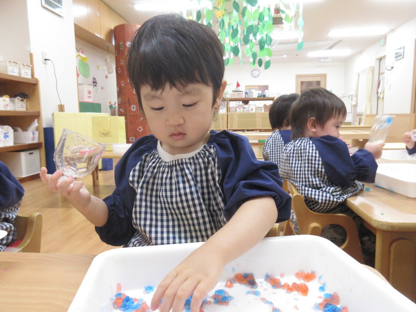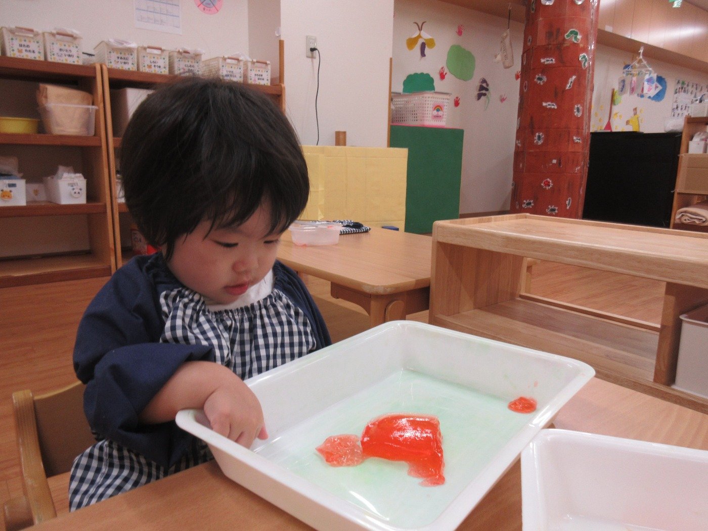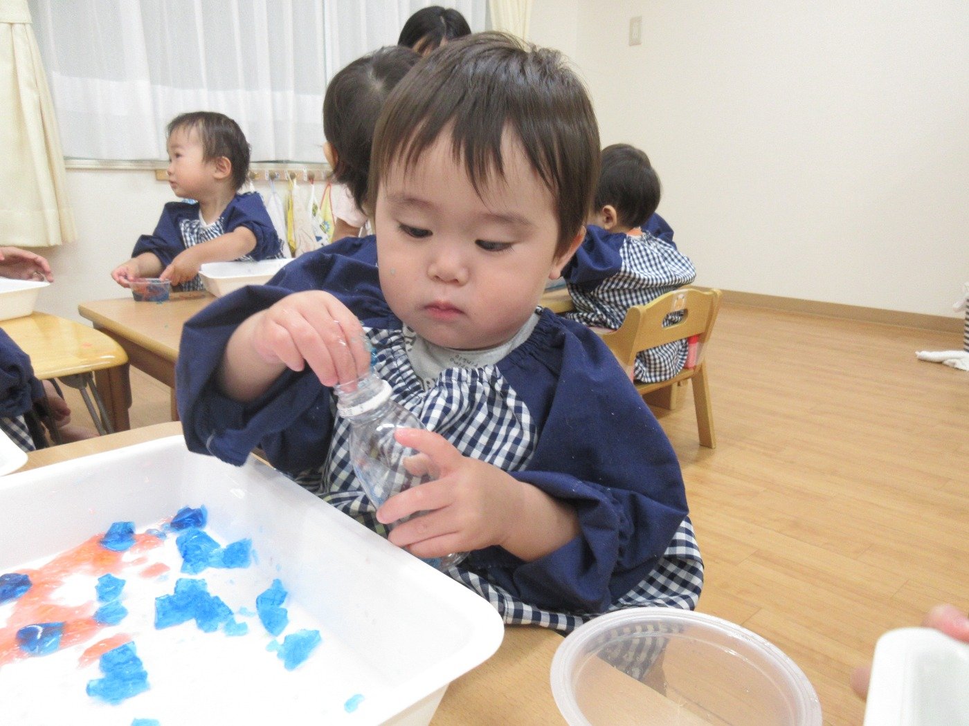 容器を渡してみると、なんと寒天をつまみながら入れ物の中に入れ始めました。小さい穴に少しずつ入れ、いっぱいになると逆さにしてフリフリしては寒天をだして・・・何度も繰り返し試しながら遊びこむ姿がとても素敵ですね。