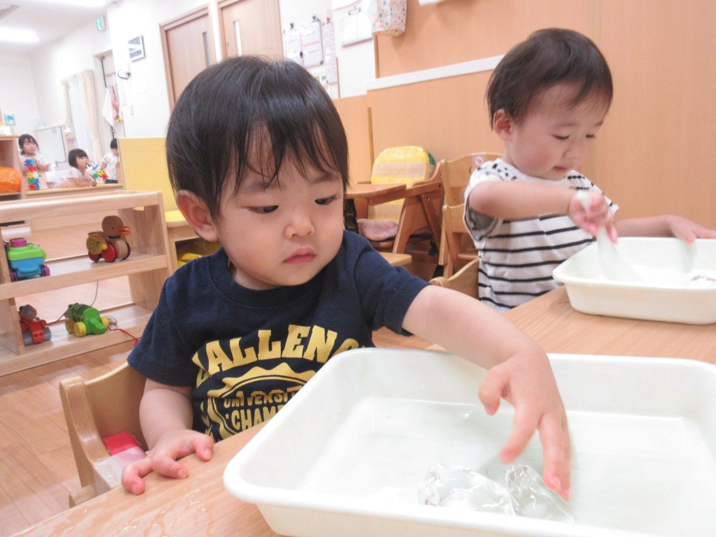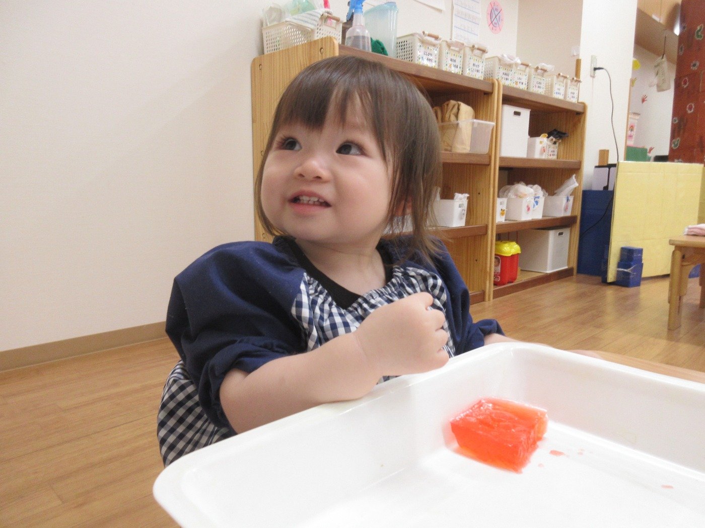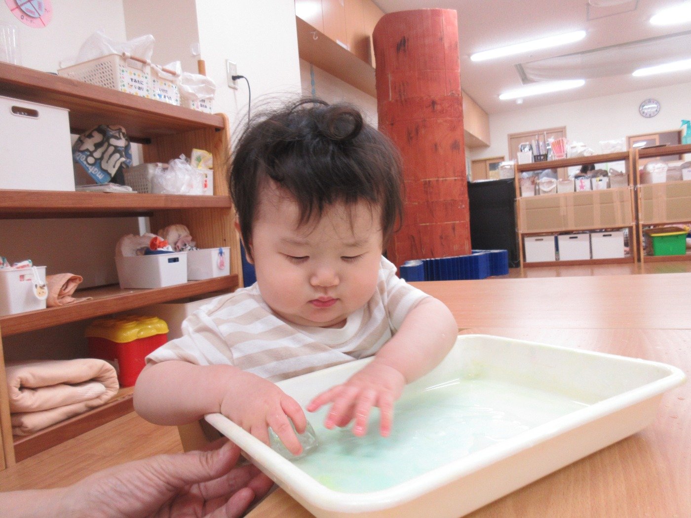 ダイナミックに両手で握ってみたり、ひんやり感を味わうかのようにじーっと寒天に手をつけてみたり。