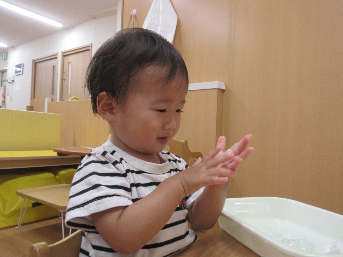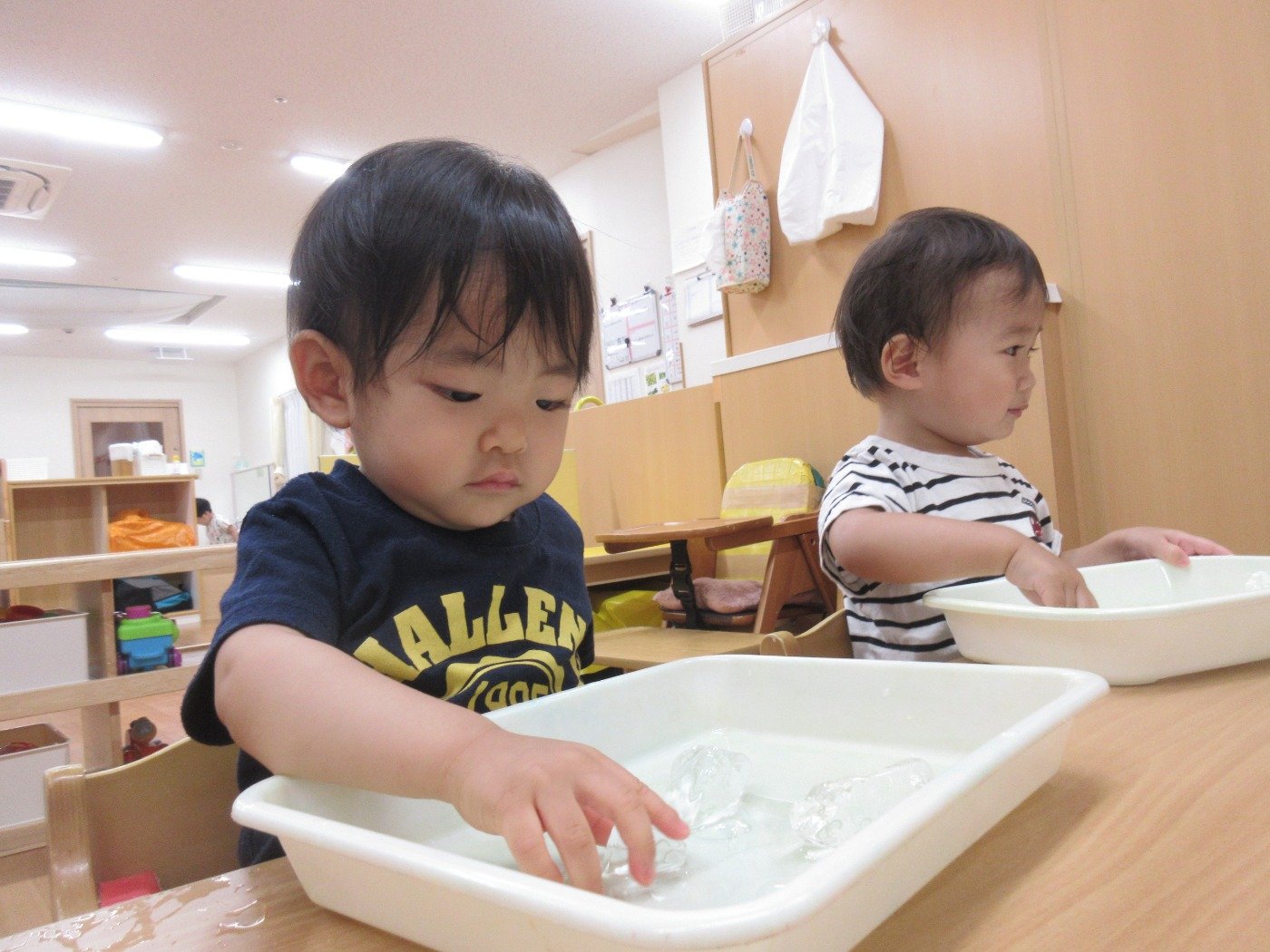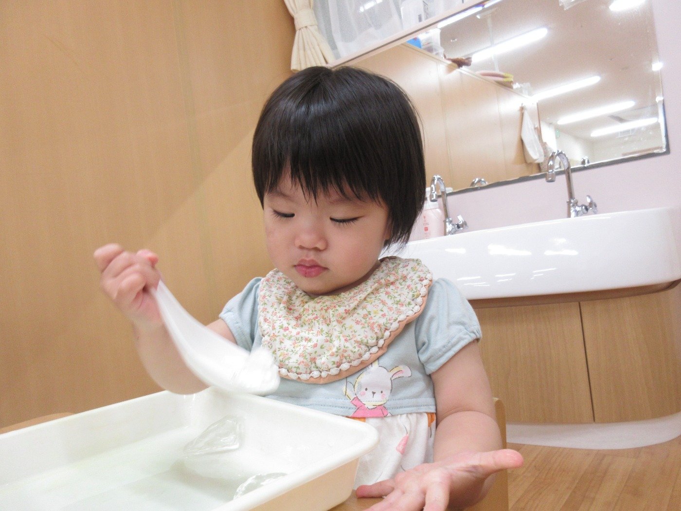 ダイナミックに両手で握ってみたり、ひんやり感を味わうかのようにじーっと寒天に手をつけてみたり。