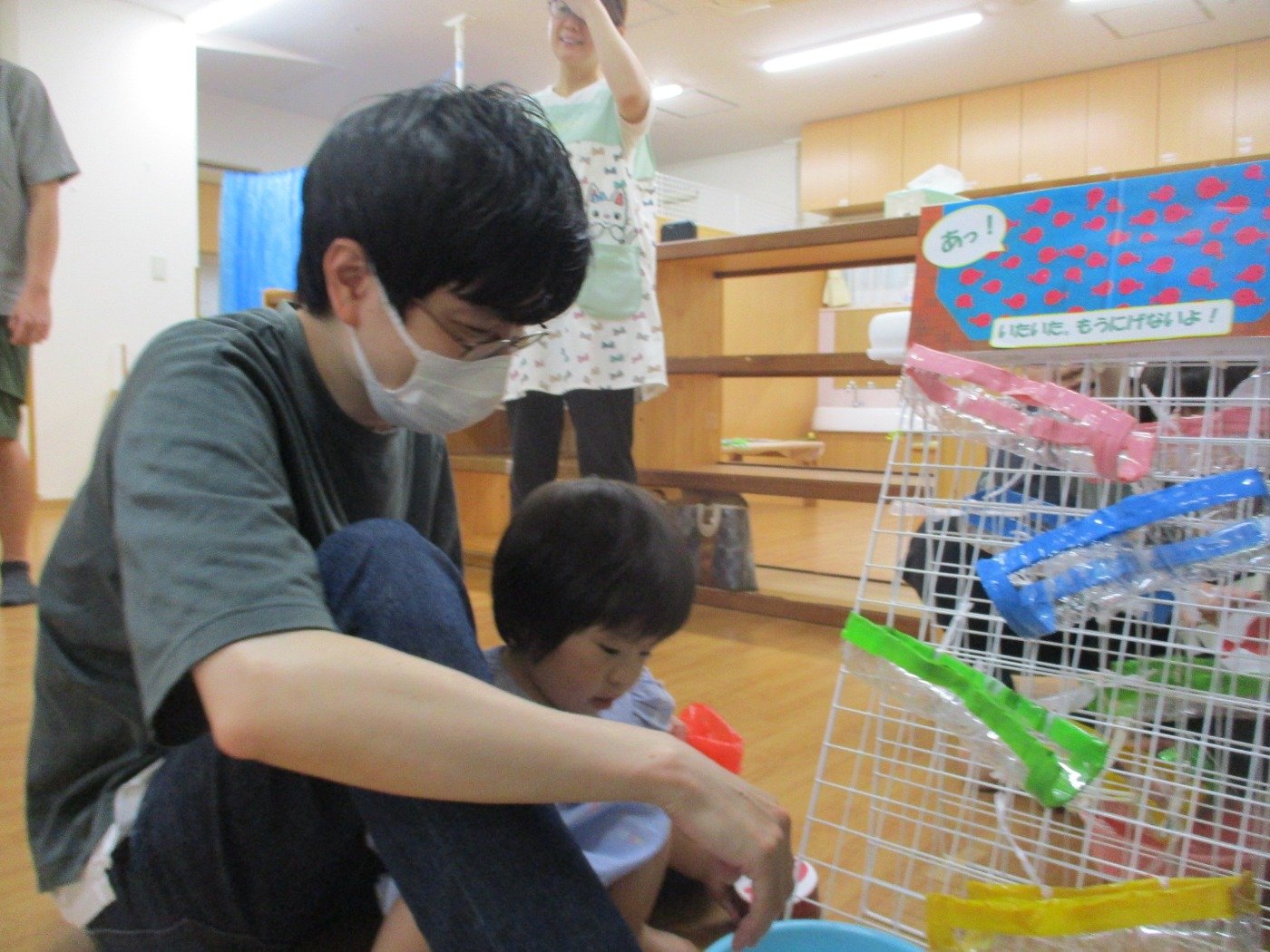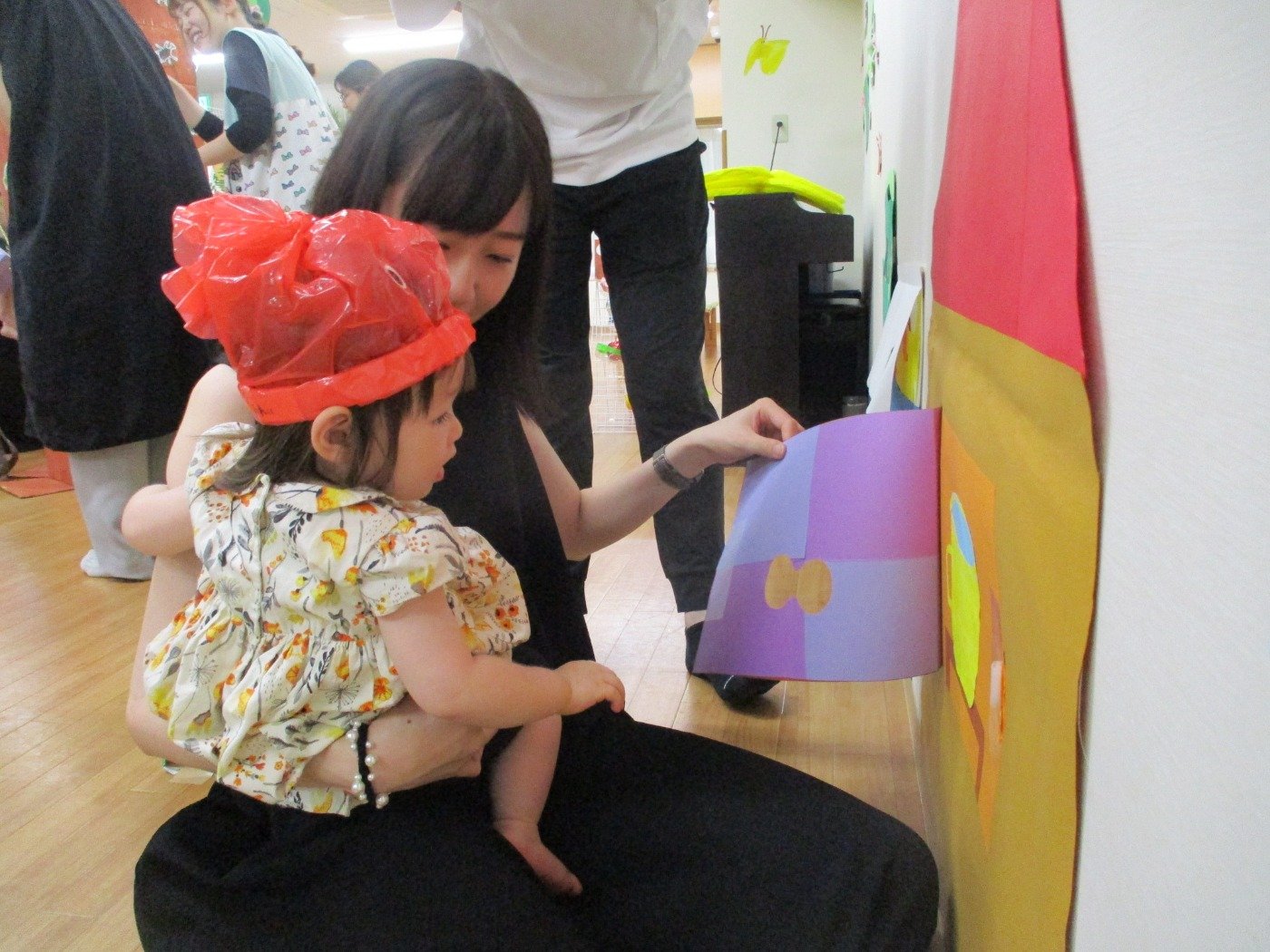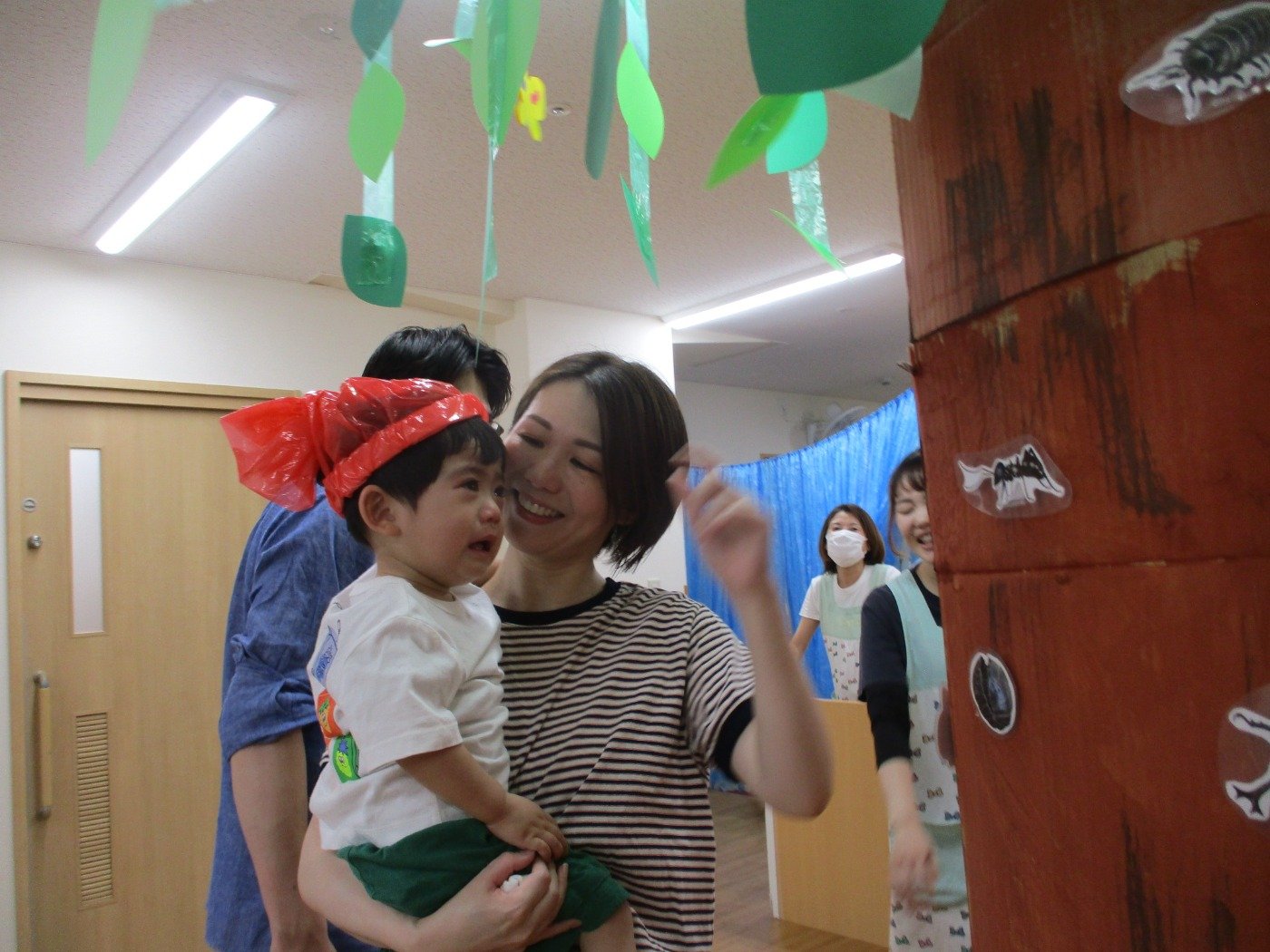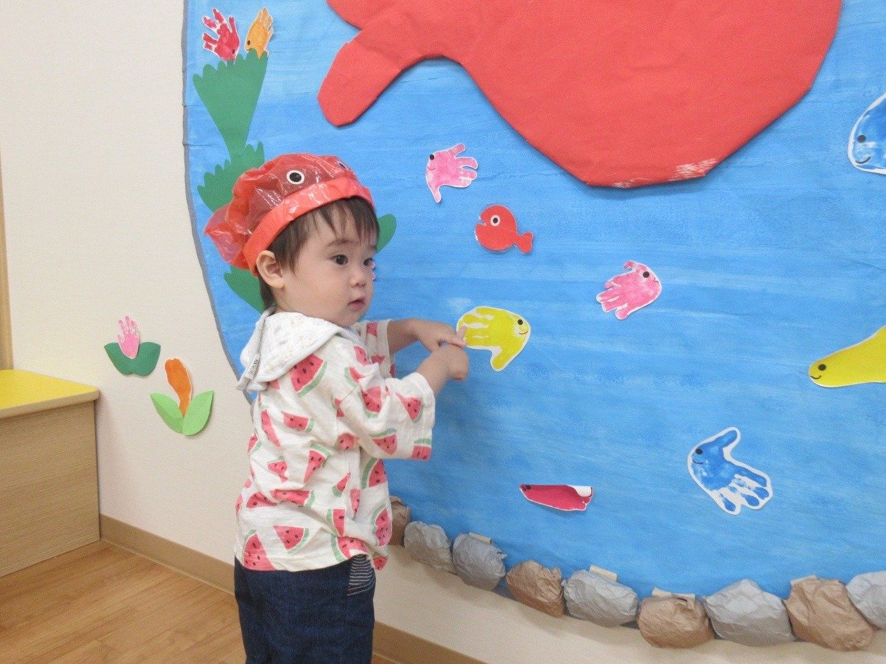 みてみて!きんぎょさんいたよ!と手形や足形で作ったきんぎょさんをお家の方に知らせています。「ぺったんしたの?」「可愛いね~」とおうちのかたと盛り上がっている姿も見られ、微笑ましい光景にほっこりしました。