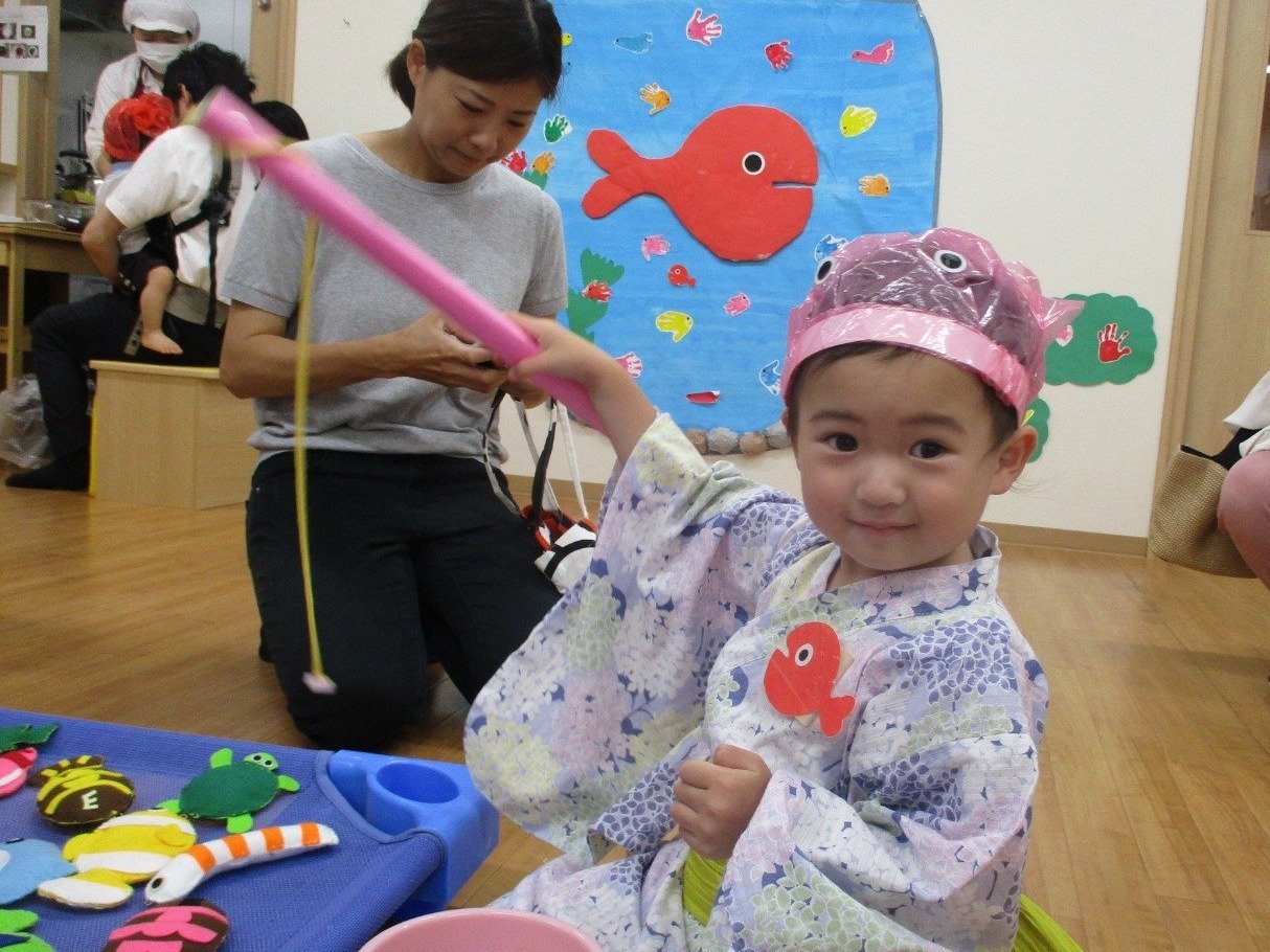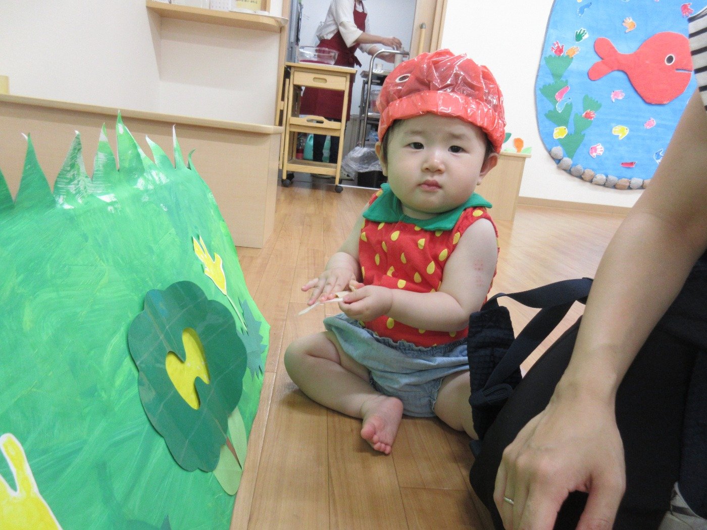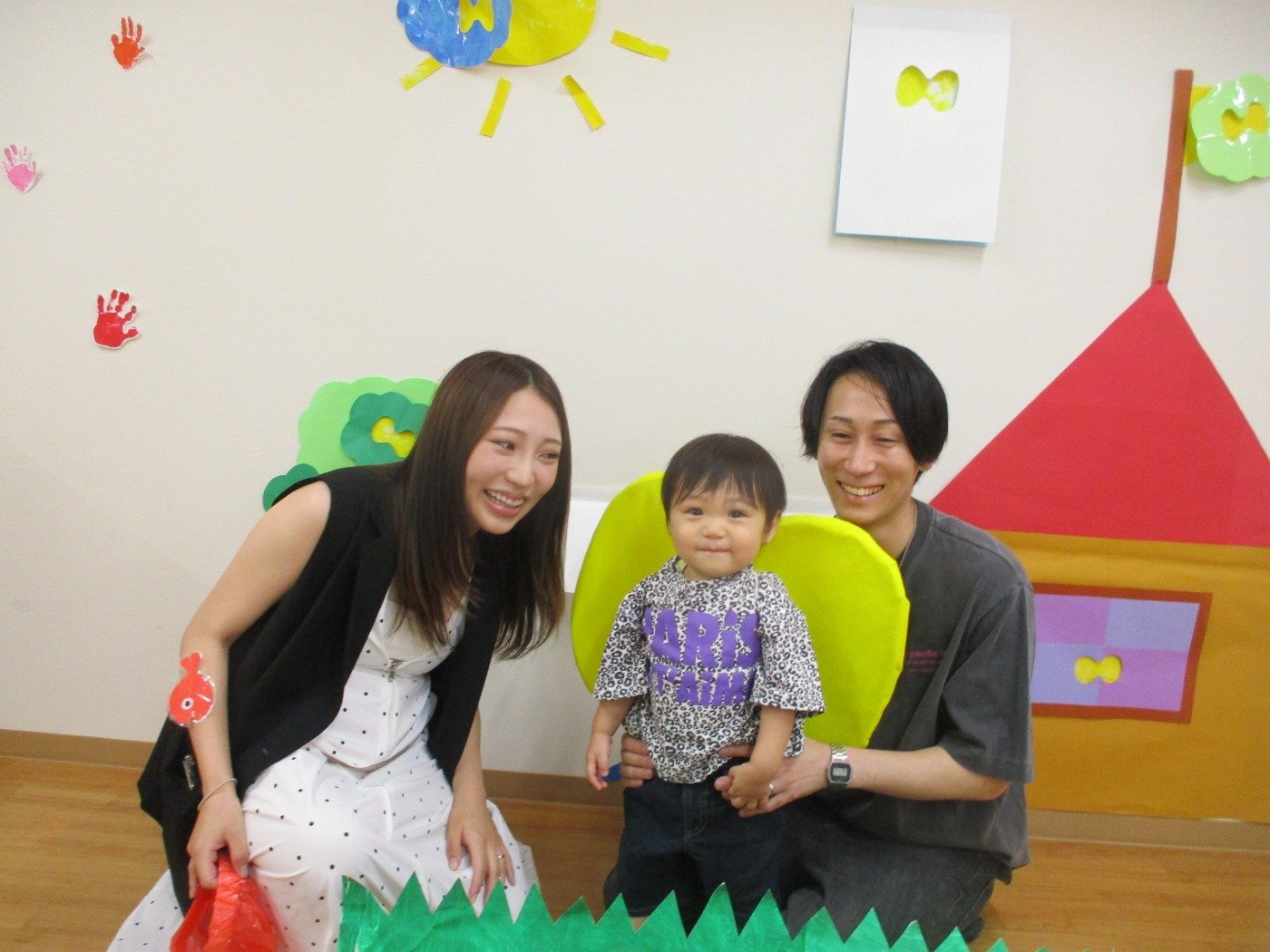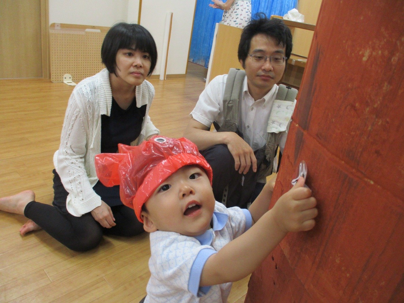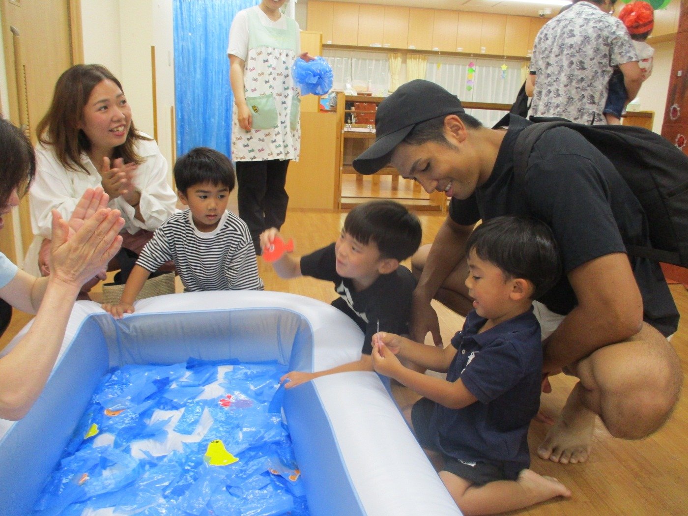 みてみて!きんぎょさんいたよ!と手形や足形で作ったきんぎょさんをお家の方に知らせています。「ぺったんしたの?」「可愛いね~」とおうちのかたと盛り上がっている姿も見られ、微笑ましい光景にほっこりしました。