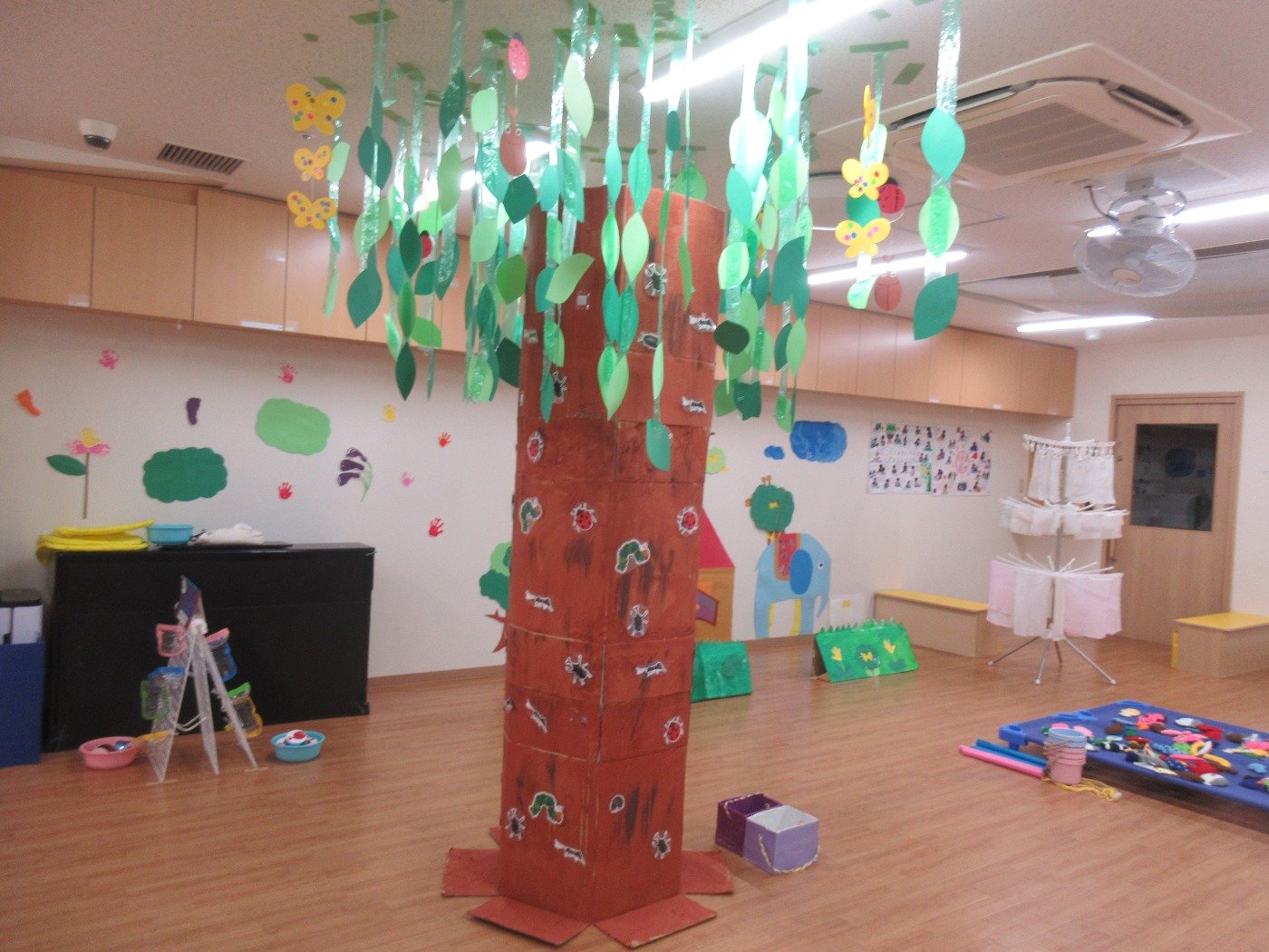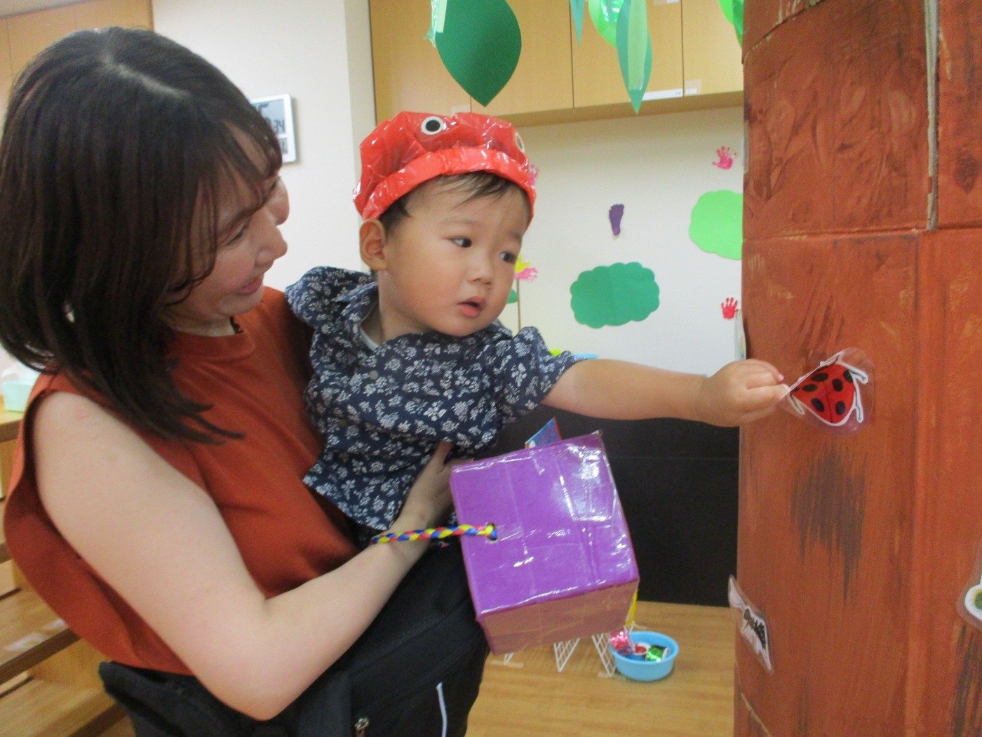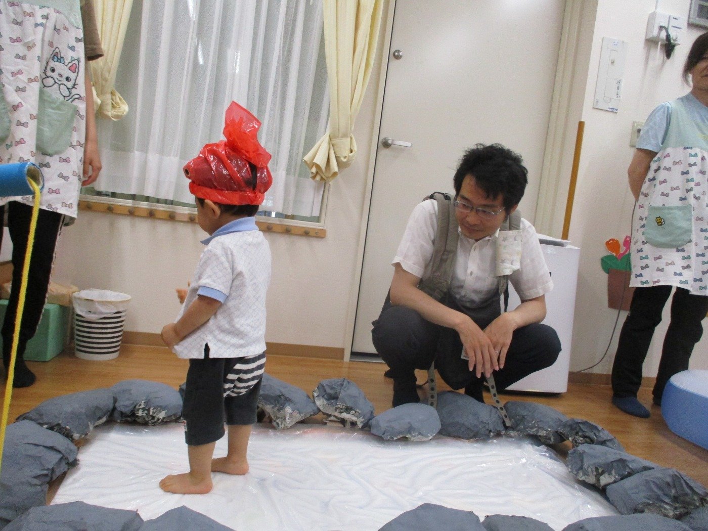 保育室のあちらこちらにいろんな仕掛けをしたり、池をつくり感触コーナーを設けてみたり。お家の方とパチリっ!とお写真を撮れるコーナーを作ったり。