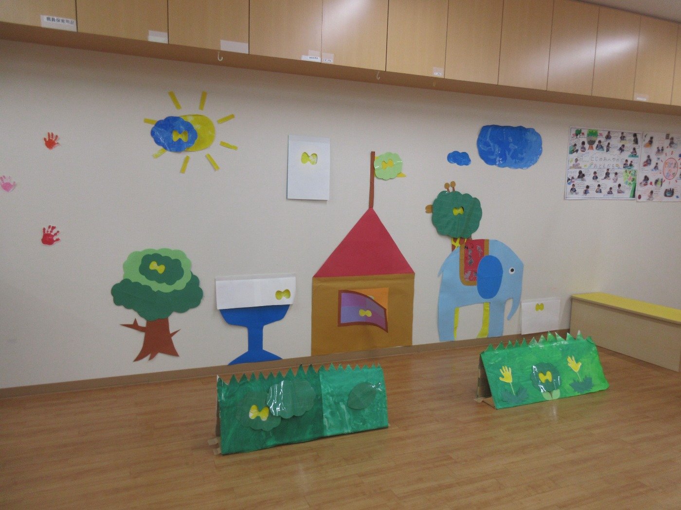 今回は、子どもたちが大好きな絵本の中から五味太郎さんの「きろいのはちょうちょ」「きんぎょがにげた」の絵本の世界をイメージし、保育室をお庭にしてみました。題して「潮江の庭へようこそ!」