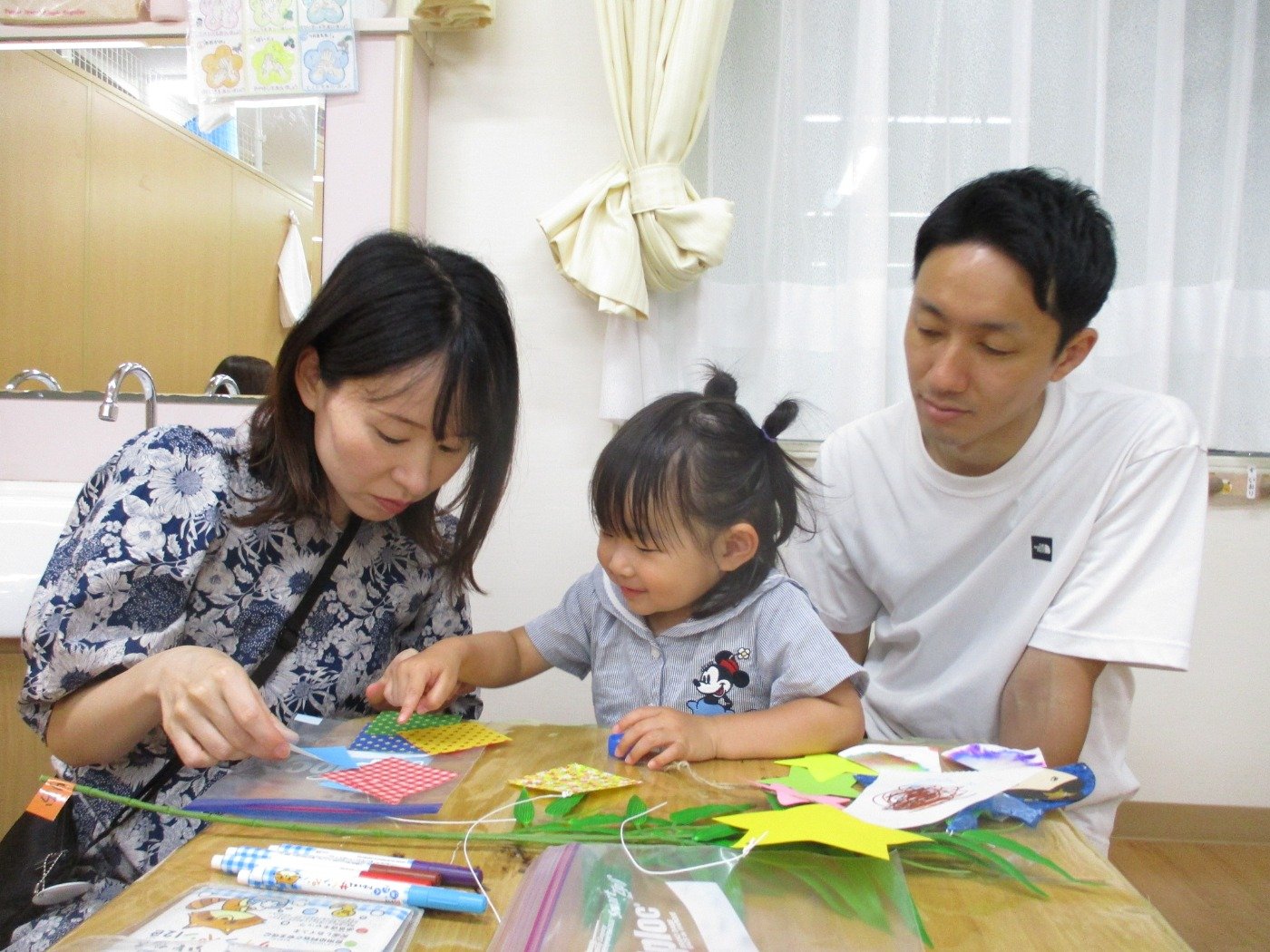 七夕制作コーナーでは、お家の方と一緒に笹飾りを作ったり短冊に願い事を書いていただきました。