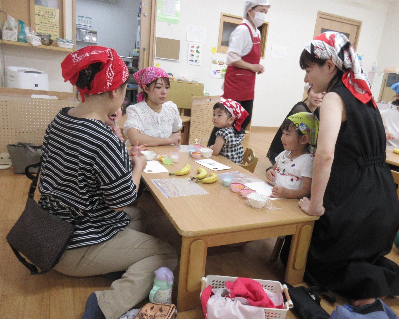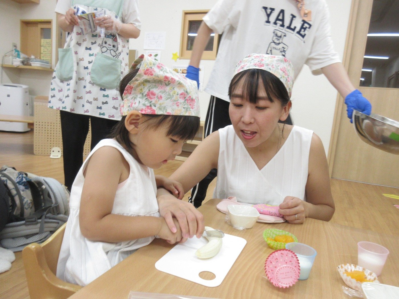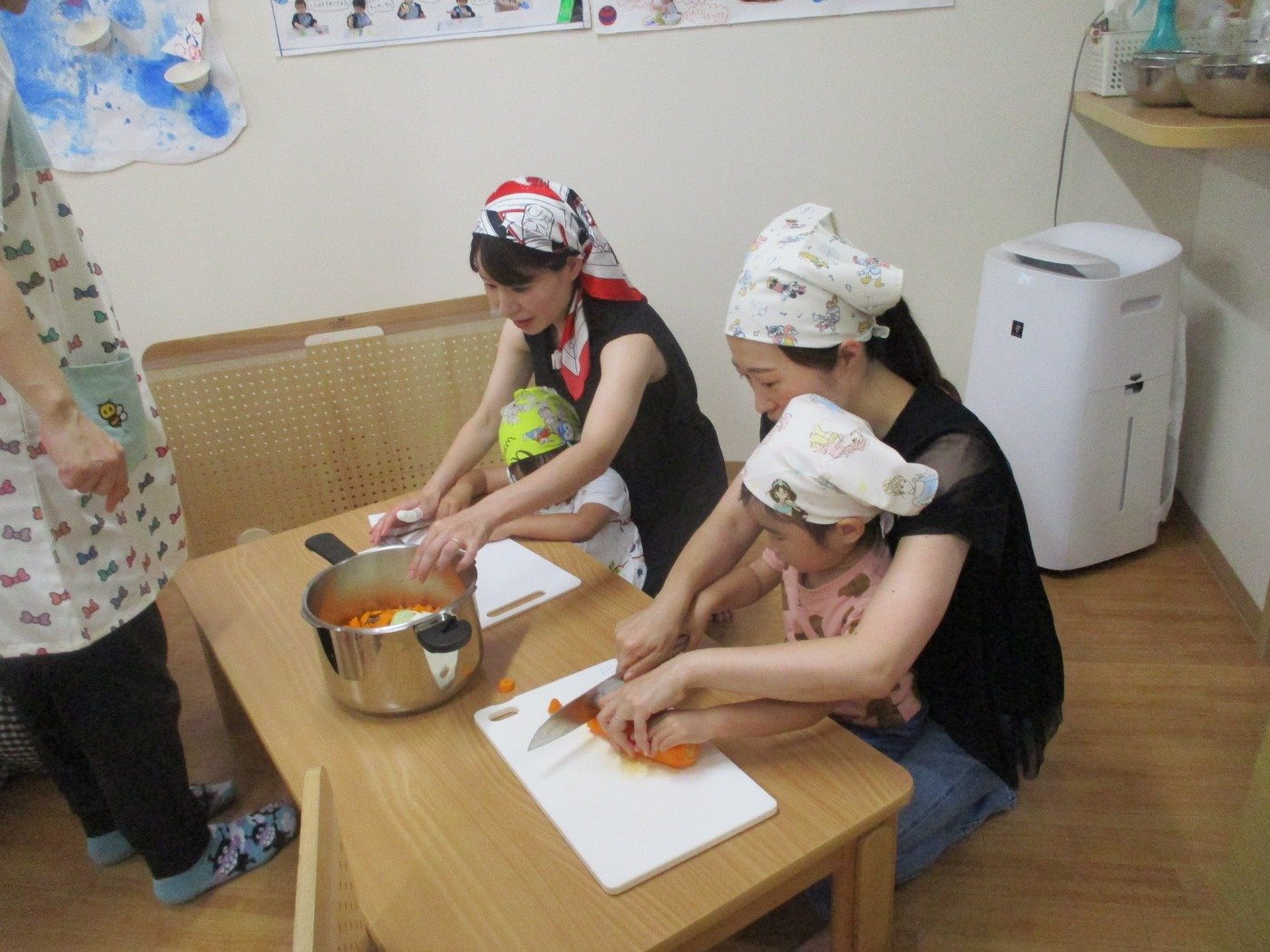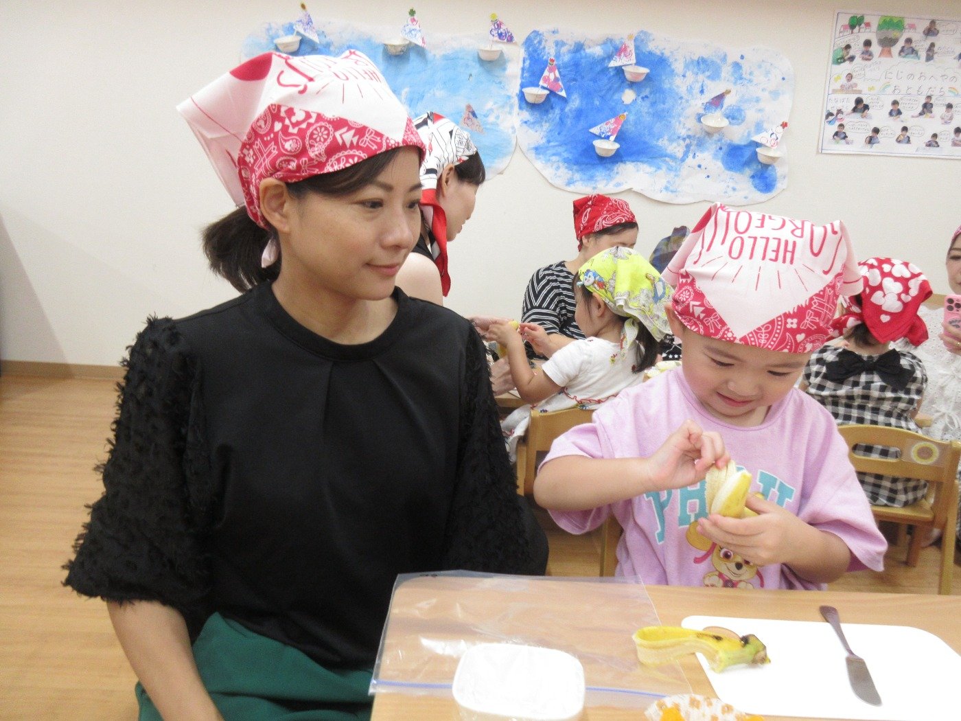8月前半におひさま組2歳児さんの保護者参観がありました。親子でクッキングをしたり、わらべうた遊びをしたり。