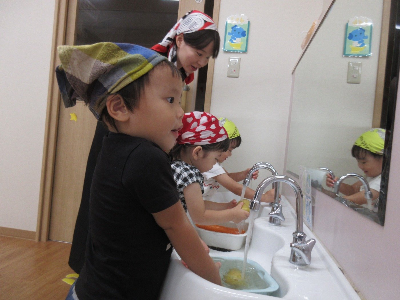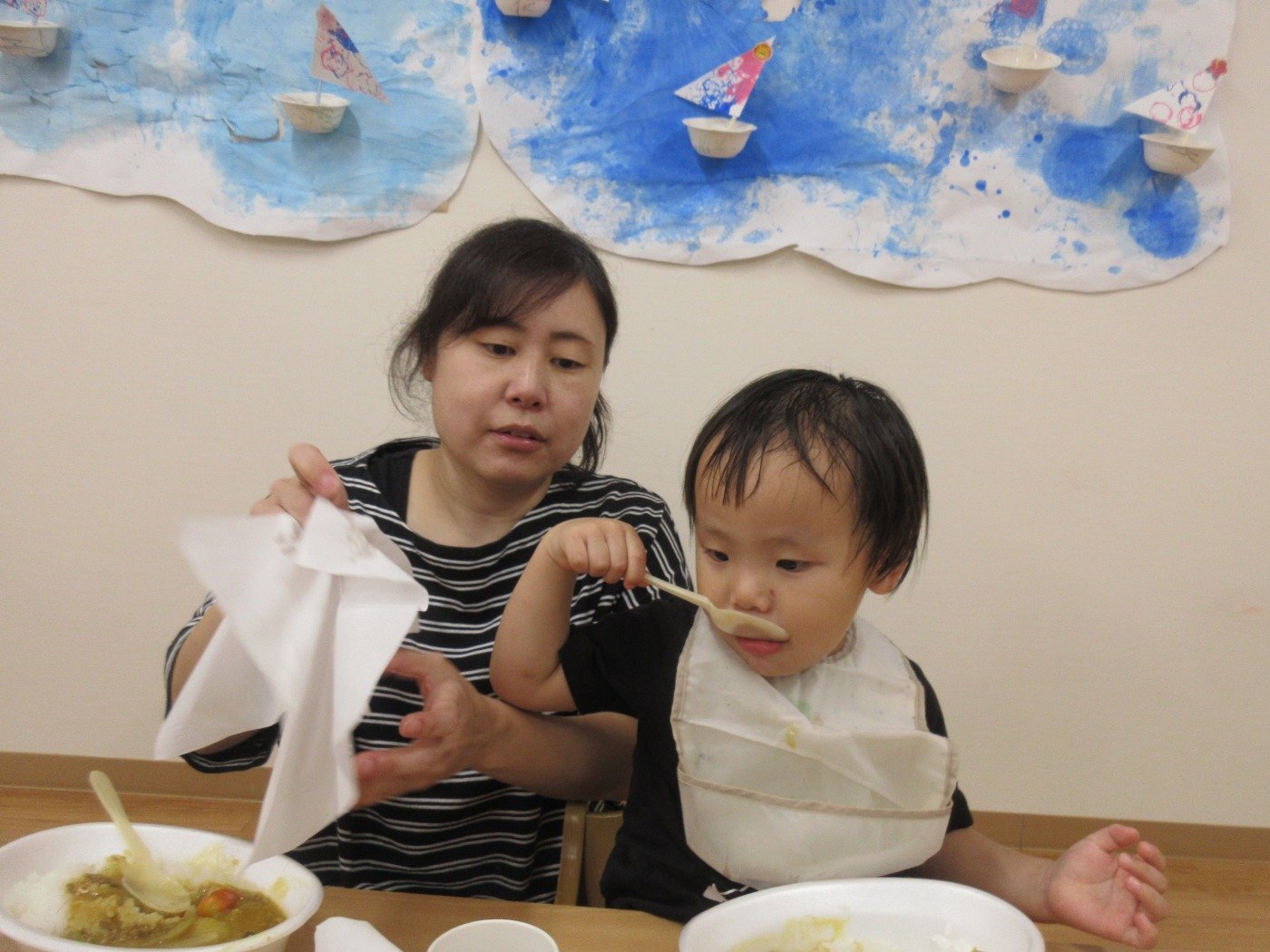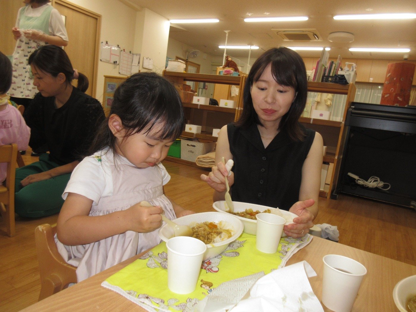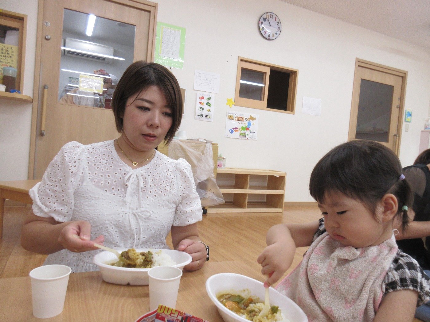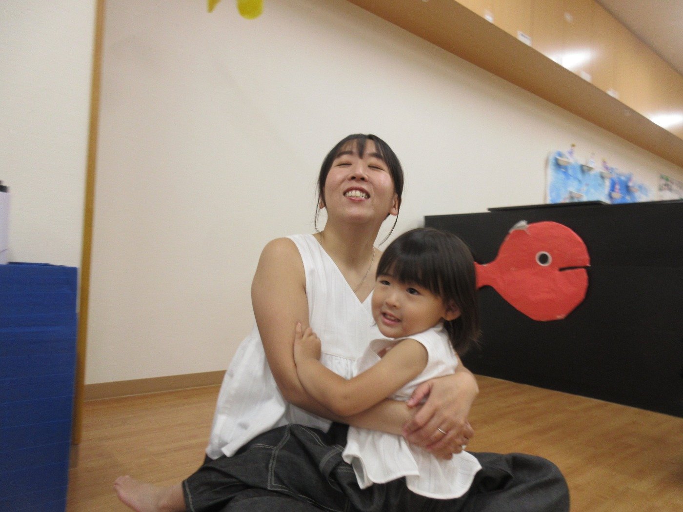 8月前半におひさま組2歳児さんの保護者参観がありました。親子でクッキングをしたり、わらべうた遊びをしたり。