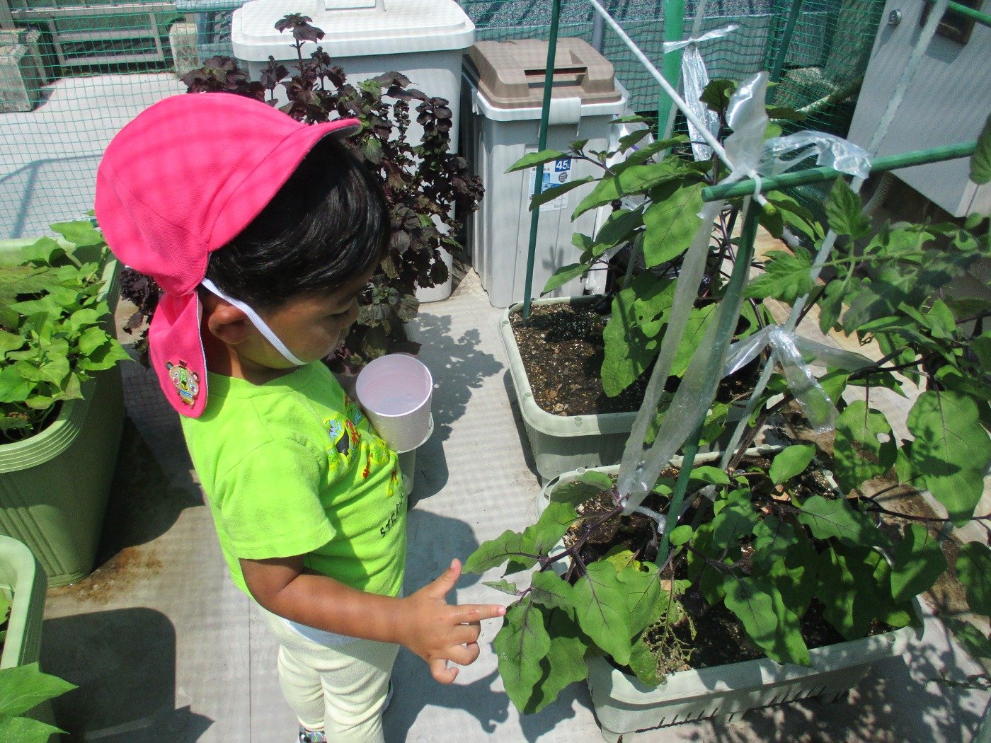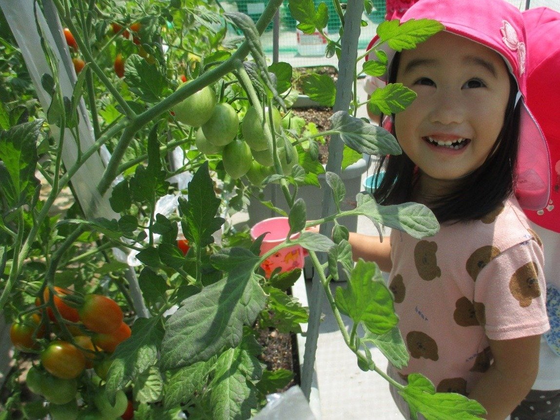 先ずは親子で夏野菜を収穫していただきました。「ほらピーマン!」「ここトマトあるよ」なんてお家の方に案内する子どもたち。「ほんとだ~」「大きいね!」なんて子どもたちの声に温かく応えて下さり子どもたちもピカピカの笑顔でしたね。
