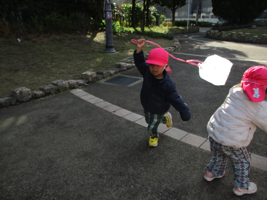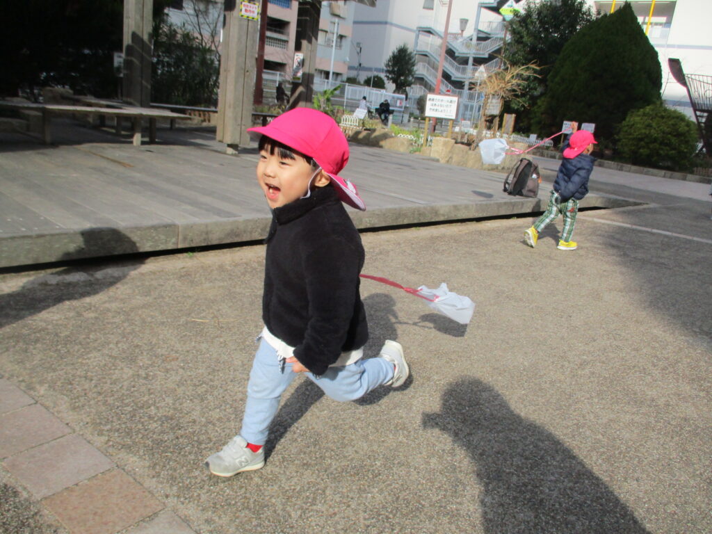 オリジナル「凧」を制作した子どもたち。ぐ~んと空高くに飛ぶかなあ~・・・なんて話しながら凧揚げにでかけました。 お手々を「やった~!」にして走ることを伝えてのスタート。