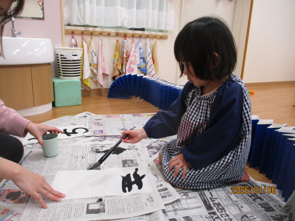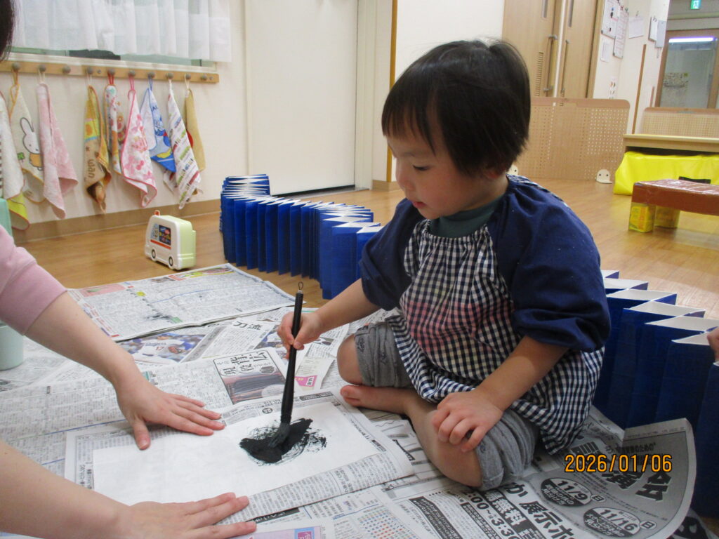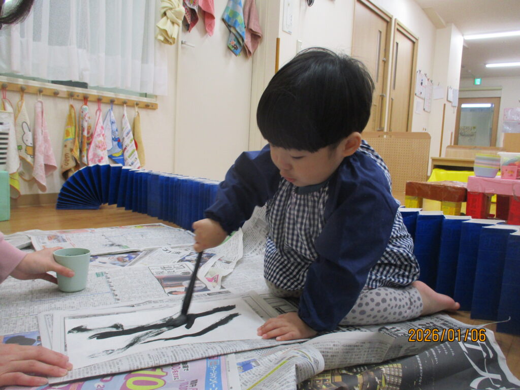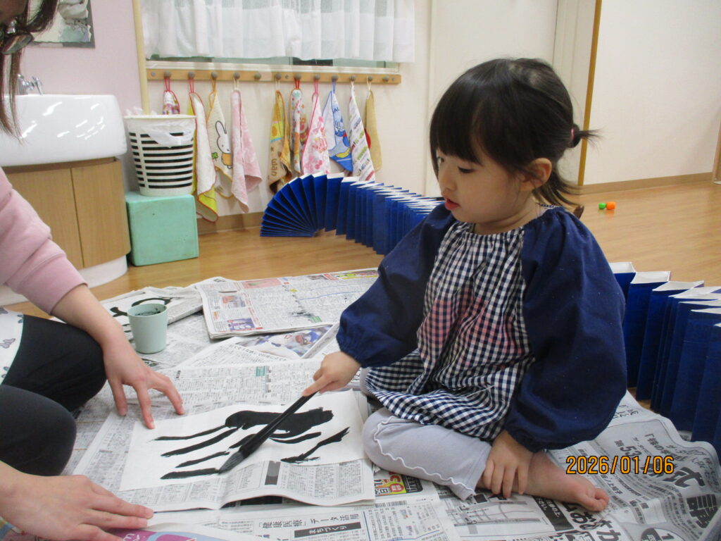 おひさま組さんは、書き初めにチャレンジしました。絵の具遊びは経験がある子どもたちですが、「墨」「半紙」に触れるのは初めての経験。「筆」に触れ絵筆との違いを感じた子どもたち。