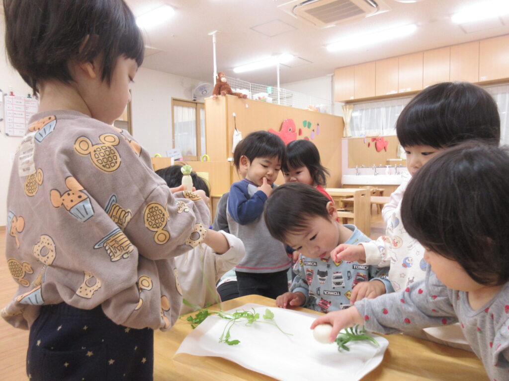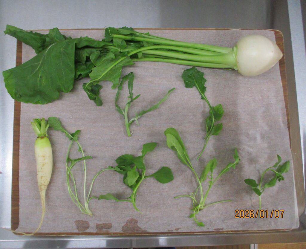 先日の、お給食で「春の七草」をいただきました。「七草」種類はなんとなく覚えがあっても、どれがどれだか・・・お調理の先生が子どもたちにも(保育者にも)分かりやすいように分けてくれました。