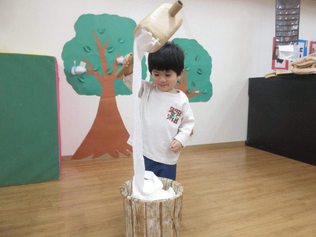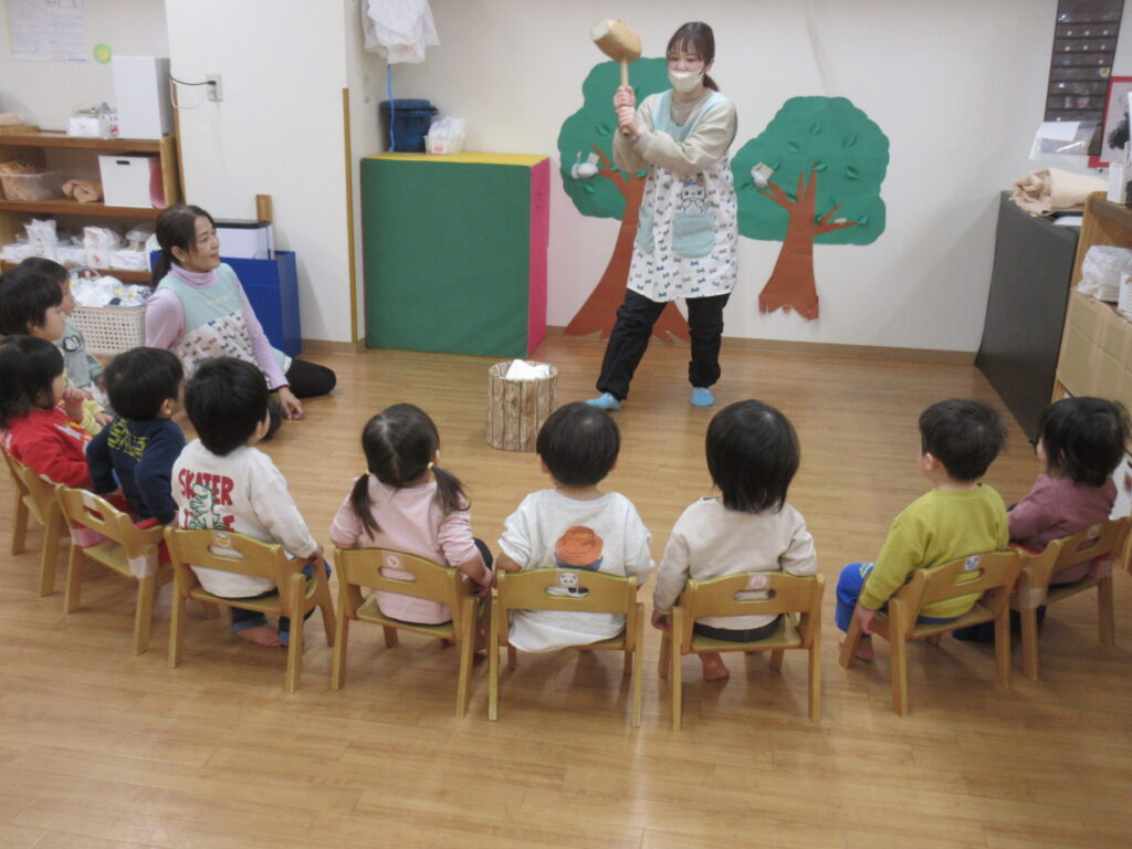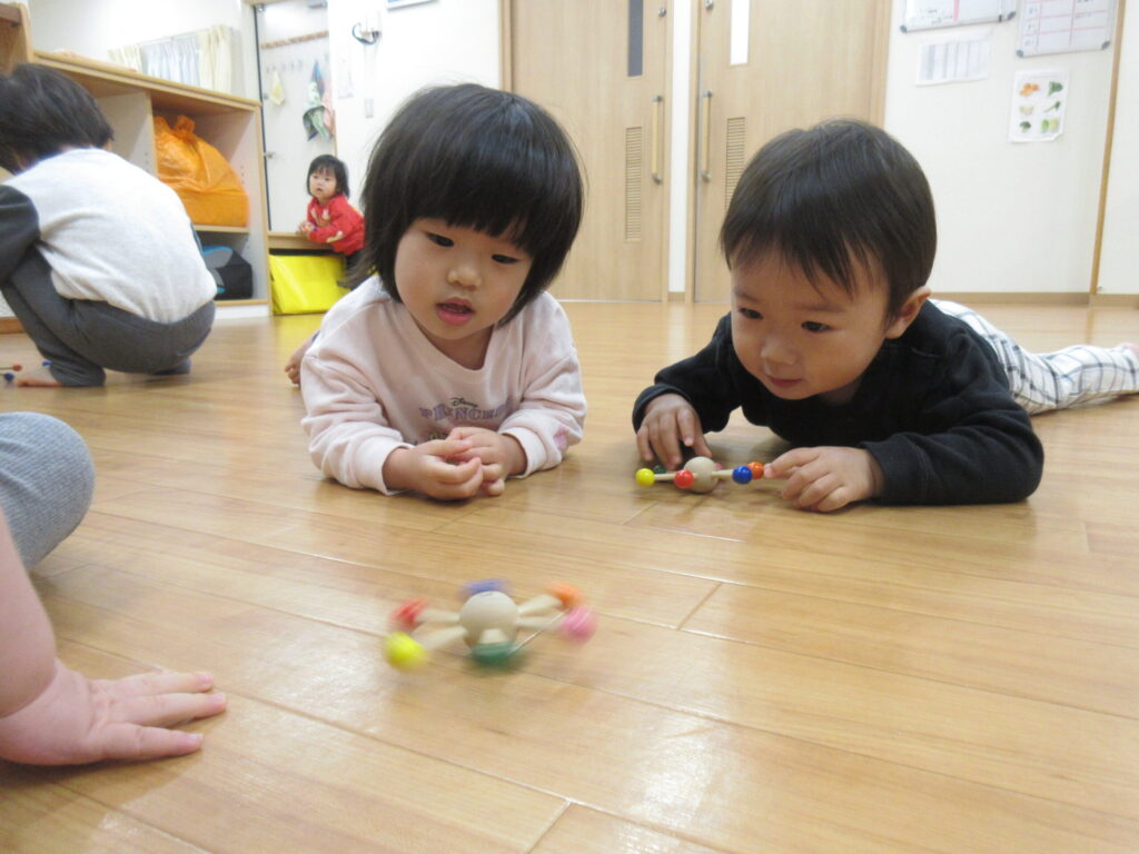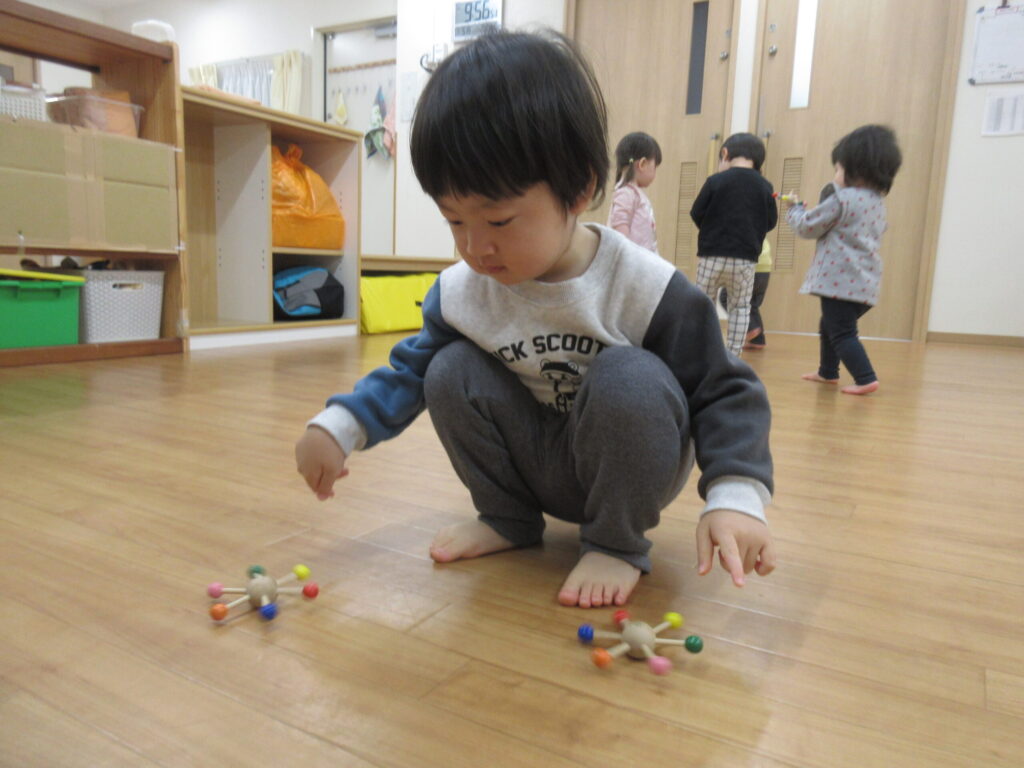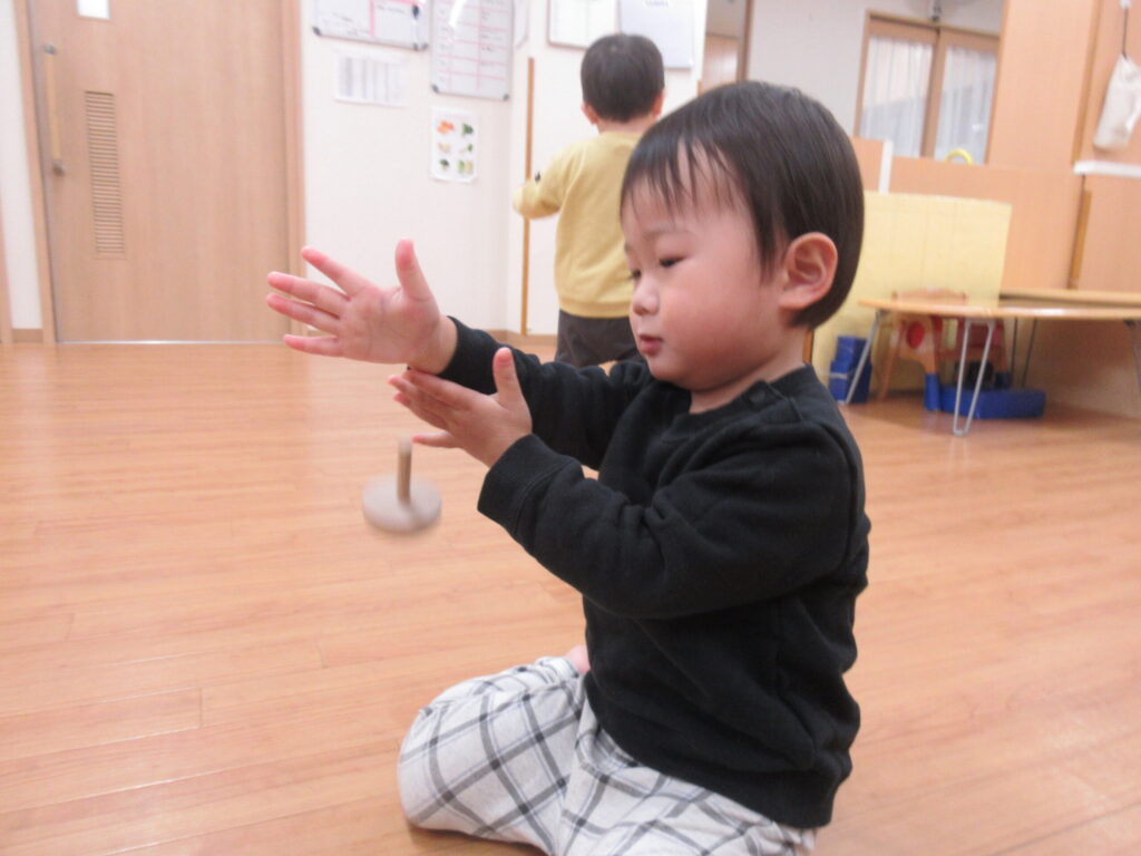 にじ組さんは、こままわし・福笑いにチャレンジしました。指先でひっかけて回す子や、手首をしっかり使って回す子。「くるくるくるーーー」と回るとパチパチ拍手をして大喜び。