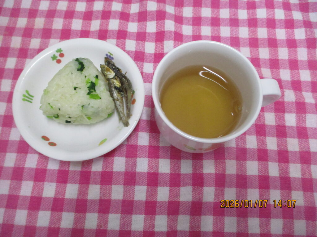 三時のおやつに、「七草おにぎり」をいただきましたよ。