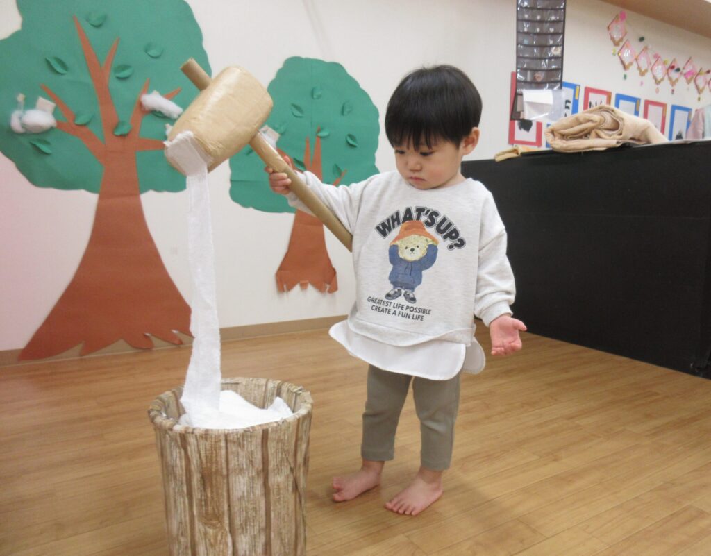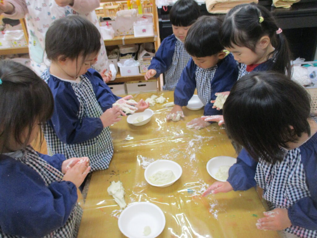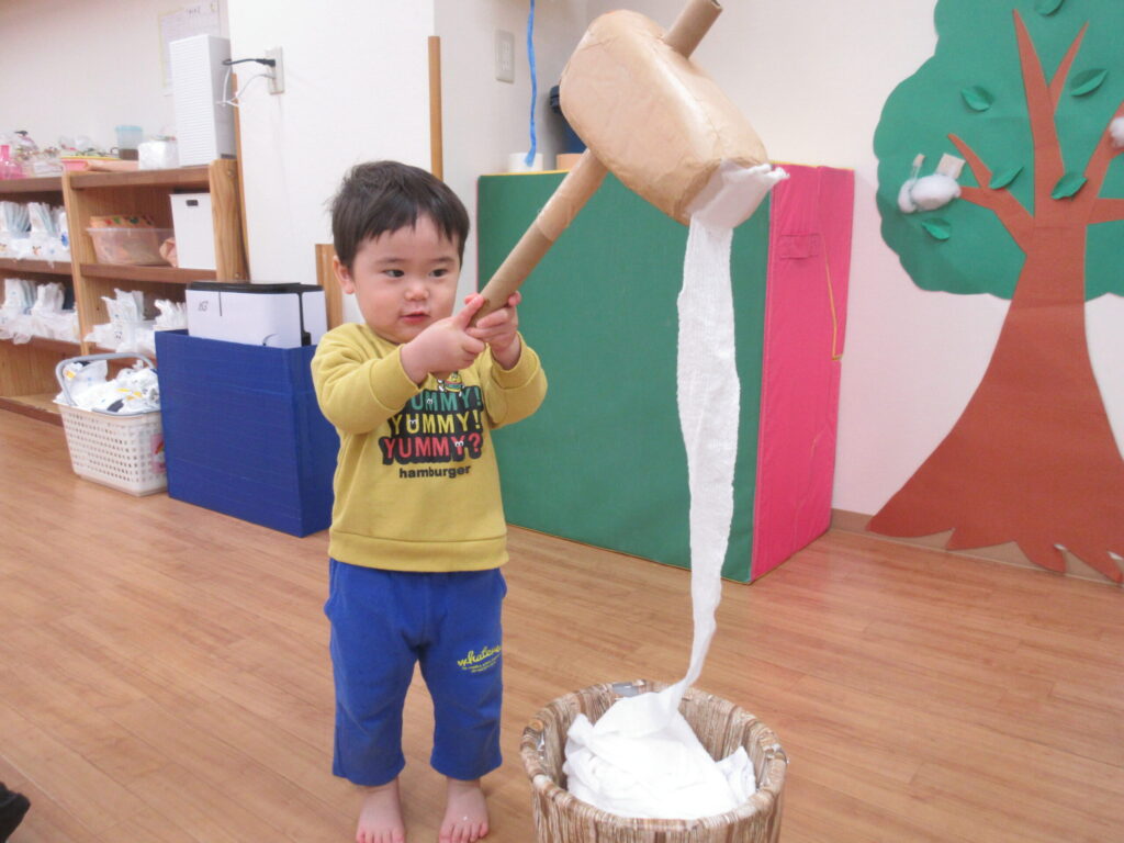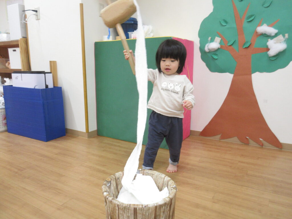 搗きあがったおもち(小麦粉粘土)をまずは丸めます。「べたべたする」「気持ちい」、どんな匂いがするのか「くんくん」したり、「のびるねー」と感触を楽しんでいるいる子もいました。