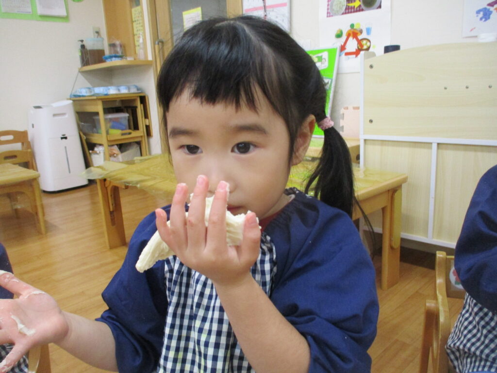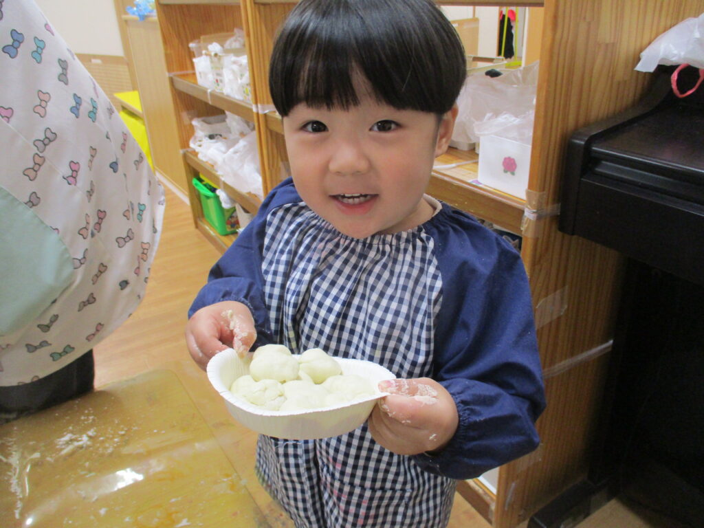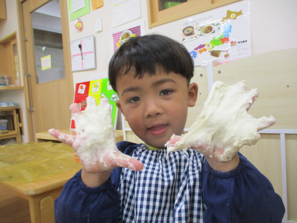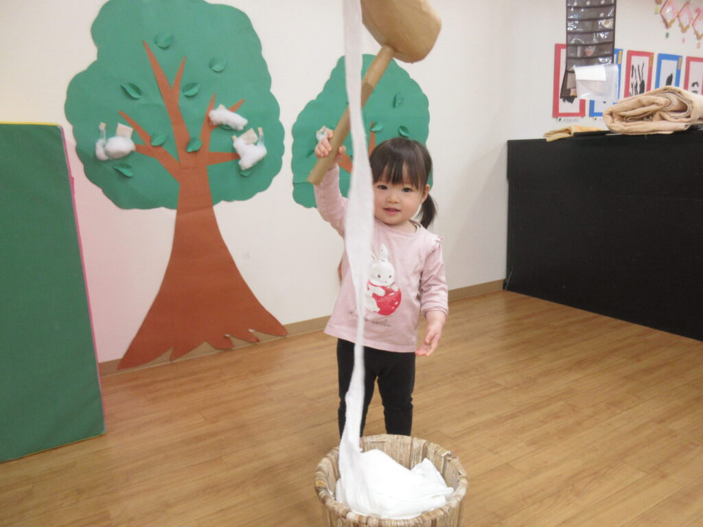 搗きあがったおもち(小麦粉粘土)をまずは丸めます。「べたべたする」「気持ちい」、どんな匂いがするのか「くんくん」したり、「のびるねー」と感触を楽しんでいるいる子もいました。