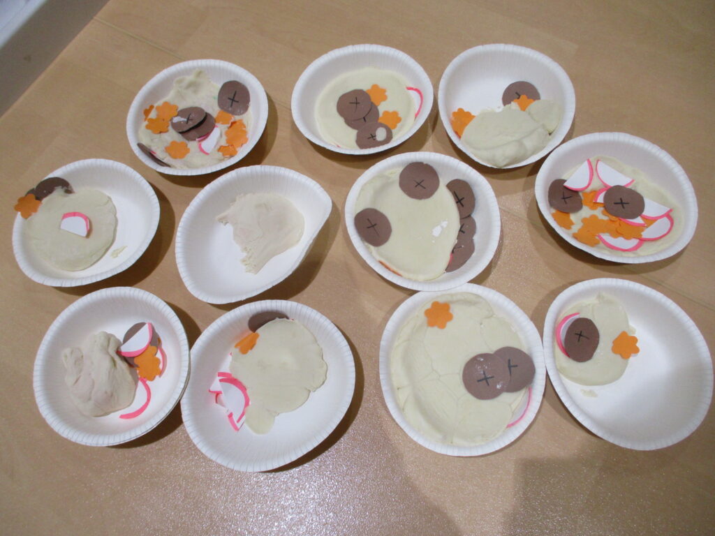 中には「べちょべちょ・・・」と何とも言えない表情の子もいましたが、お雑煮のトッピングが始まると「おいしいの作る!」とシイタケやかまぼこなどを盛り付けることを楽しみ、自分だけの「お雑煮」が出来上がると「食べていい?」「食べたいね」なんてウキウキしながら保育者に見せてくれました。