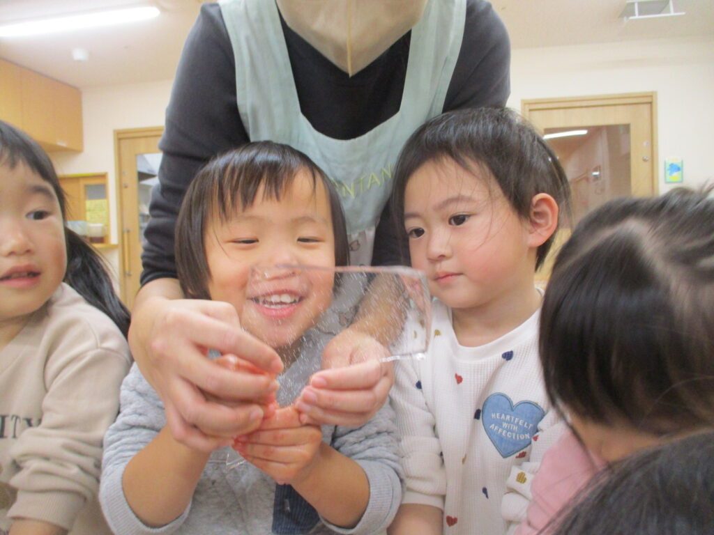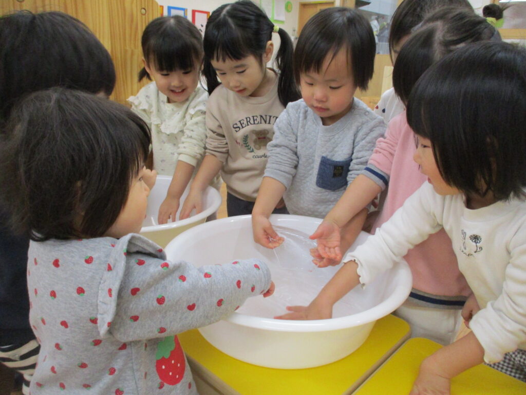 寒い日が続いていますが、子どもたちは毎日元気いっぱいに過ごしています。先日、前日にタライの中に水を張って外においておいたところ、翌朝にはきれいな氷ができていました。「水が氷になる」という冬ならではの自然の変化を、実際に見て触れて感じることができました。