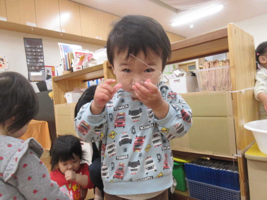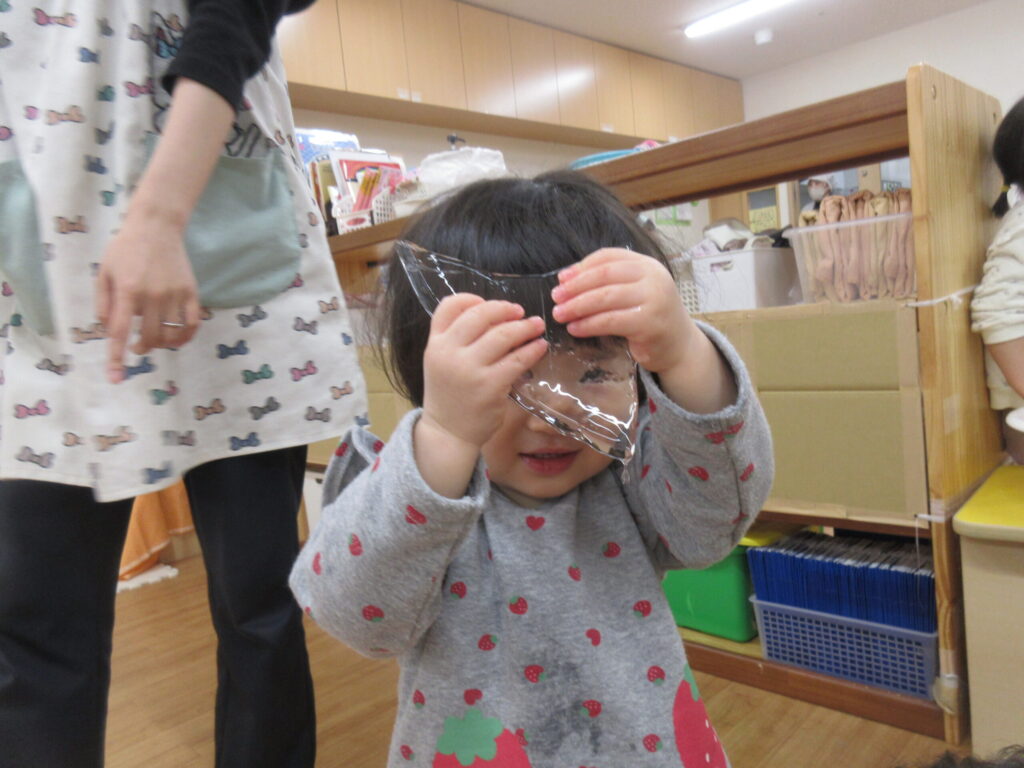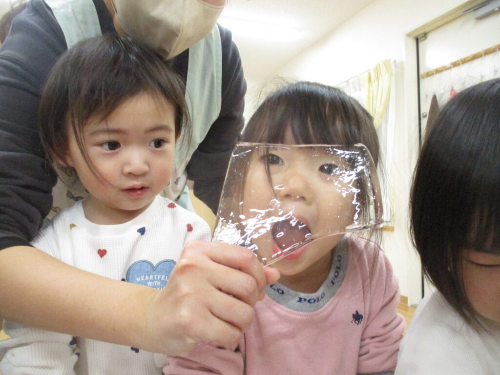 「つめた」「ぴかぴか」「きれいねー」と思い思いに感じたことを伝えてくれます。お手々が少し赤くなりながらも、何度もタライの中の氷を追いかけ、つかめると氷越しに見えるお友だちに「ば~ぁ」とみせてみたり、のぞきっこをしたり。冬ならではの遊びを満喫しました😊