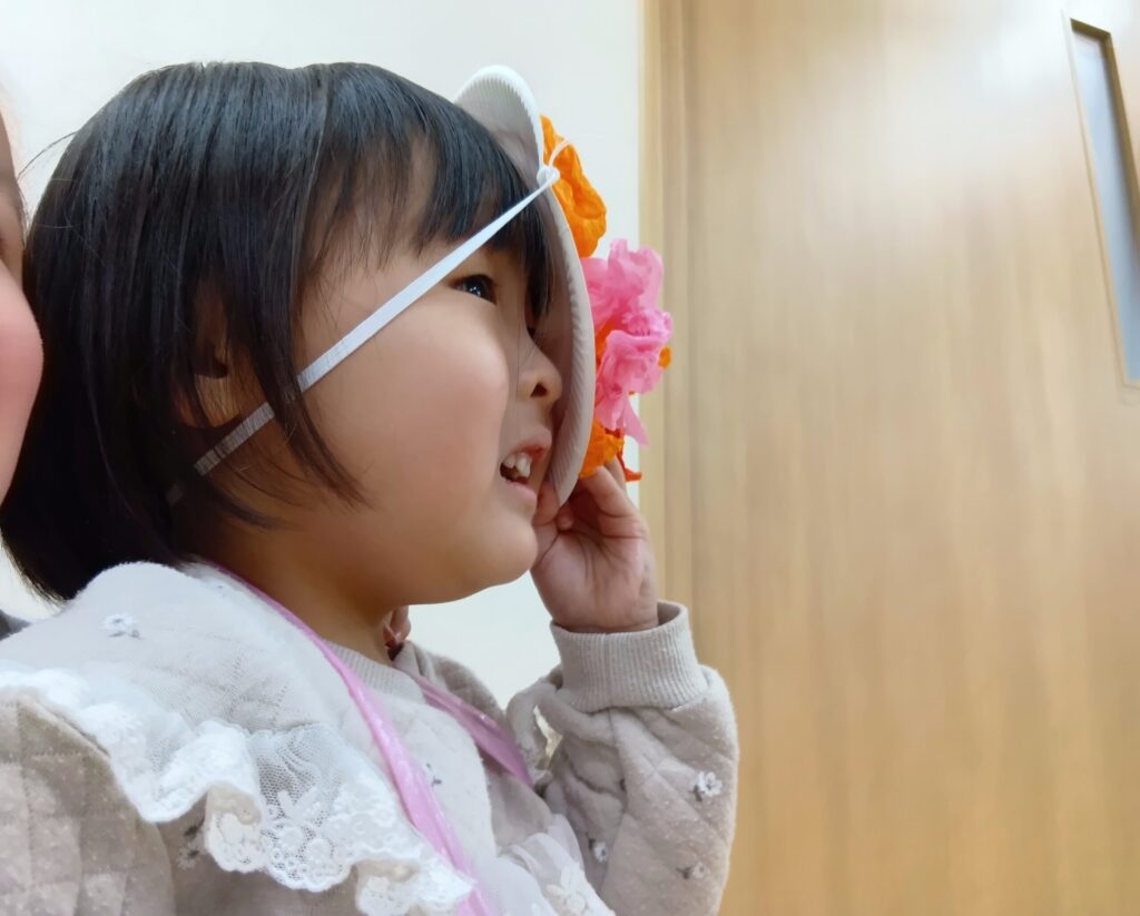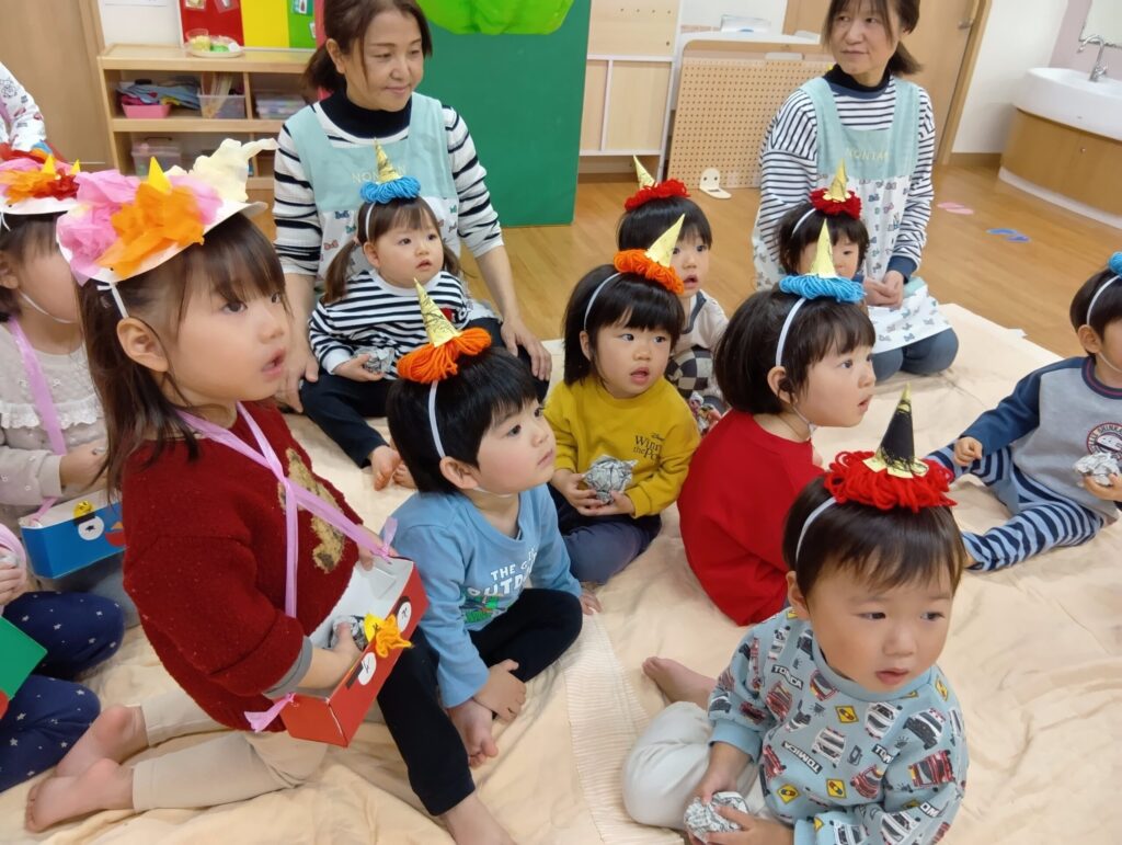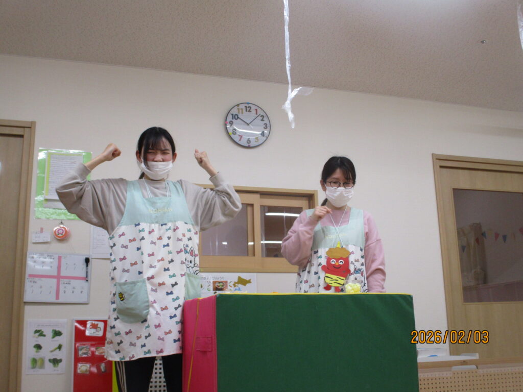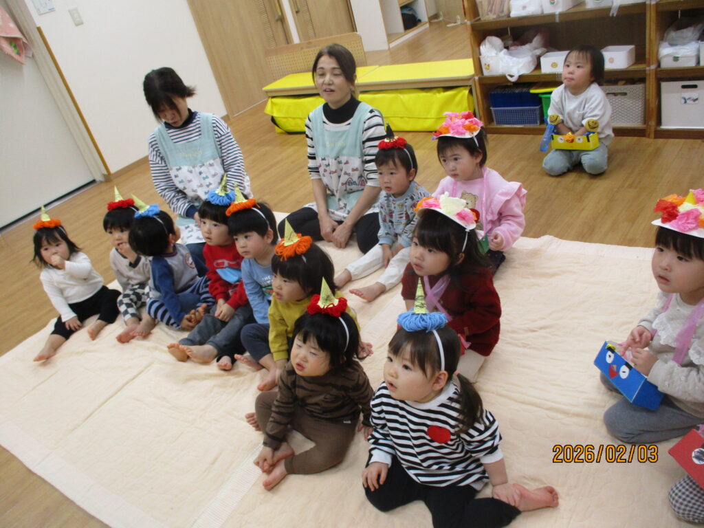 「節分」は、みんなが元気に過ごせますように・・・と願いながら、悪い物を追い払う日本の伝統行事です。子どもたちにも分かりやすいように、「お片付けいやいやオニ」「いじわるオニ」「お野菜いやいやオニ」などのお話しを保育者がペープサートを使って寸劇をしました。保育者の迫力ある演技に子どもたちもじーっとお話しに夢中でしたよ。