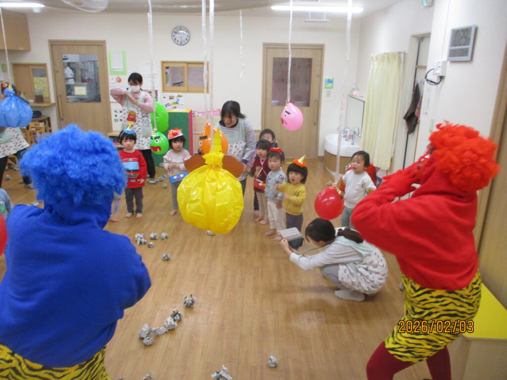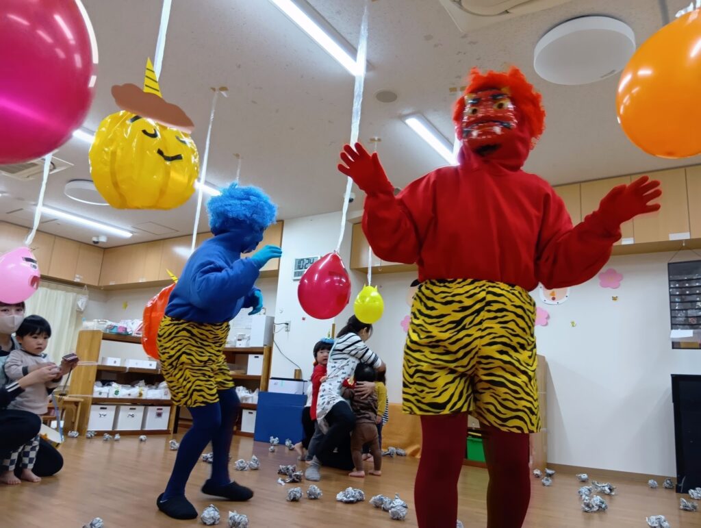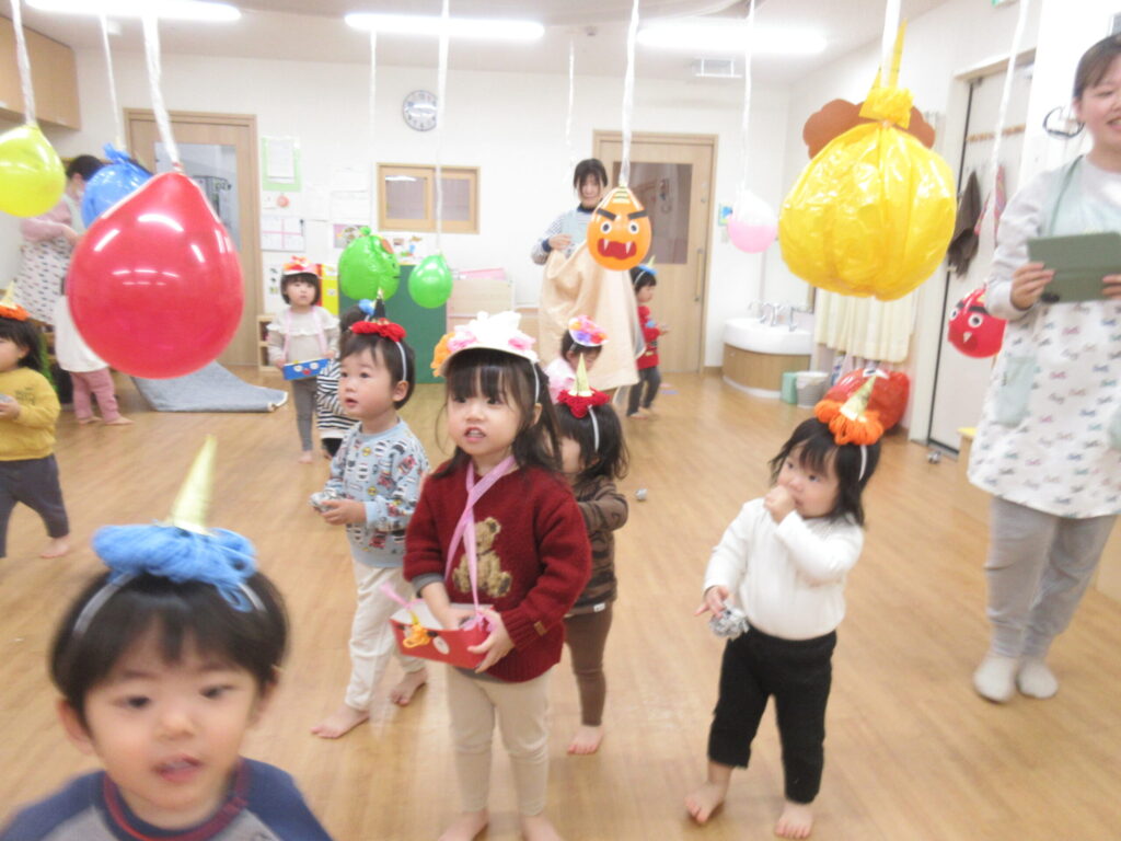 さあ!いよいよ豆まきの始まりです。子どもたちが作ったオニの帽子・新聞豆を入れる入れ物も準備万端。天井から風船オニがお出迎え!