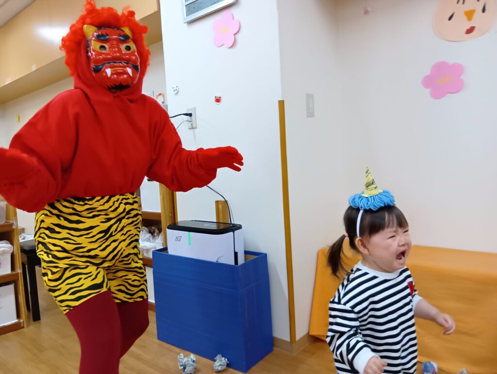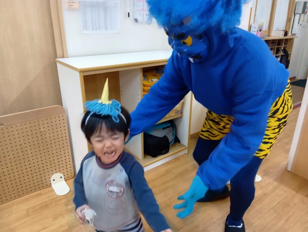 最初はドキドキ・涙涙の子どもたちでしたが、最後はオニさんが「びっくりさせてごめんね」とペコリと謝ると、ちょっぴりですが子どもたちの表情も和らいだようです。