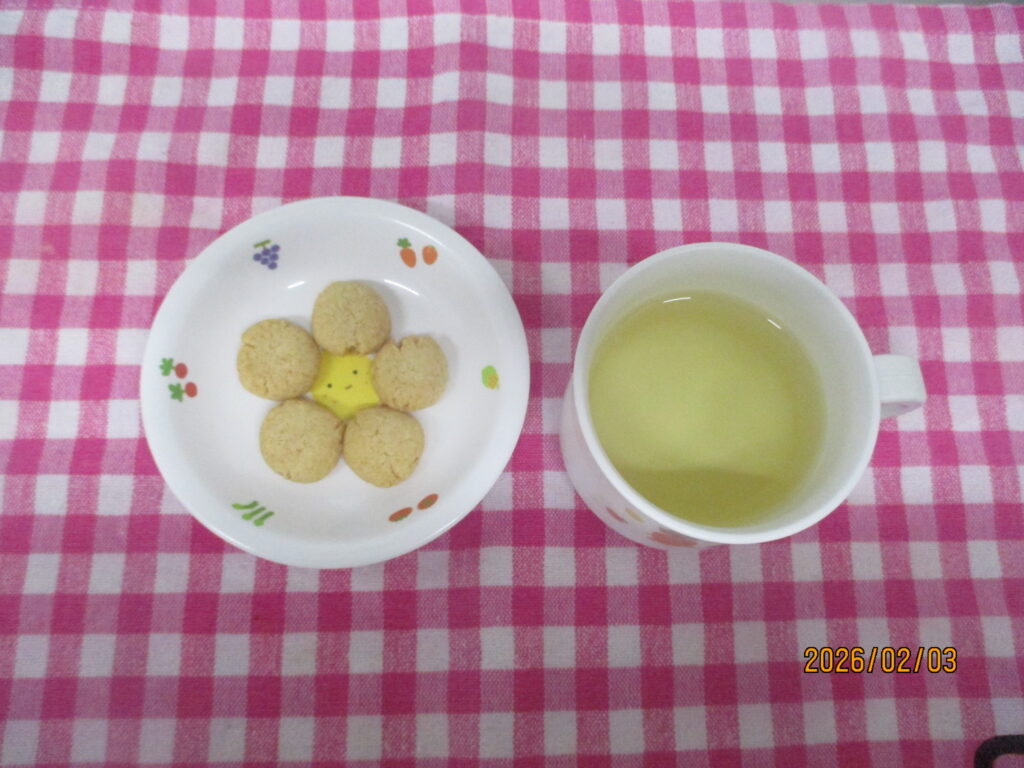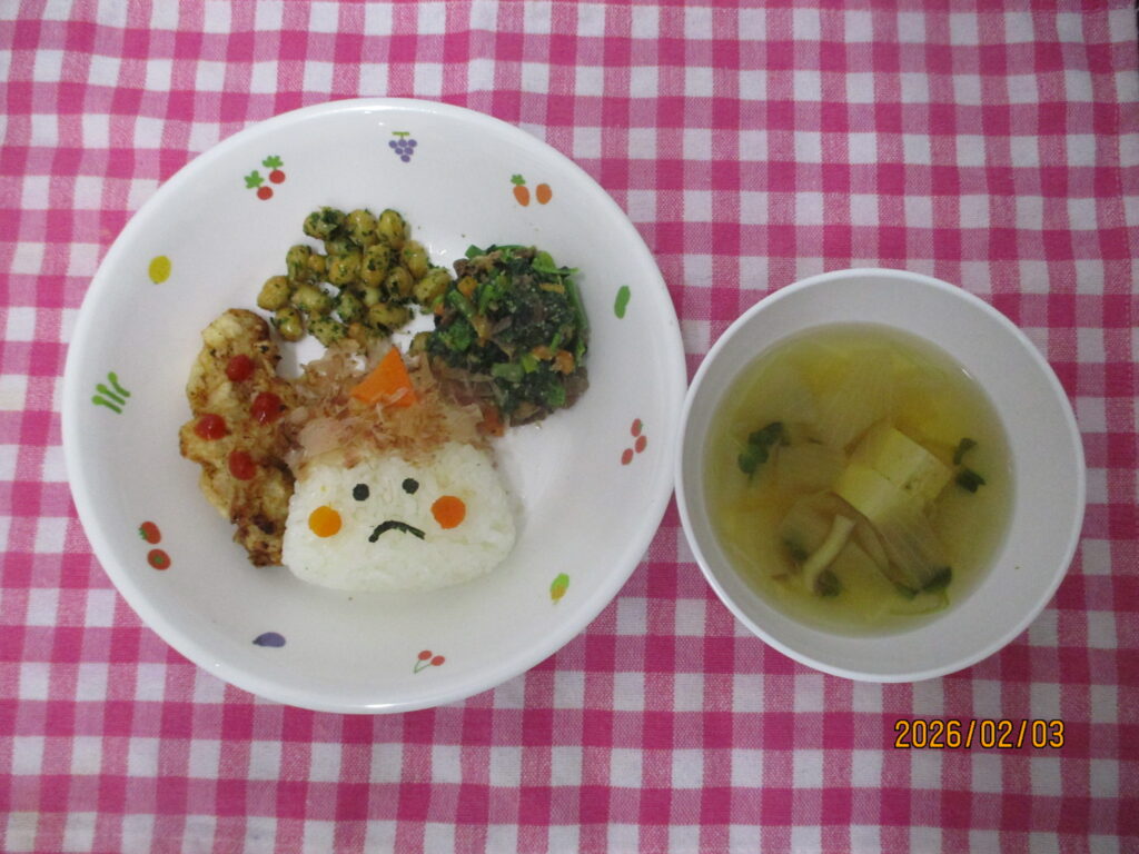本日のお給食&おやつ、かわいい鬼さんおにぎりをみて、「かわいい!」「しろおにさんさんだ!」と大喜びの子どもたち。たくさん食べてみんな完食でした😊
