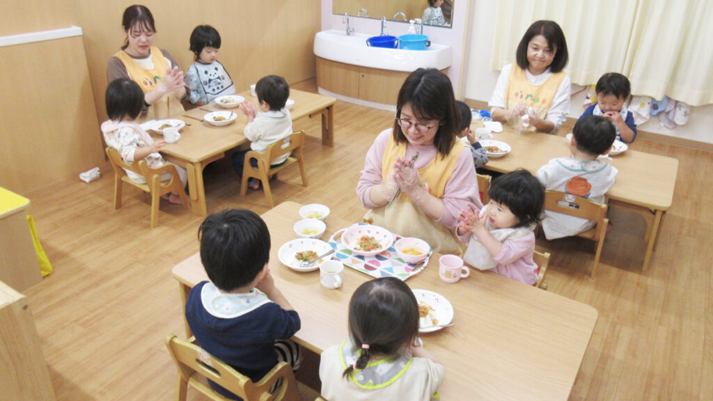 愛情たっぷりの給食をみんなでいただきます。野菜たっぷりのおいしいごはん。野菜を無理なく食べられる工夫があり、偏食克服をサポートしています。