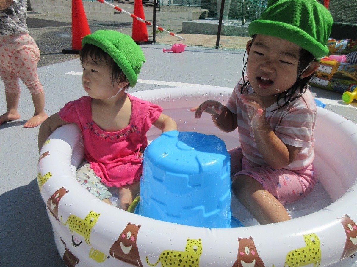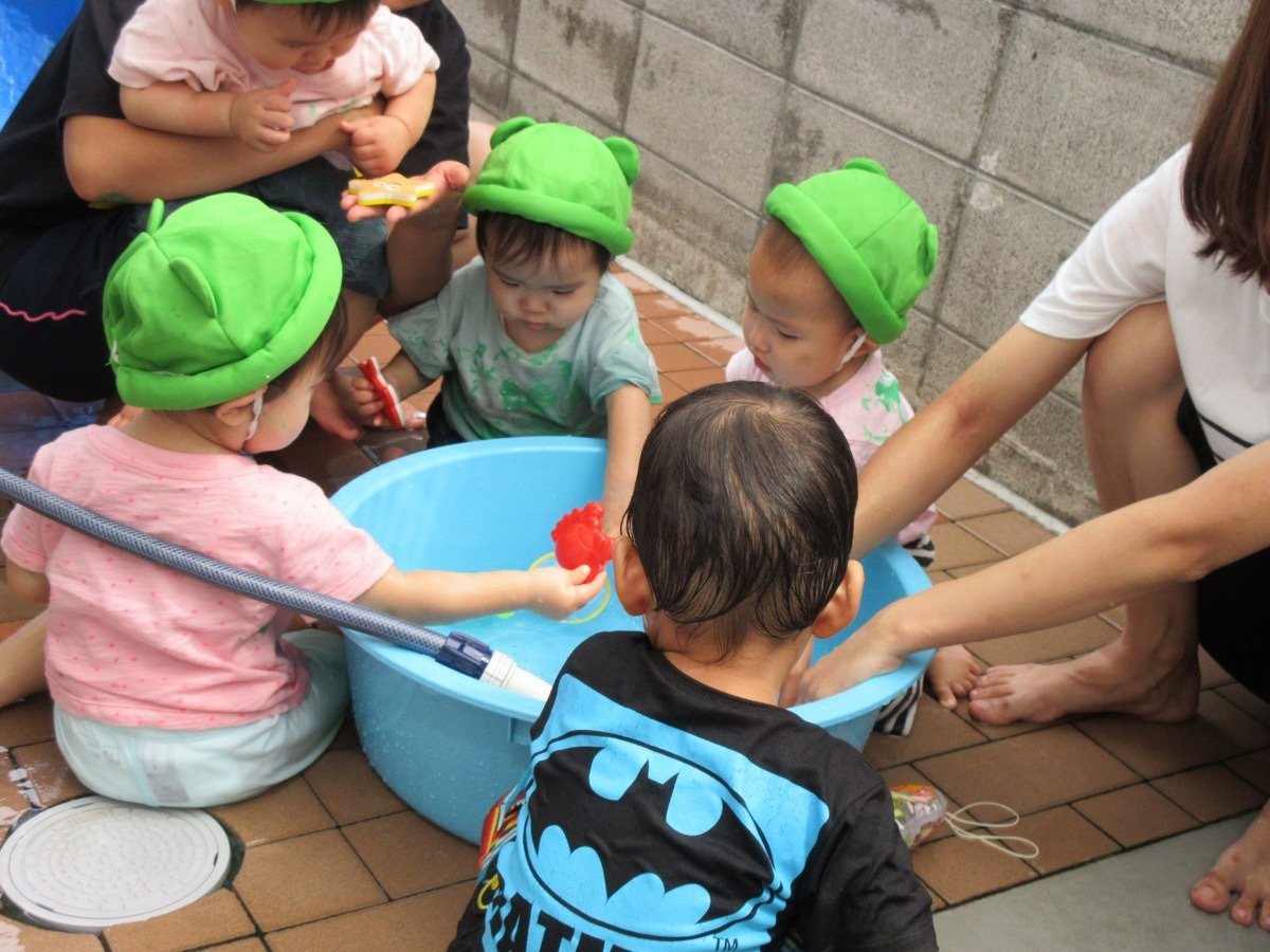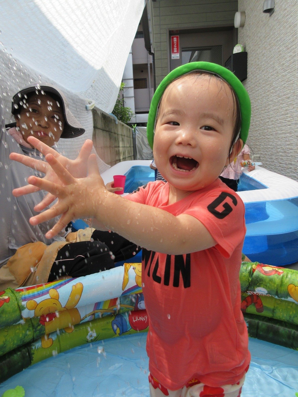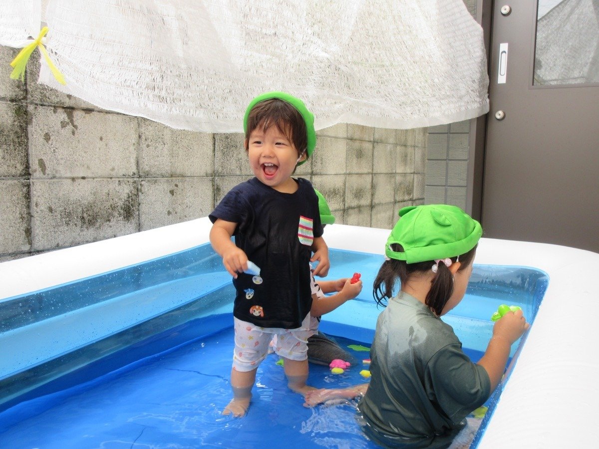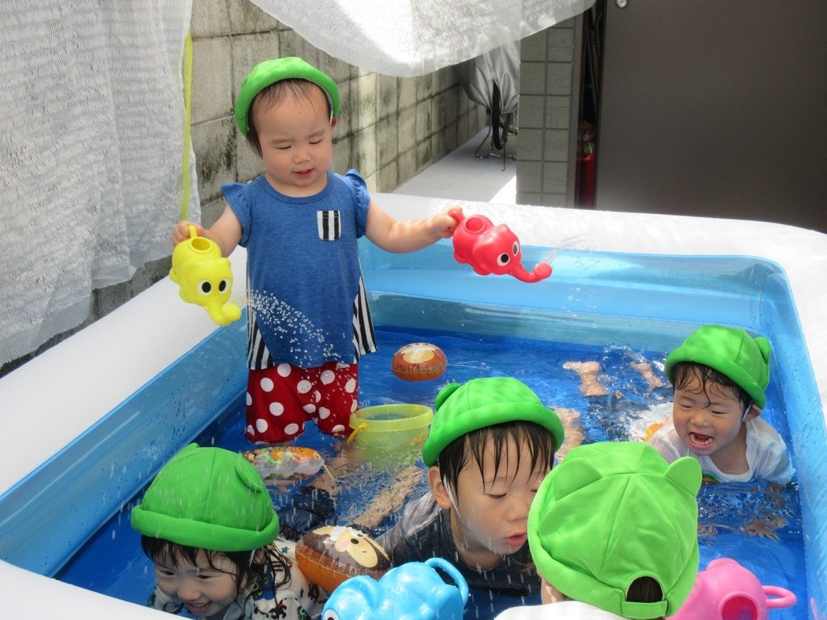初めは水を怖がっていた子も、少しずつ慣れ、水のかけあいっこを楽しめるまでになりました。