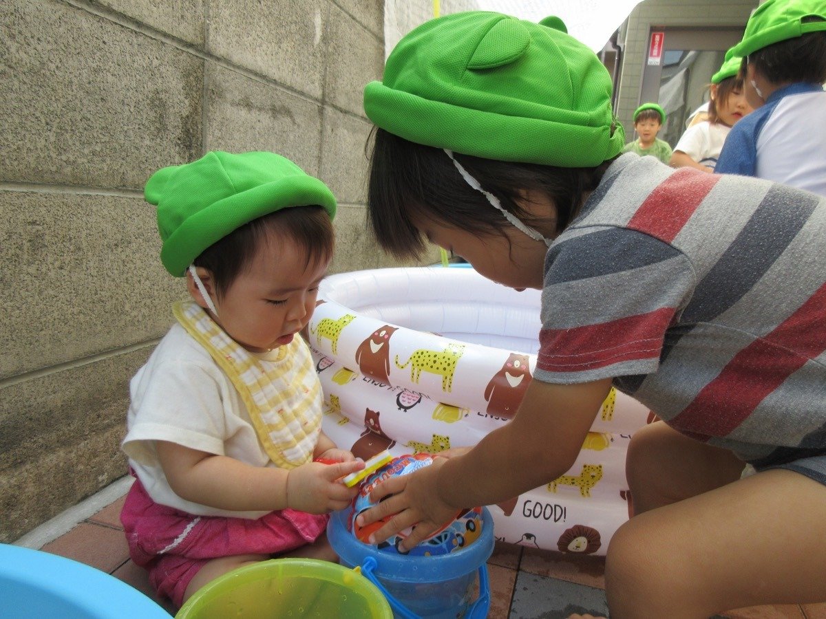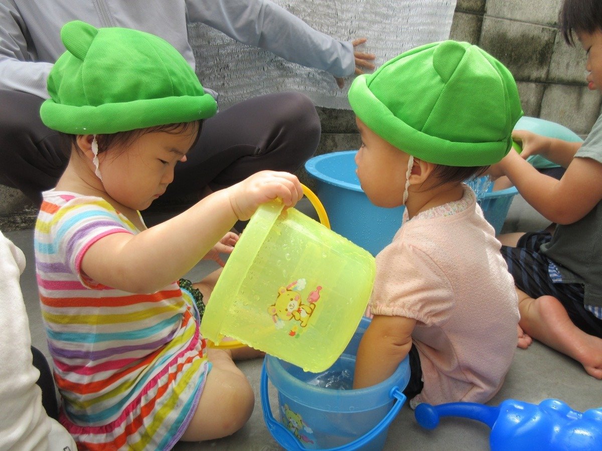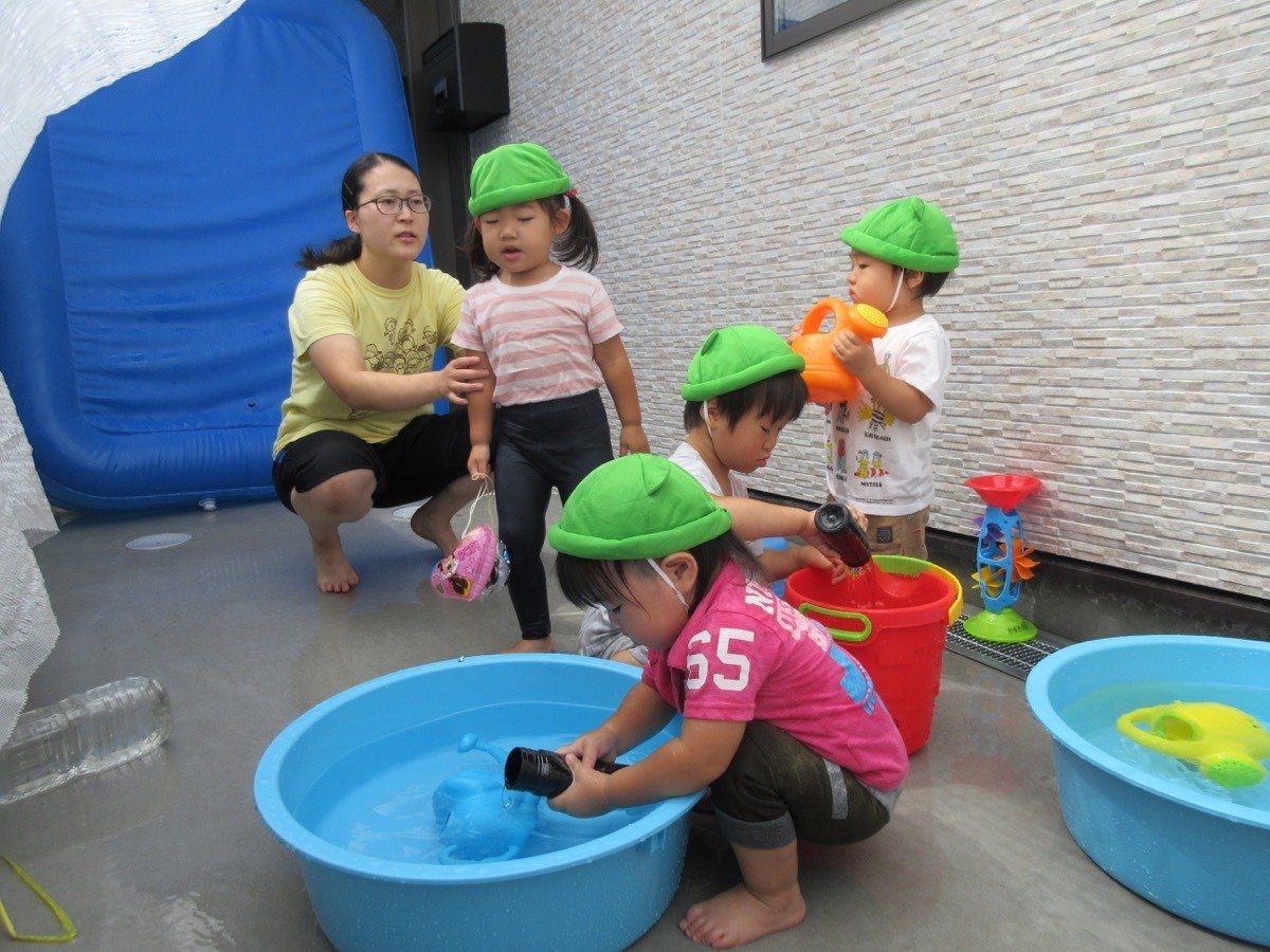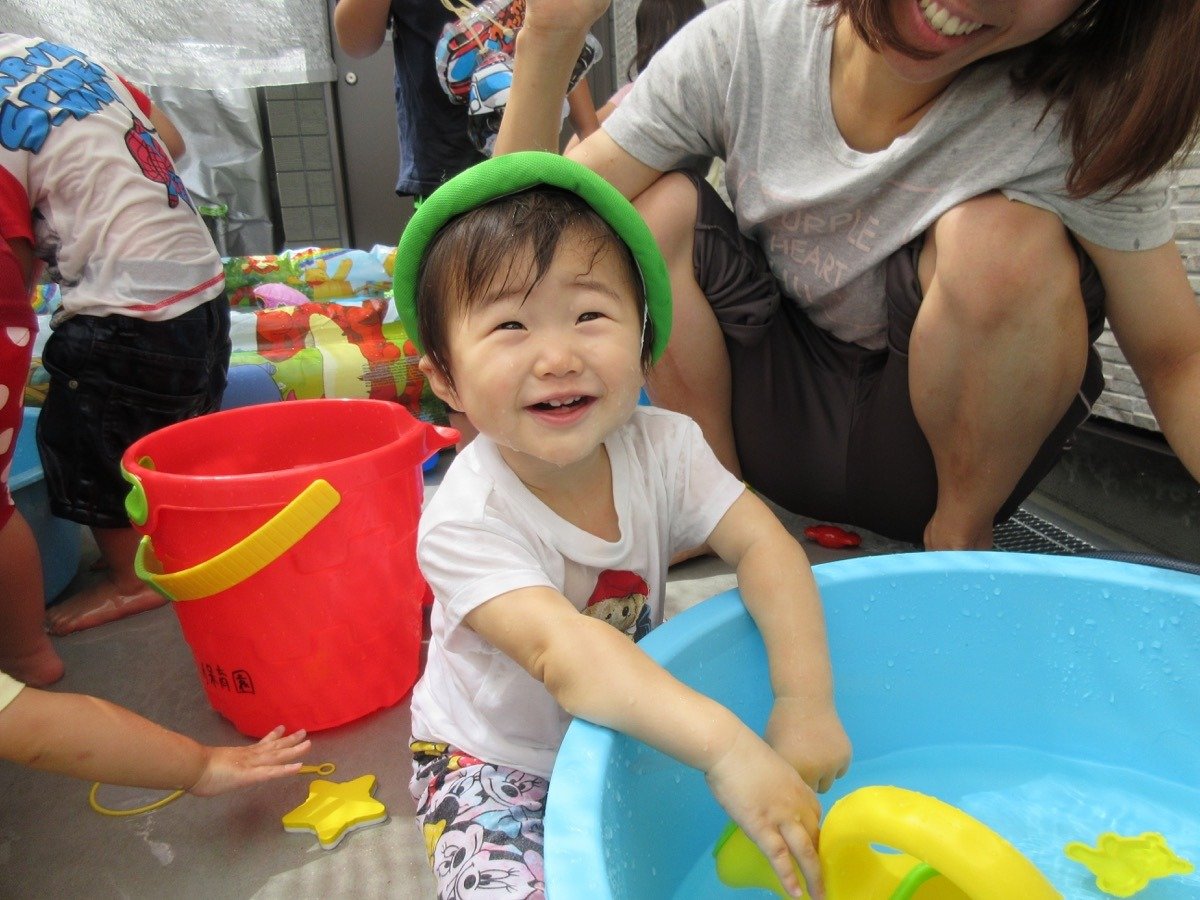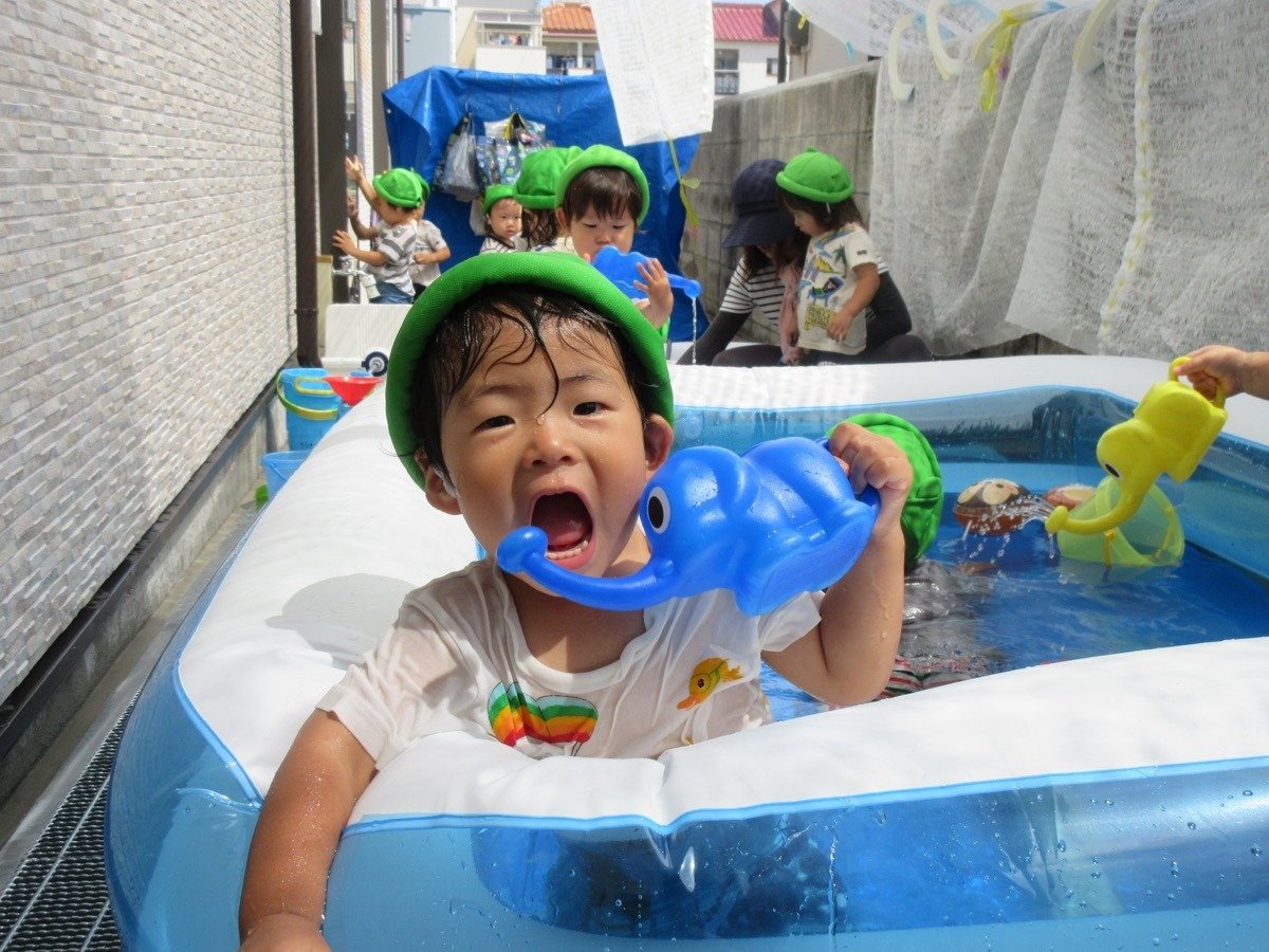 初めは水を怖がっていた子も、少しずつ慣れ、水のかけあいっこを楽しめるまでになりました。