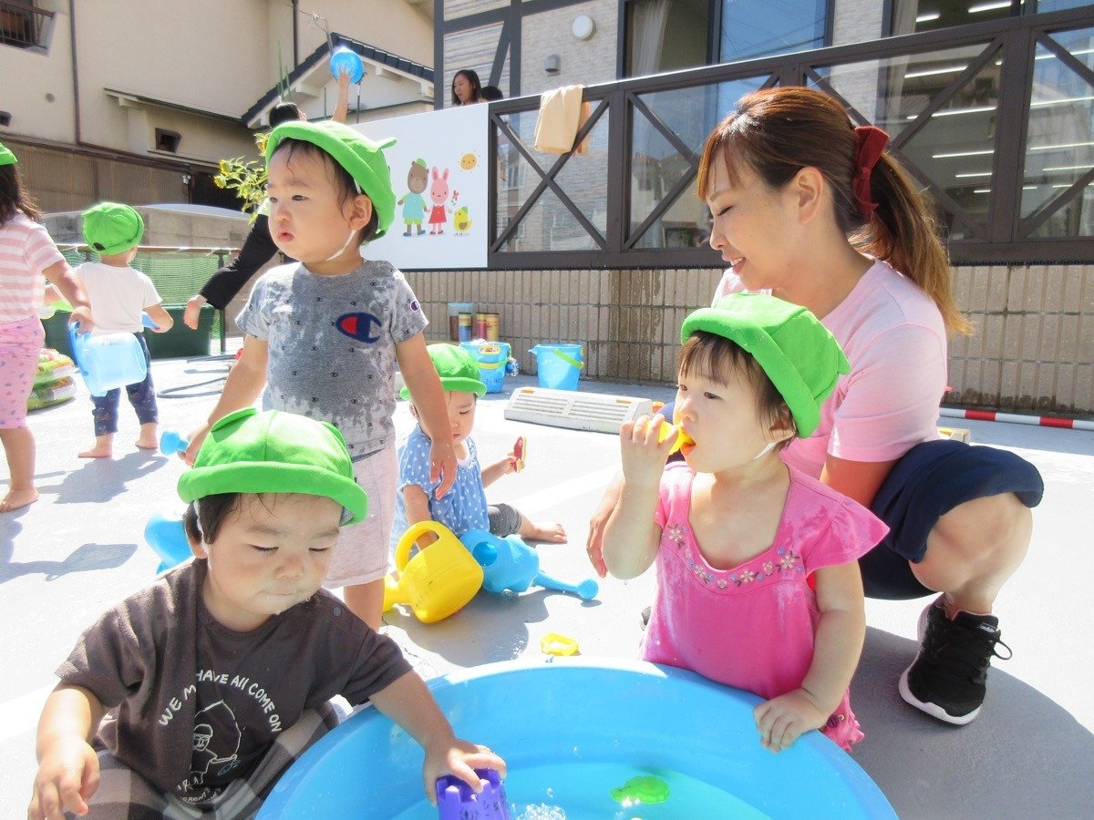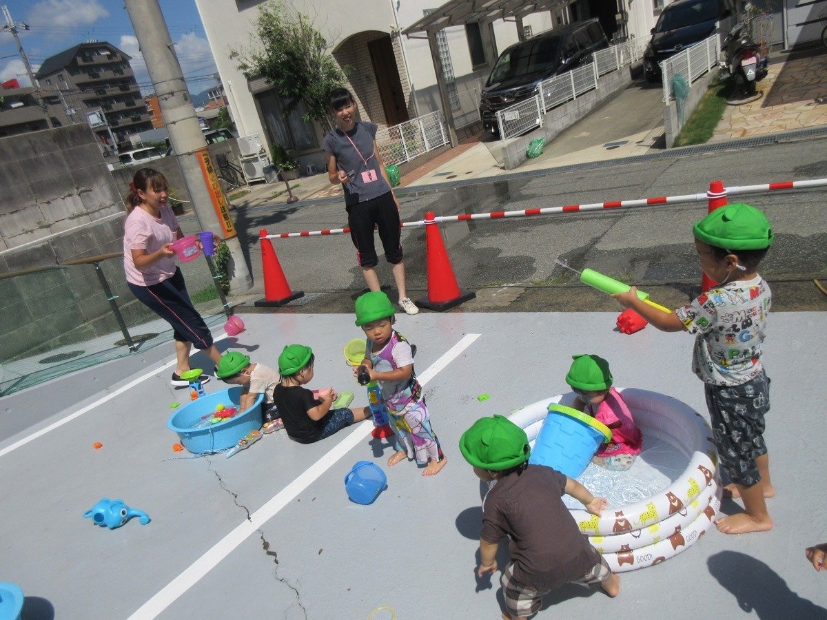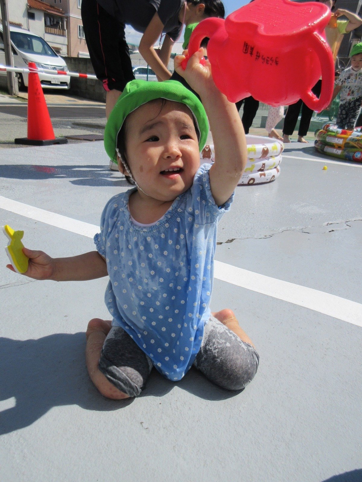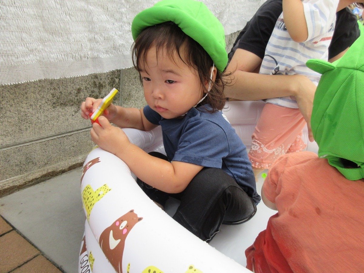 初めは水を怖がっていた子も、少しずつ慣れ、水のかけあいっこを楽しめるまでになりました。