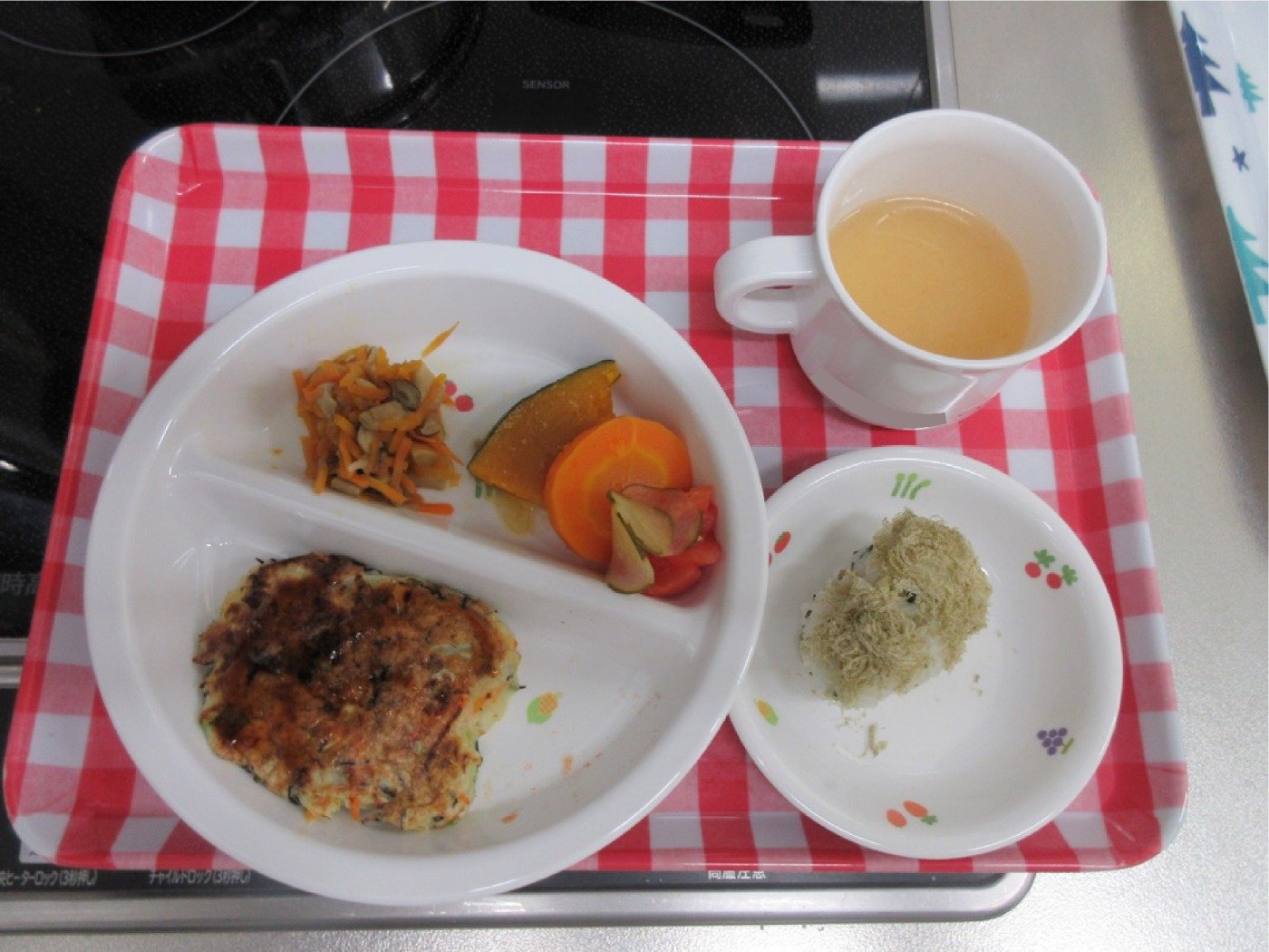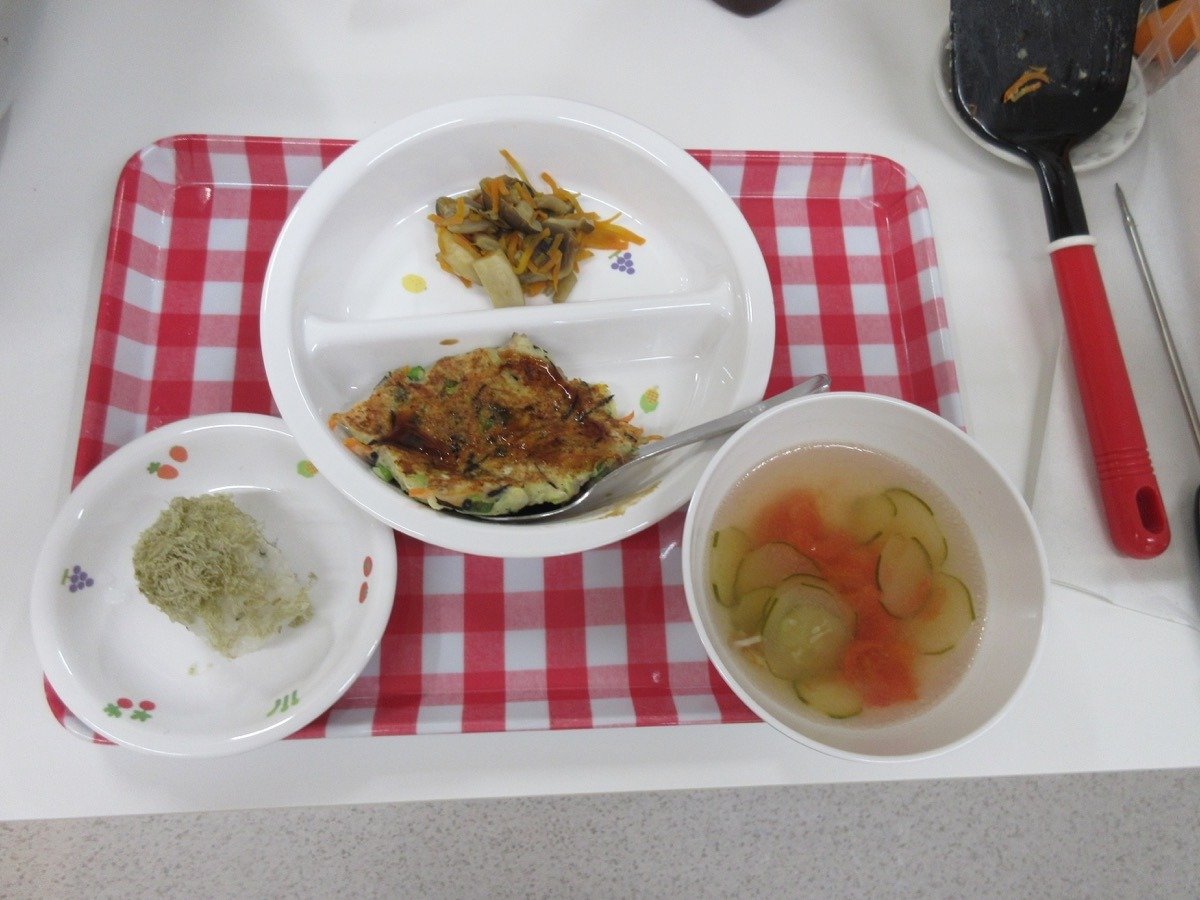 その日の給食は、きのこのソテー、お好み焼き、きゅうりのトマトスープなど登場し