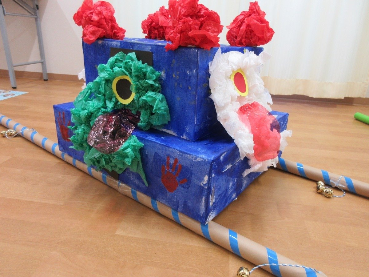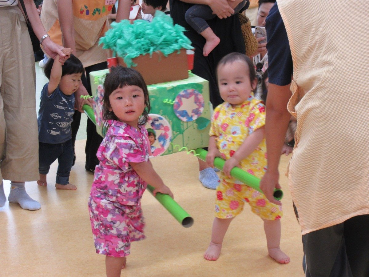 クラスごとの「おみこしわっしょい!」では、子ども達が作ったおみこしを披露しながら、