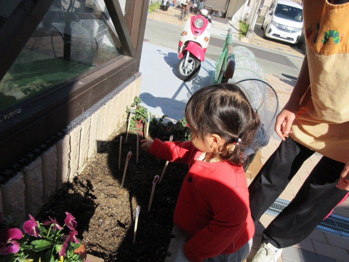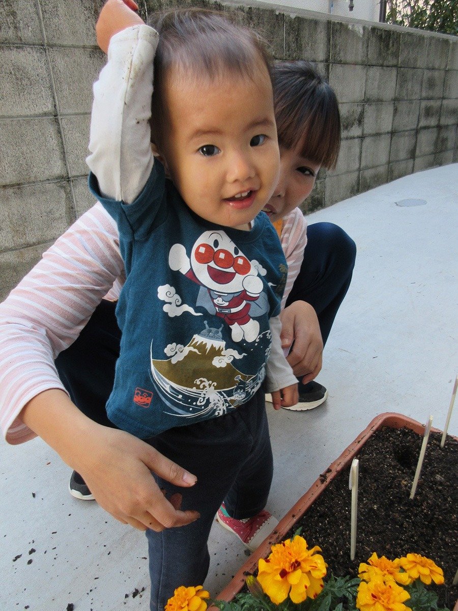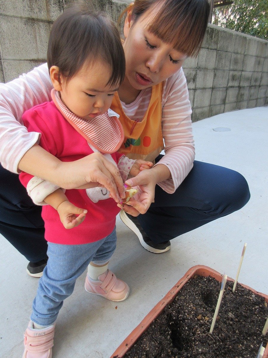 さぁ、球根を持って、1歳児うさぎ組さんは、花壇へ、0歳児ひよこぐみさんは、プランターへ。