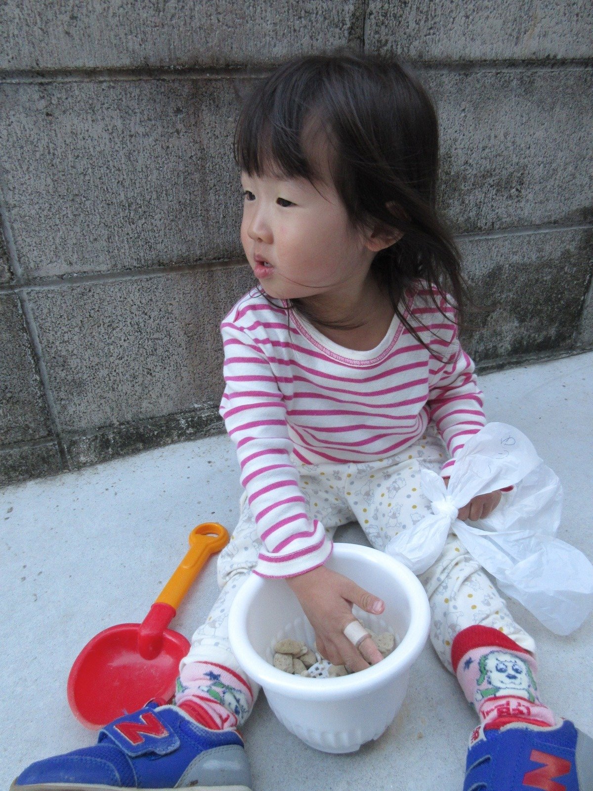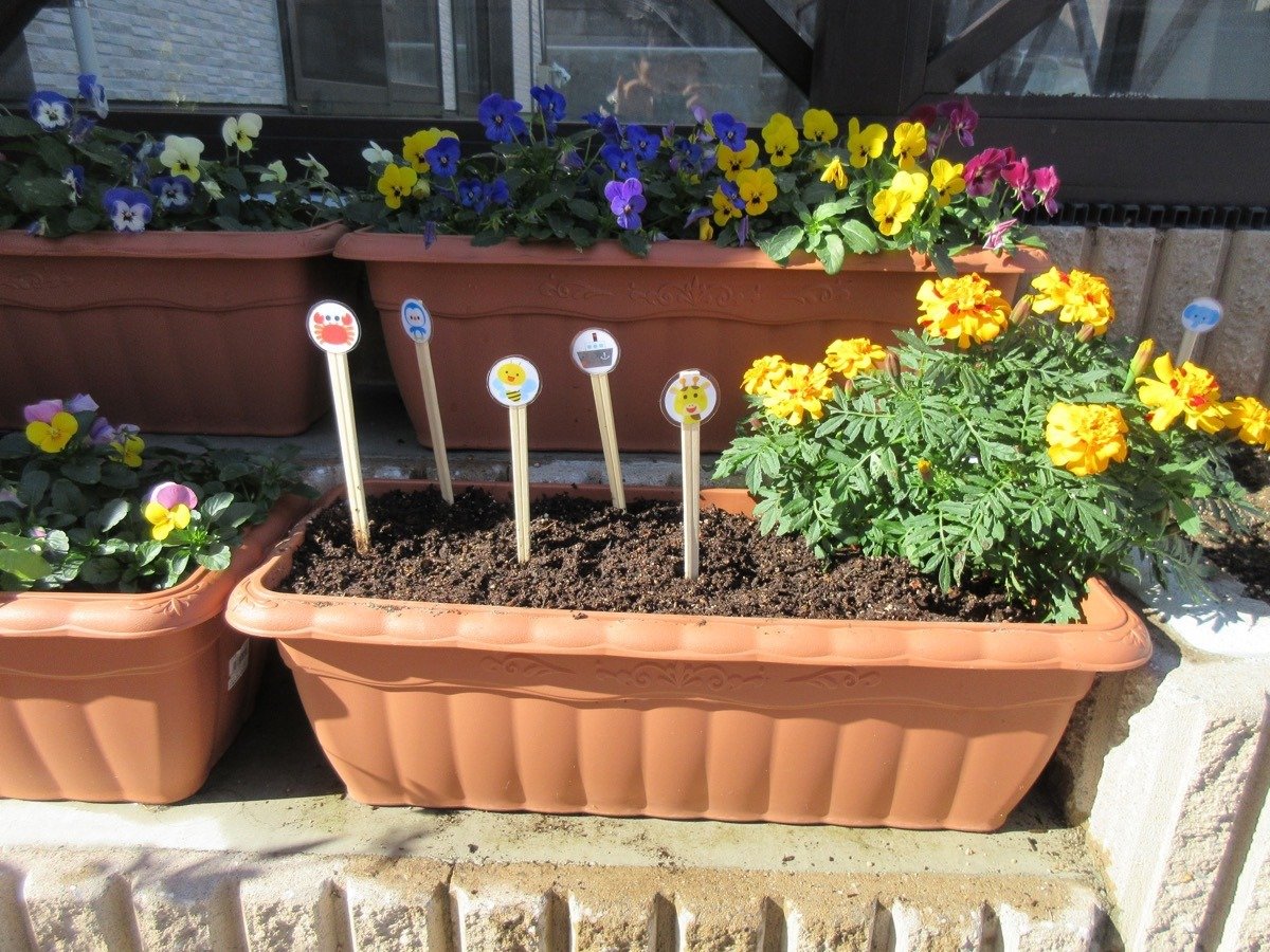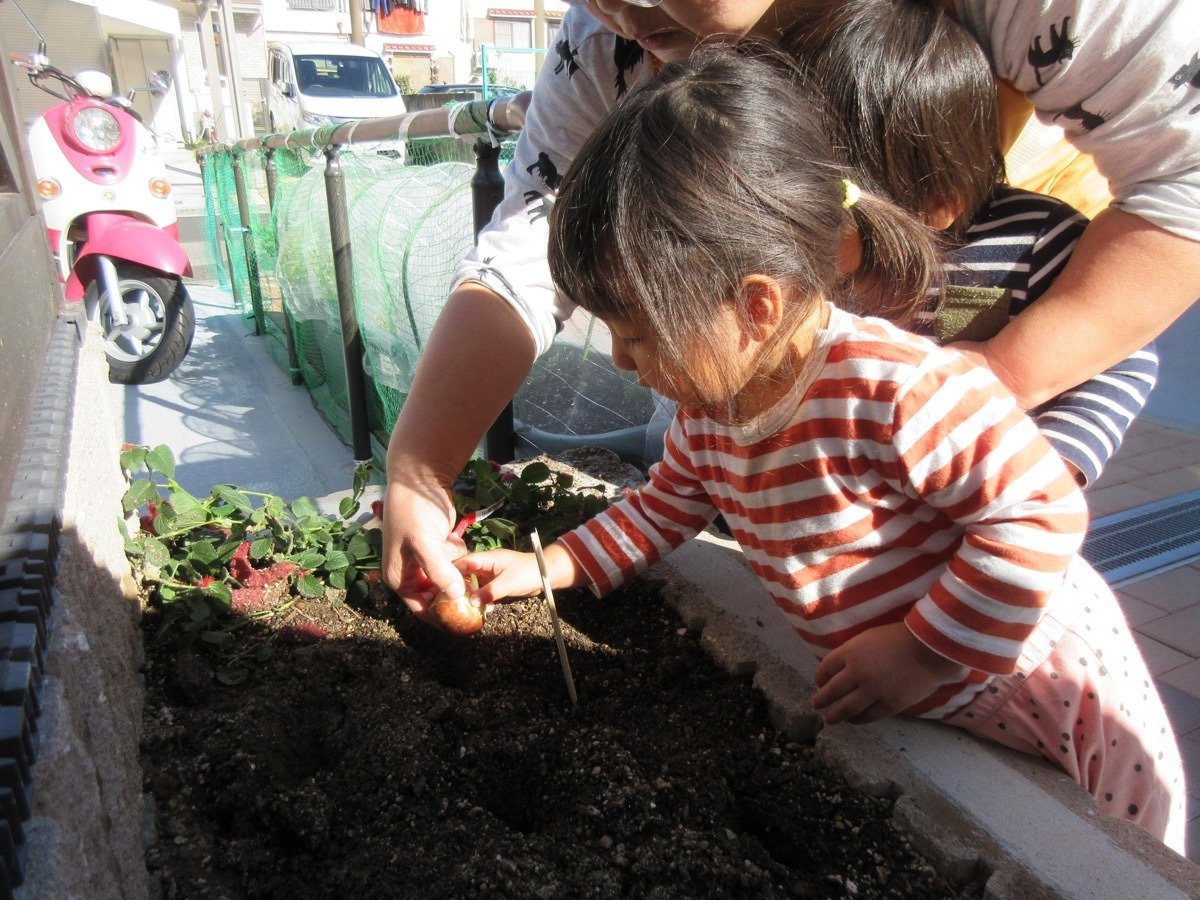 さぁ、球根を持って、1歳児うさぎ組さんは、花壇へ、0歳児ひよこぐみさんは、プランターへ。