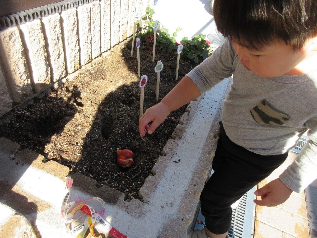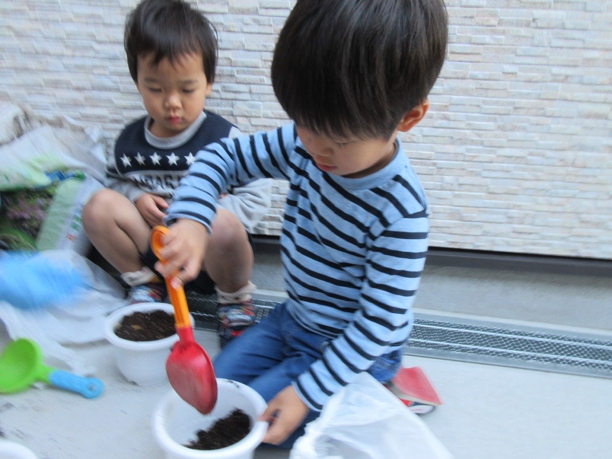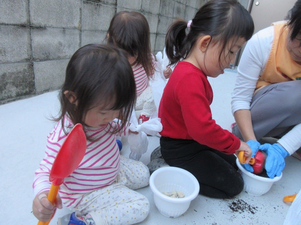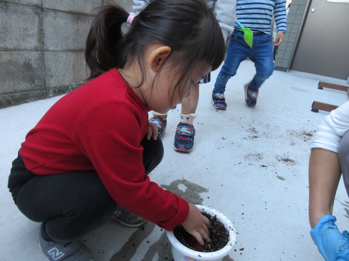くま組さんは、植木鉢に土を入れ、球根を植えましたよ。