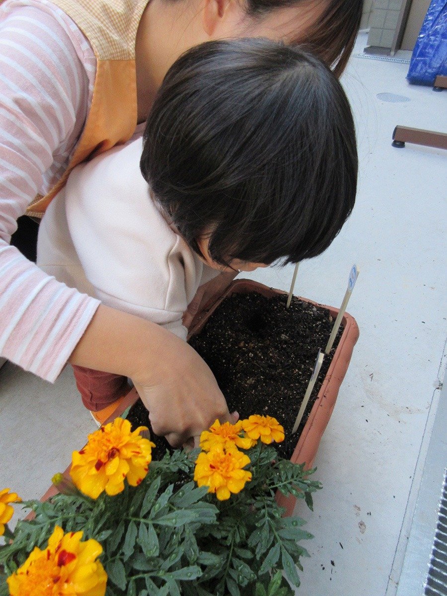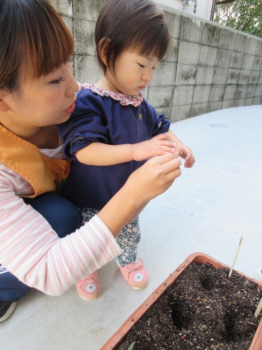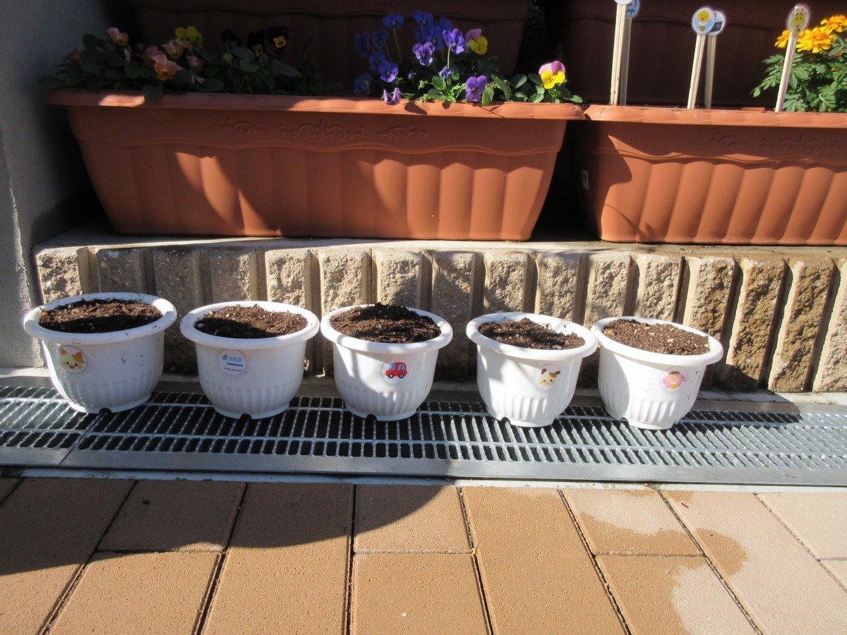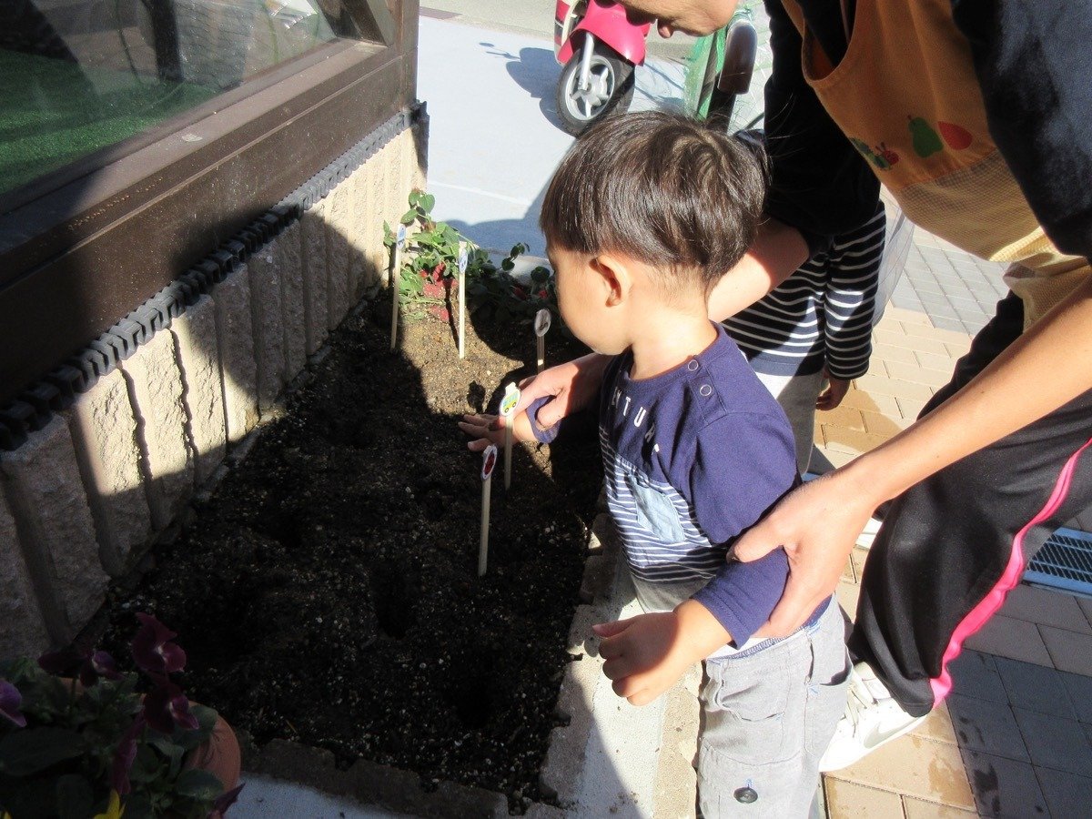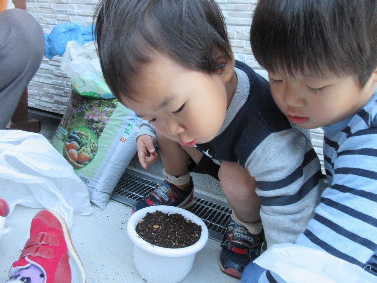 くま組さんは、植木鉢に土を入れ、球根を植えましたよ。