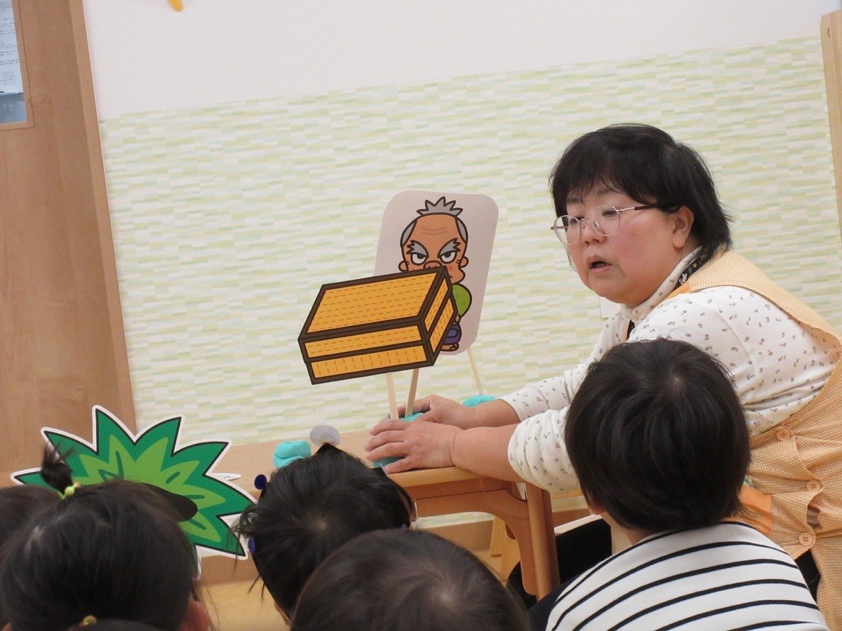 先生からのプレゼントは、「おむすびころりん」のペープサート。