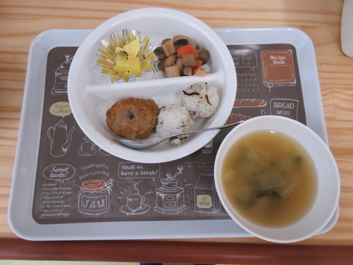 お昼ご飯におにぎりを食べて、アンパンマンビスケットとアンパンマンジュースにご満悦♡