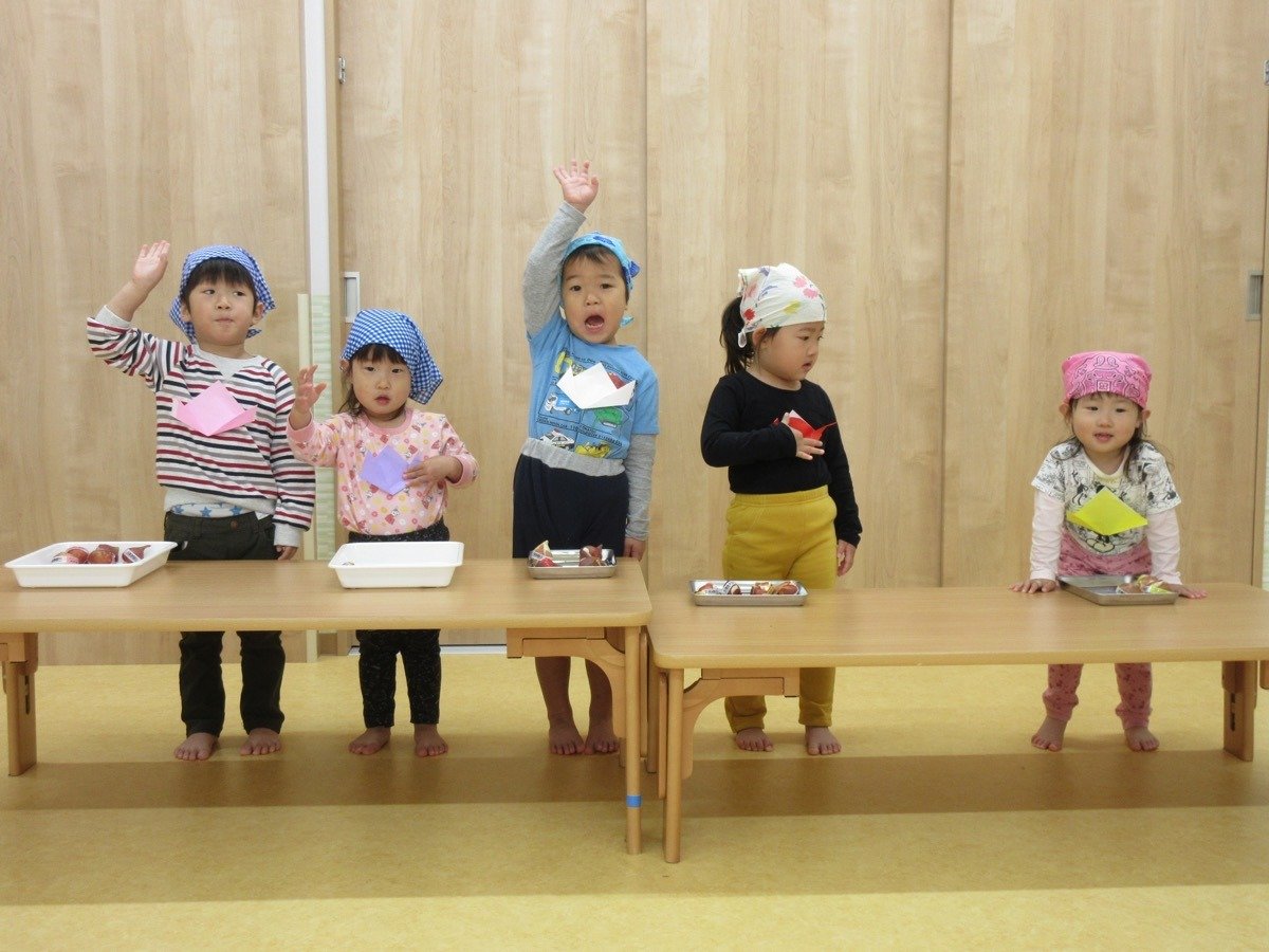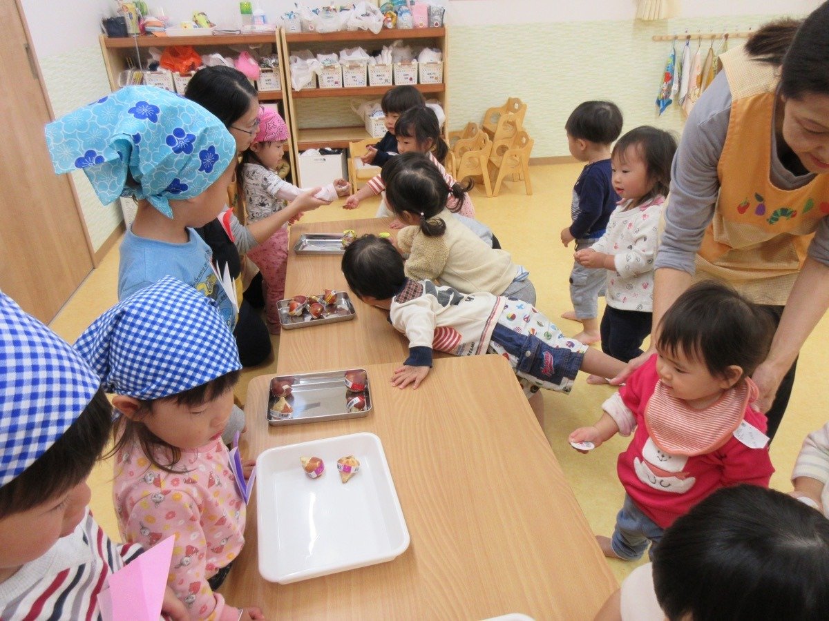 「早く食べたーい!」とばかりに、子ども達は、大急ぎでおやつの準備!