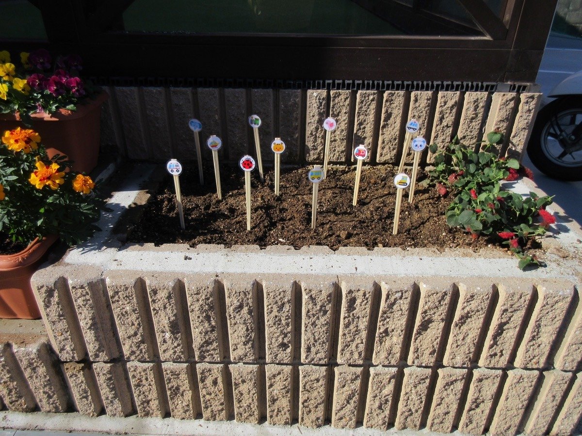 球根のそばに、「僕の、私のチューリップ」が分かるように、マークをつけましたよ。