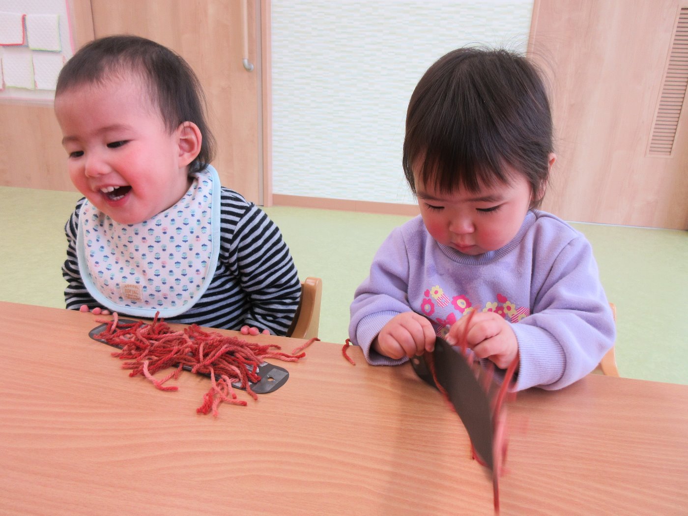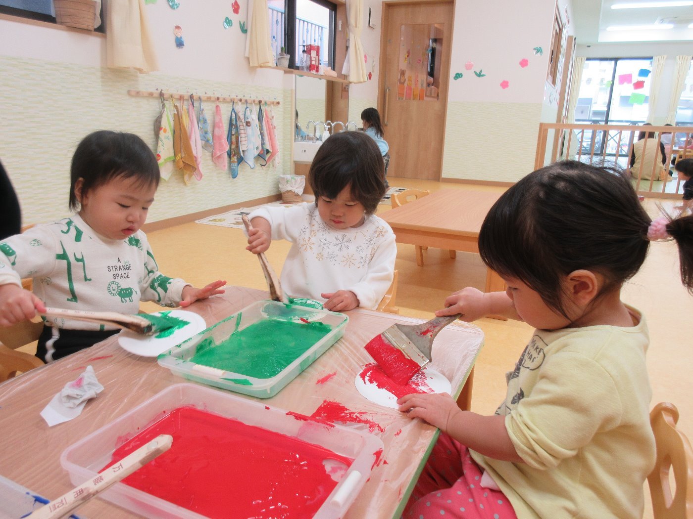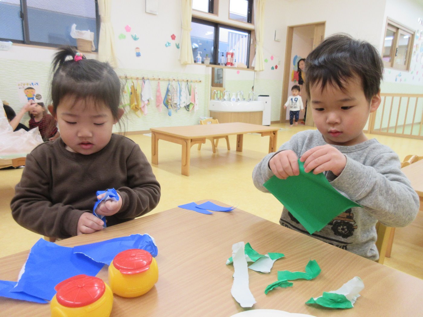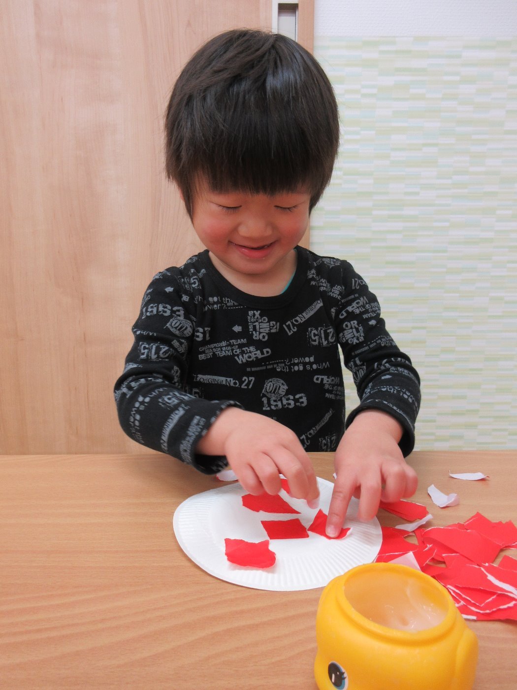 さて、節分に備えて鬼のお面作りをしています。絵の具を使ってペタペタ…。マジックを使ってキュッキュッ…。制作に取り組む姿は真剣そのもの!「できたー!」と嬉しそうに見せてくれる笑顔の可愛いこと♡ お友達と見せ合いっこをしておおはしゃぎ!可愛い姿に思わずほっこり♡
