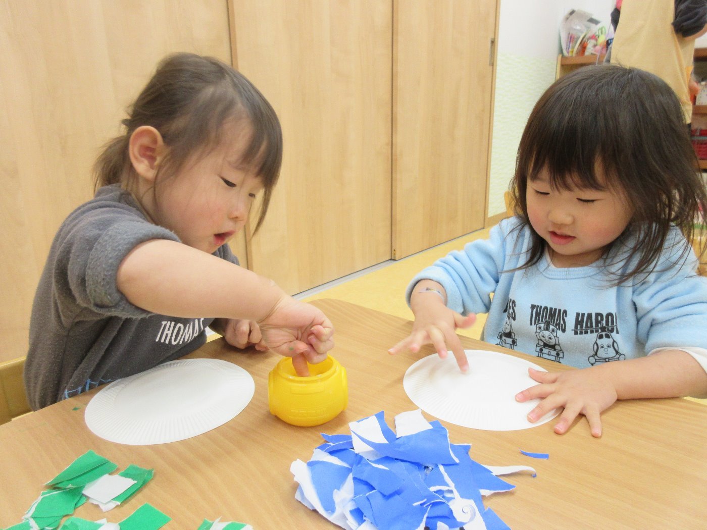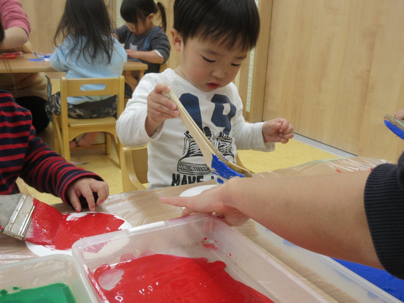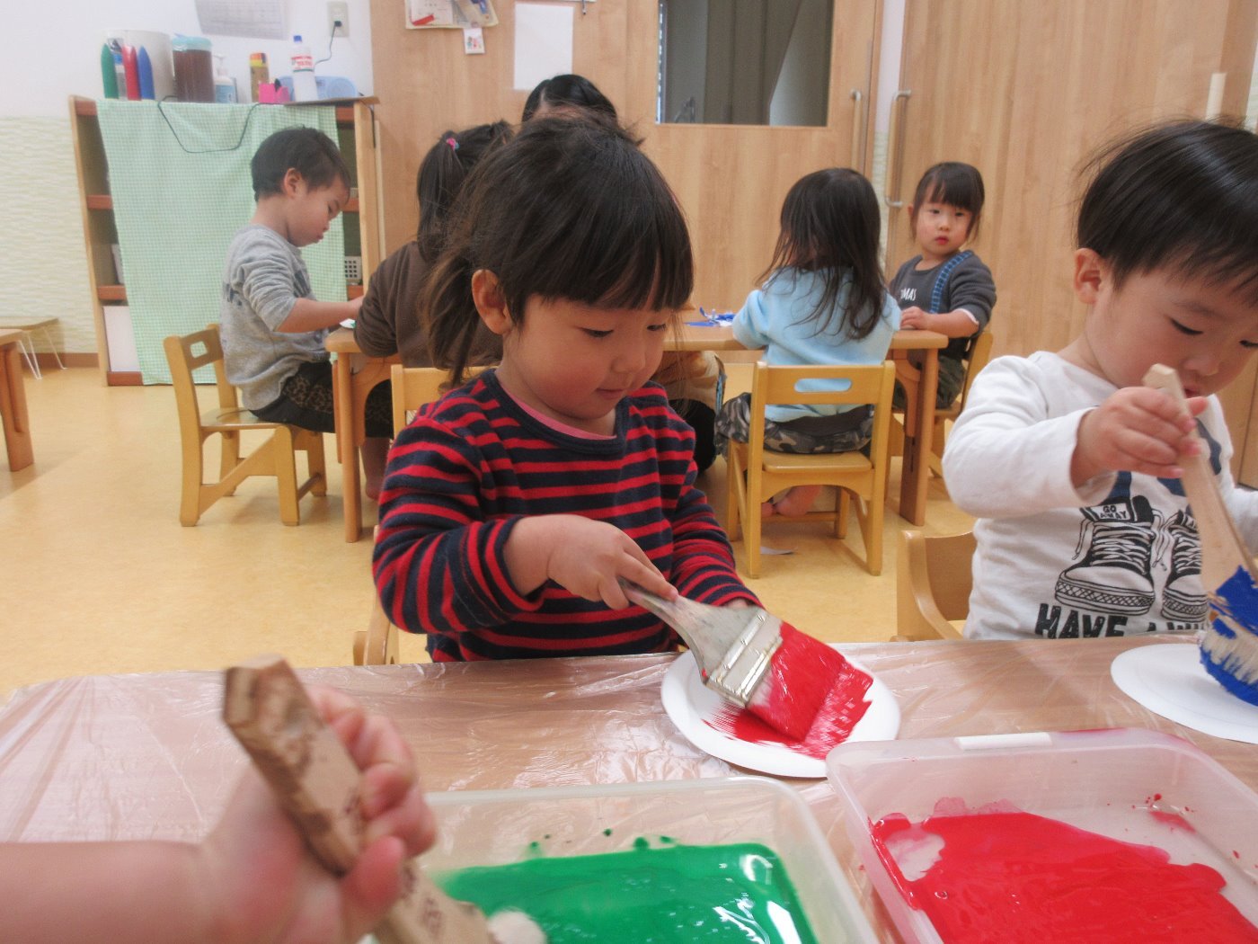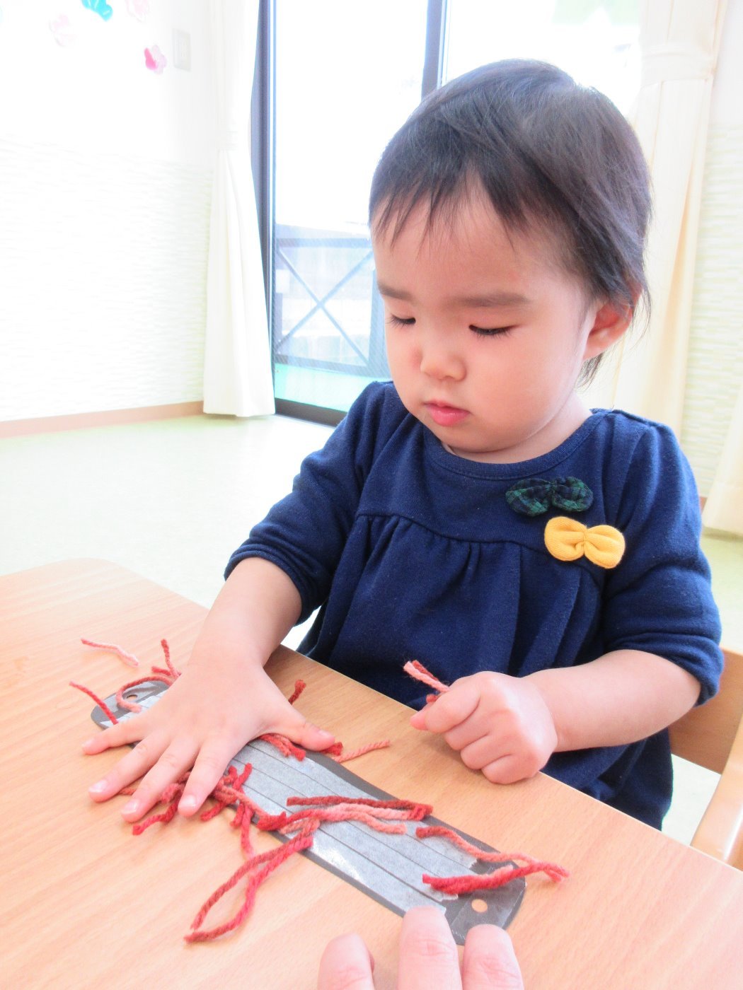 さて、節分に備えて鬼のお面作りをしています。絵の具を使ってペタペタ…。マジックを使ってキュッキュッ…。制作に取り組む姿は真剣そのもの!「できたー!」と嬉しそうに見せてくれる笑顔の可愛いこと♡ お友達と見せ合いっこをしておおはしゃぎ!可愛い姿に思わずほっこり♡