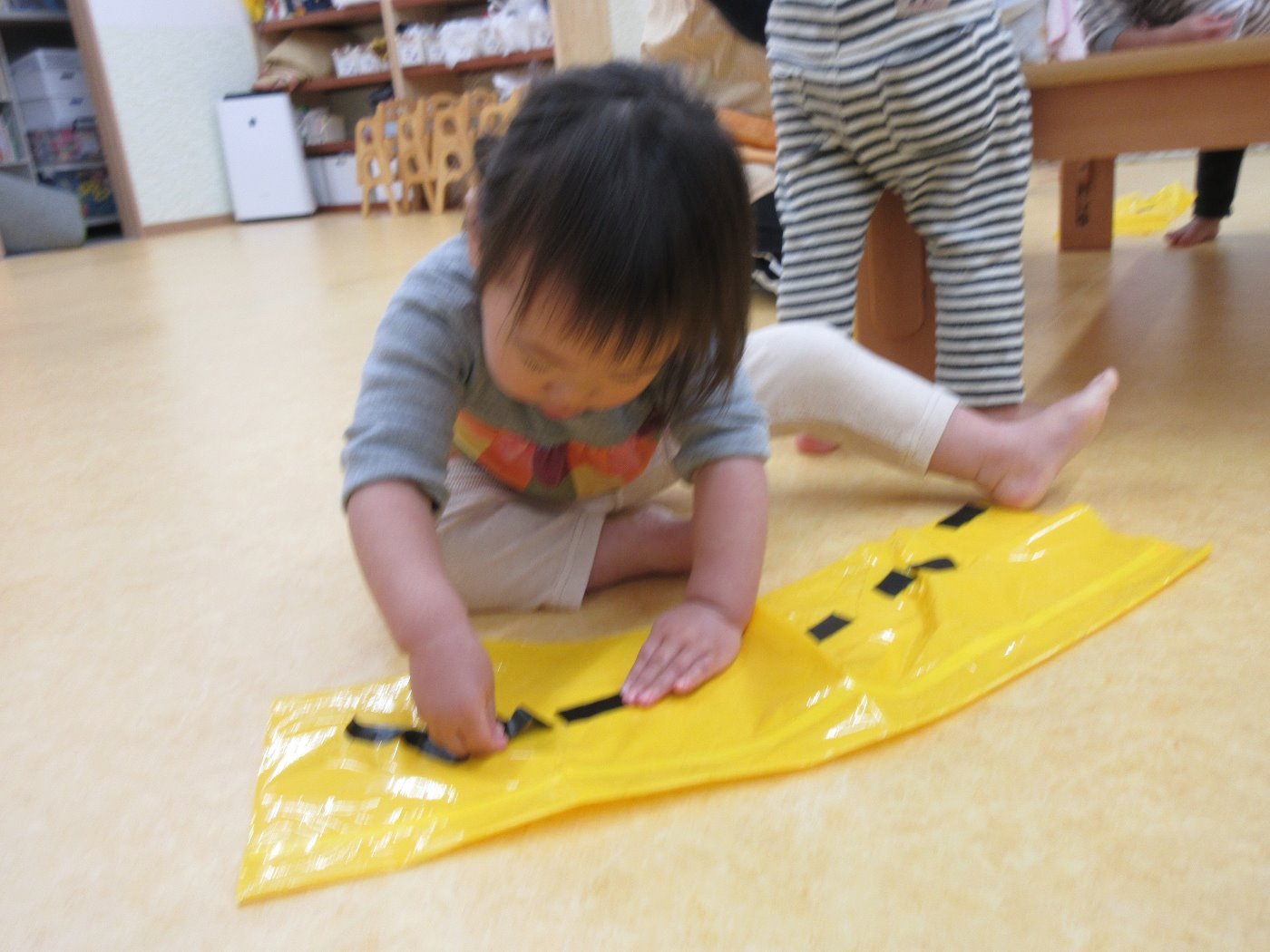 投げる練習!鬼役の保育士が豆に驚いた顔をすると、「きゃははは~」と嬉しそう!「鬼が来たら