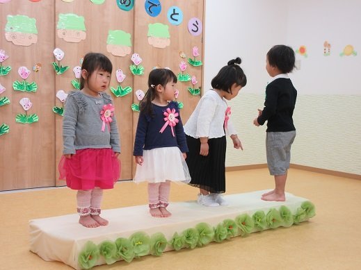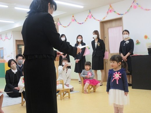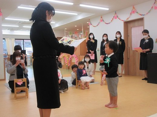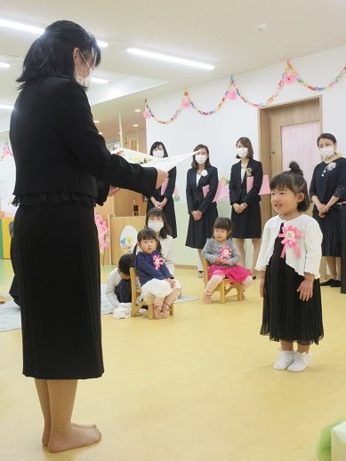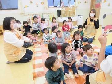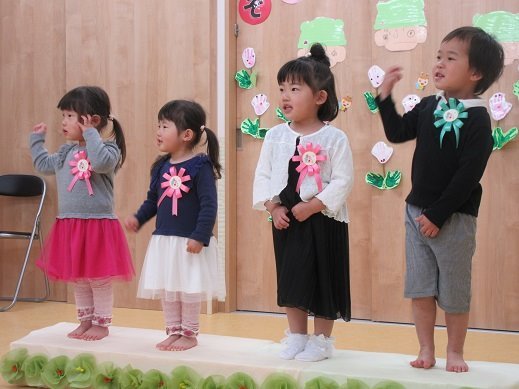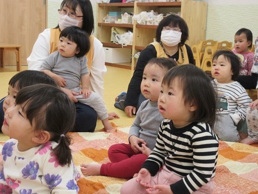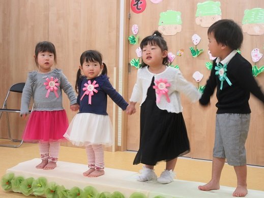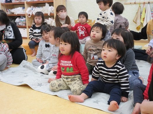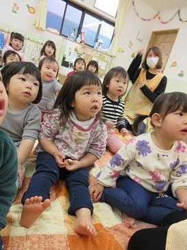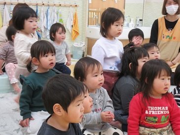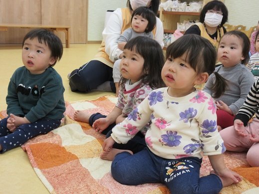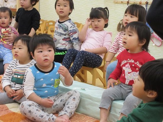 お楽しみのお話は、みんなの好きな「アイスクリーム屋さん🍧」イチゴアイスが、ぶたさんに変身したり、チョコレートアイスがタヌキさんだったり…と、次は何かな?のワクワクがいっぱいのお話でしたよ♪ みんなとても落ち着いて集中して見ていました💮 1年前を思い出すと、大きな成長ぶりにジーン(´;ω;`) 大きくなったなぁ… ひとつひとつの行事が今年度の終わりを告げていきます。