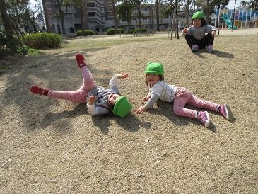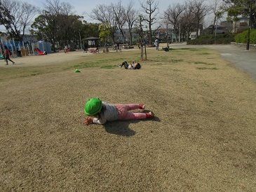 芝生だらけになって遊び始めると、みんなもコロコロ転がり始めてキャハキャハ大笑い(*´▽`*)