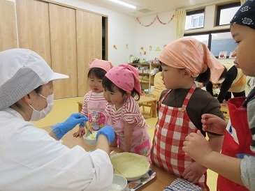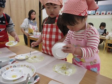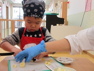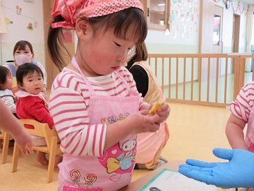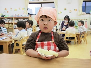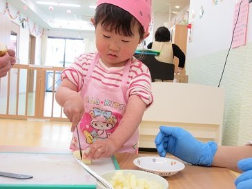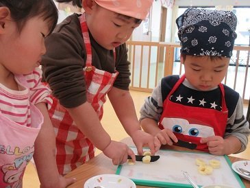 給食の先生に教えてもらいながら、慎重にバナナを切り切り…できた♪ お母さんみたいね!