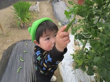 可愛いエンドウ豆をR君が喜んで収穫!収穫後はビニールシートの上に丁寧に並べていましたよ♪